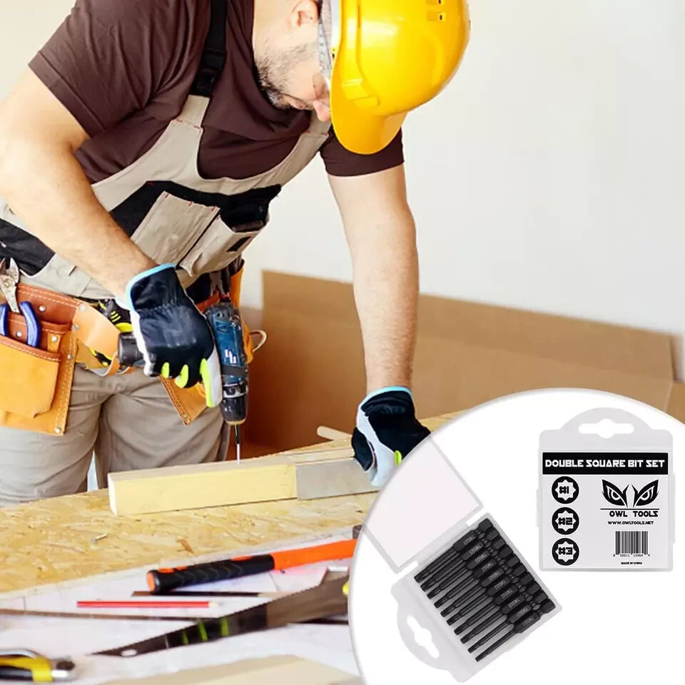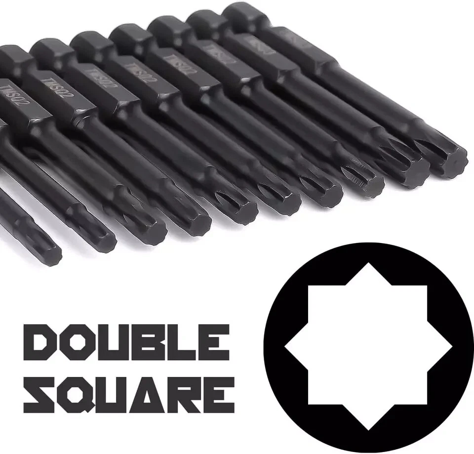 Double Square 8 Point Star Bit Set (10 Pack - 2.3" Long Magnetic Heads) 2 Square Drive Torx Bits in the following Sizes #, 2, and #3 Description Item model number Double-Square-10Pack Part Number Double-Square-10Pack Batteries Required? No Finish Painted Number of Pieces 10 Item Package Quantity 1 Material S2 Steel Drive System Star, Torx, Square Item Weight 4.6 ounces Batteries Included? No Item Length 2.3 Inches Finish Type Painted Size DOUBLE SQUARE 10 PACK OF DOUBLE SQUARE DRILL BIT SET - In the Following Sizes: #1 (2 in Set), #2 (6 in Set), and #3 (2 in Set). These are commonly called Double Square, 2 Square, 8 Point Star Bits, or 8 Point Torx Bits CONVENIENT PLASTIC STORAGE CASE - Our 8 Point Torx Drill Bits Come in a Durable Locking Plastic Storage Case for Easy Storage INDUSTRIAL GRADE S2 STEEL WITH MAGNETIC TIPS - Our Drill Bits Are Made From High Quality S2 Steel Material in a Beautiful Black Finish. Also Each Drill Bit is Labeled with it's Double Square Bit Size. 2 SQUARE BIT SET ARE PERFECT FOR SO MANY USES - Double Square Bits Are Commonly Found on Appliances, Air Conditioners, Printers, Deck Screws, Dirt Bikes, Chainsaws, Auto Parts, Computers and Other Electrics, and So Many Others. LIFETIME GUARANTEE - Here at Owl Tools (USA Based Company) we only care about your satisfaction. We try our best to ensure each product is in perfect condition before you get it, but if something is not up to your satisfaction, please contact us for a full refund or replacement.