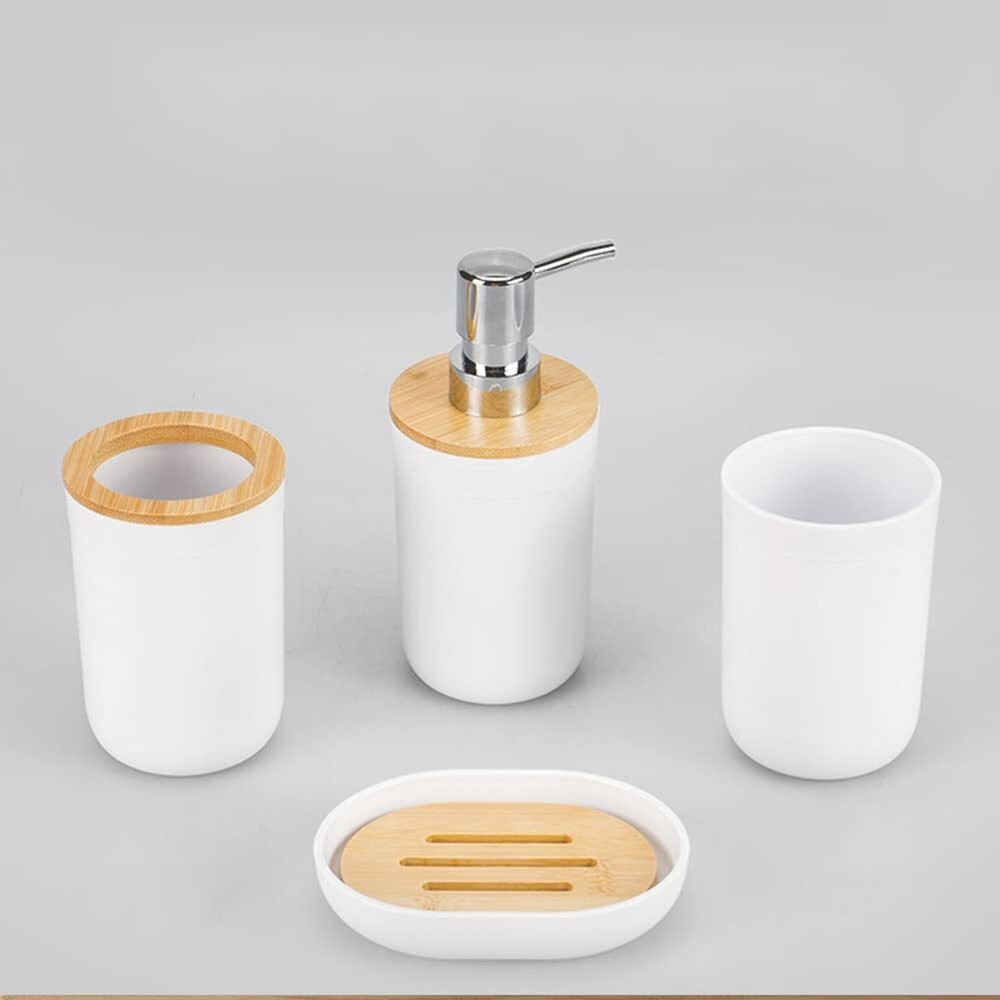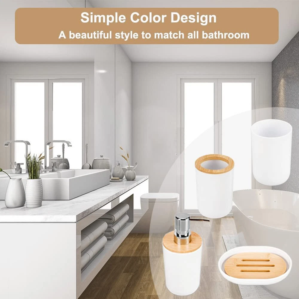 Bathroom Accessories Set, Set of 8 Piece Plastic Gift Set Toothbrush Holder,Toothbrush Cup,Soap Dispenser,Soap Dish,Toilet Brush Holder,Trash Can,Cotton Swab can for Bathroom (White bamboo-8pcs) [Great for Your Buck.]:Great value Bathroom Set Includes: 2 Cotton swab can,1 Soap Dispenser, 1 Soap Dish,1 Toothbrush Holder, 1 Toothbrush Cup, 1 Toilet Brush Holder, 1 Trash Can. [Beautiful and Elegant Design]:Take your bathroom decor to stylish new heights with this bathroom accessories set.It is cute, classy and stylish.You can go wrong with this set ever. [Sturdy And Amazing Quality]:This 8-Piece Bathroom Accessory Set is made of durable plastic.Its a solid set, looks good and it very light but it feels sturdy.Each item is standard sizes. [Easy to Assemble and Clean]:Bathroom accessories set with trash can were easy to assemble and clean up after usage.It's a perfect combo set for the bathroom. [Blend Themed Bathroom]:They are perfect for a college apartment,guest bathroom,son’s personal bathroom.This bathroom essentials also could blend beautifully many kinds of themed bathroom,such as mermaid themed bathroom.Excellent for a House-warming gift. [Set Includes]:1 Soap Dispenser, 1 Toothbrush Holder, 1 Toothbrush Cup, 1 Soap Dish, 1 Toilet Brush Holder, 1 Trash Can, 2 Cotton swab can. Shipping We offer FREE shipping on all orders! We ship within Three business days of payment, usually sooner. We use a selection of shipping services such as UPS, FedEx, USPS etc., unable to choose a carrier. We only ship to the lower 48 states, no APO/FPO addresses or PO Boxes allowed. Sellers generally can’t change the shipping address that you provided at checkout. Local pickups and combined shipping options are not provided at this time. International buyers - please note: Import duties, taxes, and charges aren't included in the item price or postage cost. These charges are the buyer's responsibility. Return You can return a product for up to 30 days from the date you bought it by using the seller's FREE RETURN LABEL only. Any product you return must be in the same condition you received it and in the original packaging. International buyers - Rejection and return of the product requires the buyer to pay all shipping and return costs. Please return with the reason "Order mistake" or "Changed my mind" or "Does not fit" for a refund, which would be greatly appreciated. If the buyer wishes to return the items for a refund or replacement, please contact the seller to obtain a free return label. The refund or replacement will be processed using the tracking number of the return label, which will be provided solely by the seller. Other methods of return that have not been approved by the seller will not be processed for a refund or replacement. Payment We accept payment by any of the following methods: eBay Manage Payment Please pay as soon as possible after winning an auction, as that will allow us to post your item to you sooner! Feedback Customer satisfaction is very important to us. If you have any problem with your order, please contact us and we will do our best to make you satisfied. Please be aware that our products are stored and fulfilled by third-party warehouses and manufacturers across the United States (also known as third-party fulfillment or product sourcing). These companies are completely trustworthy, and we are confident in entrusting all of our valuable items to them for the safety and best delivery system for our store. Contact Us If you have any queries, please contact us via ebay. We usually respond within 24 hours on weekdays. Please visit our eBay store to check out other items for sale! Thank you for shopping at our store.