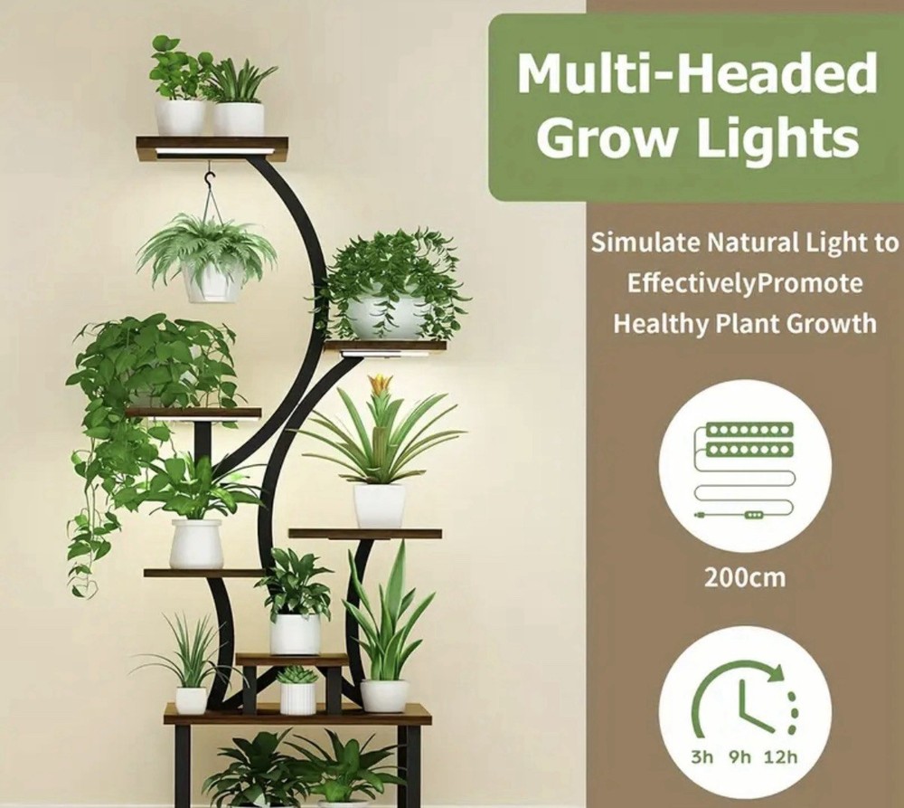 This product is an 8-tier plant holder or storage unit with added lights, providing a cute and unique display for plants or storage items. The design allows for multiple levels of organization while also adding a charming touch to any room. With the ability to showcase plants or storage items in a creative way, this product offers both functionality and aesthetics for home or office decor.