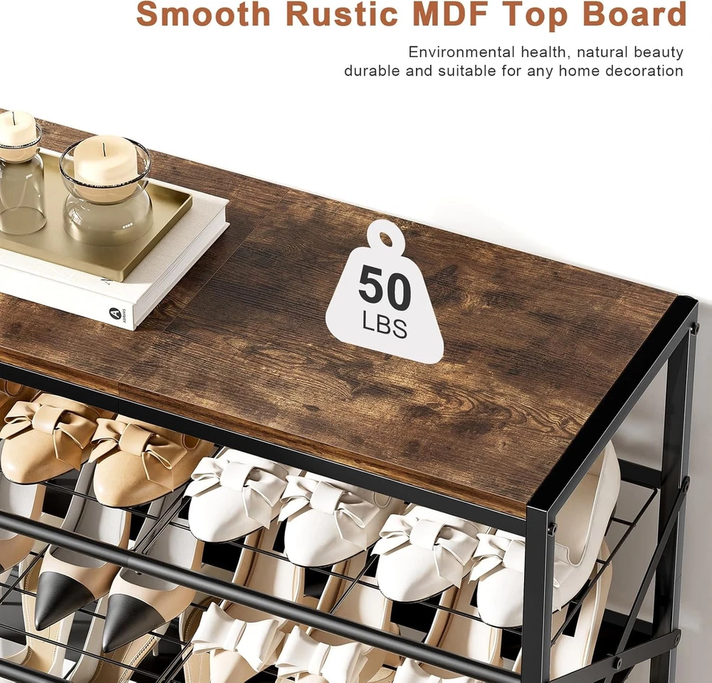 8-Tier Tall Shoe Rack Organizer Storage for 8-tier, Rustic Brown Product Details Room Type: Closet Entryway Number of Shelves: 8 Special Feature: Trees Product Dimensions: 11.2"D x 27.8"W x 52"H Style: Modern Age Range (Description): ALL Finish Type: Lacquered Brand: UNITSTAGE Product Care Instructions: Wipe with Dry Cloth Size: 8-tier Weight Limit: 3E+1 Pounds Assembly Required: Yes Recommended Uses For Product: Storing and organizing shoes in entryways, closets, garages, bedrooms, cloakrooms, dormitories, and living rooms Number of Items: 1 Manufacturer: UNITSTAGE Included Components: Assembly Tools Model Name: 8-Tier Tall Shoe Rack Organizer Furniture Finish: Wooden Installation Type: Freestanding Min. Required Door Width: 11.2 Inches Weight capacity: Maximum weight: 3E+1 Pounds Specific Uses For Product: Shoes, Photos, Keys, Bags, Decorations, Books, Greenery, Flowers, Artistic Works, Storage Unit Count: 8.0 Count Product Name: shoe rack Item Weight: 18.28 pounds Country of Origin: China MaterialMounting Type: MetalFloor Mount Shelf TypeShape: MetalRectangular Capacious and thoughtful Shoe Rack:The front door shoe rack sizes 27.8"L x 11.2"W x 52.0"H . This tall shoe rack boasts 7 storage shelves and 1 top shelf for 24-32 pairs of shoes, making it competent to store shoes of whole family.The metal shoe organizer is equipped with 2 iron sheets, so that the high heels can be smoothly placed on them. If you have tall shoes, you can remove a shelf Reliable Shoe Organizer:The wooden shoe rack for front door entrance is built with quality particleboard and metal, strong and bearable. The top panel can undertake 50 lb and each floor 30 lb. The side X-shaped design offers doubled enhancement for overall stability Multi functional shoe rack:The top shelf of this shoe storage organizer can house your photos, keys, bags, or decorations.Besides its original role of storing shoes, this metal shoe rack can be a display stand of books, greenery, flowers and artistic works in the living room, bedroom, office etc. powerful, practical and all-match Easy to assemble:The tall shoe rack has a simple structure and all accessories have been numbered in order. With detailed assembly instructions and necessary tools, the assembly can be completed without too long and can be quickly put into use Thoughtful Shoe Shelf: The combination of retro-finished panel and black mesh frame represents the industrial style. The multi-level design effectively stores your shoes with protection, beautiful and practical
