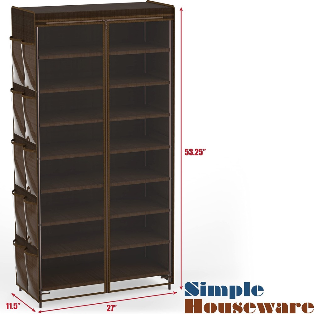 Simple Houseware 8 Tiers Shoe Rack with Zipper Cover | Side Hanging Pockets, Brown Room Type Dorm Room, Closet, Bedroom Number of Shelves 8 Special Feature Zip Cover, Dust Proof Product Dimensions 11.5"D x 27"W x 53.3"H Style Minimalist Age Range (Description) Adult Finish Type Brown Brand Simple Houseware Product Care Instructions Wipe with Dry Cloth Weight Limit 60 Pounds 8-Tier Shelf: stores up to 24~32 pairs of shoes and hanging side pockets for 5 pairs more Zipper Cover: clear cover avoid dust while easy to see you shoes Sturdy Construction: metal tube frame with washable 600D polyester fabric to build 8 tier fabric shelves. Great solution to keep your entryway, closet, dormitory, patio, mudroom and garage away from mess. Dimension: 11''D x 27''W x 53.3''H Great shoe storage to keep your entryway, closet, dormitory, patio, mudroom and garage organized Easy Assembly Personalized Storage: you can remove the panel to build into a 5-tier or 3-tier shoe rack to fit different kind of shoes, like boots, tall sneakers Simple Houseware 8 Tiers Shoe Rack with Zipper Cover | Side Hanging Pockets, Brown Shipping We offer FREE shipping on all orders! We ship within Three business days of payment, usually sooner. We use a selection of shipping services such as UPS, FedEx, USPS etc. We only ship to the lower 48 states, no APO/FPO addresses or PO Boxes allowed. Local pickups and combined shipping options are not provided at this time. Return You can return a product for up to 30 days from the date you purchased it. Any product you return must be in the same condition you received it and in the original packaging. Please keep the receipt. Payment We accept payment by any of the following methods: PayPal Please pay as soon as possible after winning an auction, as that will allow us to post your item to you sooner! Feedback Customer satisfaction is very important to us. If you have any problem with your order, please contact us and we will do our best to make you satisfied. Contact Us If you have any queries, please contact us via ebay. We usually respond within 24 hours on weekdays. Please visit our eBay store to check out other items for sale! Thank you for shopping at our store.