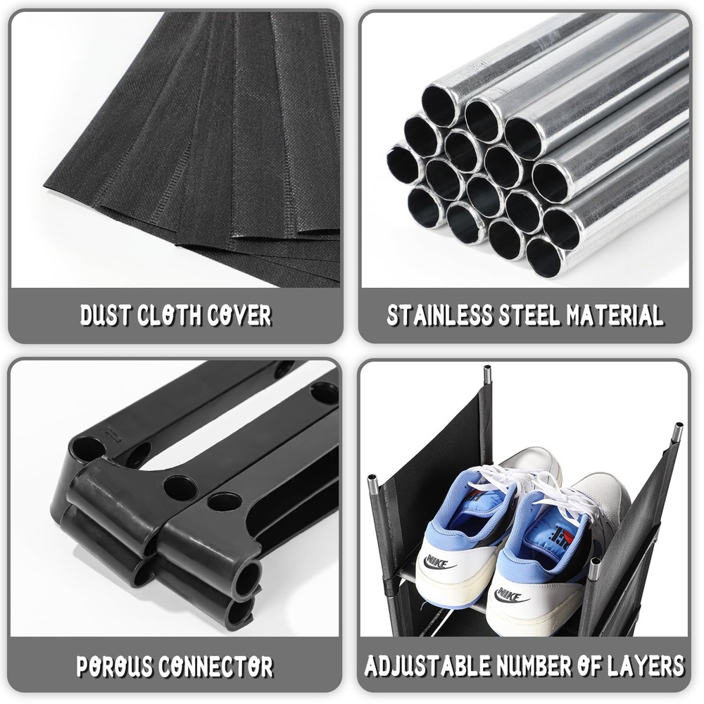 Tall Narrow Shoe Rack for Front Door Entrance Vertical Shoe Rack for Small Spaces Slim Shoe Organizer for Entryway Shoe Tower Skinny Shoe Shelf for Closet Vertical shoe rack: Open shoe rack for your shoes to provide convenient storage, single-layer vertical design, effectively save space. It is ideal for narrow Spaces such as room entrances, wardrobes, dormitories, living rooms and bedrooms Flexible assembly:Our shoe racks are assembled flexibly and can be stacked or placed in a single layer to meet your specific needs. One pair of shoes can be placed on each layer,which helps you to sort different types of shoes Easy installation:The shoe rack is easy to install and easy to disassemble,you can freely assemble and can also be reused. Can store everyday items,such as books,towels,small bags,etc Strong and durable:The shoe frame is composed of high-quality stainless steel pipes and waterproof non-woven fabric,which is stable and durable. The cloth on the side of the shoe rack can prevent shoes from falling,which can better protect your shoes After sale:If you are not satisfied with our products, please feel free to contact us, we will provide you with a solution within 24 hours