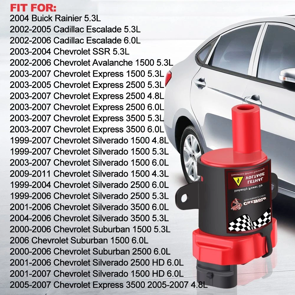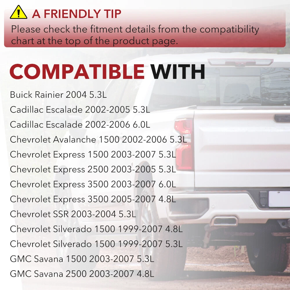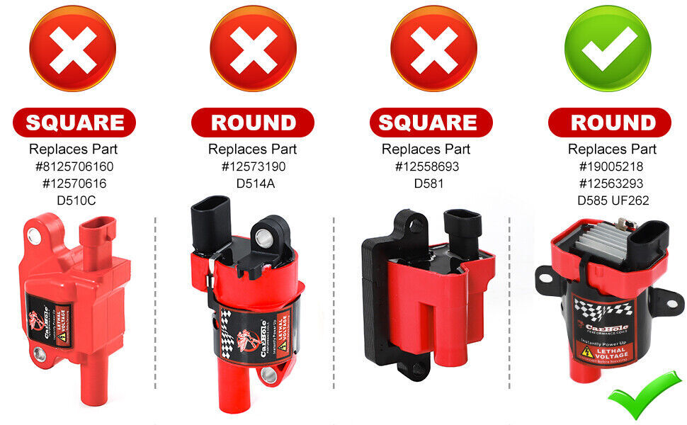 Description: Ignition Coils for Chevrolet GMC 5.3L 6.0L 4.8L C1251 UF-262 New Set of 8 Ignition Coils on Plug Pack For Cadillac Buick Chevy Isuzu GMC V8 8X Round Ignition Coils on Plug Pack For Chevy GMC Truck V8 4.8L 5.3L 6L UF262 Compatible with OEM numbers: UF-262, C1251, D-585 Compatible with Hollander number: 610-02839 Primary Resistance: 0.820 ohms Coil Internal Construction: Epoxy Maximum Voltage: 32,000 V Secondary Resistance: 7.10k ohms Inductance: 3.3mH Part Number: Automotiveparts_aa Best choice of motor parts Item Specifics Brand CarBole Manufacturer Part Number D585 Other Part Number 10457730, 19005218, 8-10457-730-0, UF-262 Placement on Vehicle Front Warranty Lifetime Quantity 8pcs/set Fits Wetherill CUF262 Fits Wells C1251 Fits Motorproducts UF262 - UF-262 Number of Pieces in Set 8 Feature 10-15% more spark and high quality Epox Interchange Part Number 1 D585 Interchange Part Number 2 UF262 C1251 Interchange Part Number 3 8104577300 12563293 10457730 Non-Domestic Product No Engine 4.8 5.3 6.0L V8 V10 Fitment Type Direct Replacement Primary Resistance 0.820 ohms Coil Internal Construction Epoxy Maximum Voltage 32,000 V Secondary Resistance 7.10k ohms Inductance 3.3mH Peak Current 140 mA Fitment 1 2004 Buick Rainier 5.3L Fitment 2 2002-2005 Cadillac Escalade 5.3L Fitment 3 2002-2006 Cadillac Escalade 6.0L Fitment 4 2003-2007 Chevrolet Express 1500 5.3L Fitment 5 2003-2005 Chevrolet Express 2500 5.3L Fitment 6 2003-2007 Chevrolet Express 2500 4.8L Fitment 7 2003-2007 Chevrolet Express 2500 6.0L Fitment 8 2003-2007 Chevrolet Express 3500 5.3L Fitment 9 2003-2007 Chevrolet Express 3500 6.0L Fitment 10 2005-2007 Chevrolet Express 3500 2005-2007 4.8L Fitment 11 2003-2004 Chevrolet SSR 5.3L Fitment 12 1999-2007 Chevrolet Silverado 1500 4.8L Fitment 13 1999-2007 Chevrolet Silverado 1500 5.3L Fitment 14 2003-2007 Chevrolet Silverado 1500 6.0L Fitment 15 2009-2011 Chevrolet Silverado 1500 4.3L Fitment 16 2001-2007 Chevrolet Silverado 1500 HD 6.0L Fitment 17 1999-2004 Chevrolet Silverado 2500 6.0L Fitment 18 1999-2006 Chevrolet Silverado 2500 5.3L Fitment 19 2001-2006 Chevrolet Silverado 2500 HD 6.0L Fitment 20 2001-2006 Chevrolet Silverado 3500 6.0L Fitment 21 2004-2006 Chevrolet Silverado 3500 5.3L 8XUF262 Round Ignition Coil Pack For Chevy Silverado GMC Buick 4.8/5.3/6.0L D585 Description: Ignition Coils for Chevrolet GMC 5.3L 6.0L 4.8L C1251 UF-262 New Set of 8 Ignition Coils on Plug Pack For Cadillac Buick Chevy Isuzu GMC V8 8X Round Ignition Coils on Plug Pack For Chevy GMC Truck V8 4.8L 5.3L 6L UF262 Compatible with OEM numbers: UF-262, C1251, D-585 Compatible with Hollander number: 610-02839 Primary Resistance: 0.820 ohms Coil Internal Construction: Epoxy Maximum Voltage: 32,000 V Secondary Resistance: 7.10k ohms Inductance: 3.3mH Part Number: D585 , 5C1082, E254, E254P, 52-1647,12573190, 8125731900, UF-262, C1251, D-585, 8104577300, 12563293, 10457730, 8-10457-730-0, GN10119, IC413, 19005218, C1251, UF262, C1251, UF-262, UF262 Installation: 1. Open the ignition coil cover on the top of the engine; 2. Use the wrench to remove the ignition coil fixing screw; 3. Remove the ignition coil. 4. Use a screwdriver to gently tilt up and take out the ignition coil; 5. Put in a new ignition coil and fasten the screws; 6. After connecting the plug, see Cover the top cover. Details: 100% Brand New Items, Never Used Or Installed High quality Proper alignment, positioning and spacing for faster, easier installation Designed to meet or exceed specifications in form, fit and function High quality components and materials Superior performance and reliability Fitment Fits for Round style Coil,does not fit Squarestyle !!! Buick Rainier 2004 5.3L Cadillac Escalade 2002-2005 5.3L Cadillac Escalade 2002-2006 6.0L Chevrolet Avalanche 1500 2002-2006 5.3L Chevrolet Express 1500 2003-2007 5.3L Chevrolet Express 2500 2003-2005 5.3L Chevrolet Express 2500 2003-2007 4.8L Chevrolet Express 2500 2003-2007 6.0L Chevrolet Express 3500 2003-2007 5.3L Chevrolet Express 3500 2003-2007 6.0L Chevrolet Express 3500 2005-2007 4.8L Chevrolet SSR 2003-2004 5.3L Chevrolet Silverado 1500 1999-2007 4.8L Chevrolet Silverado 1500 1999-2007 5.3L Chevrolet Silverado 1500 2003-2007 6.0L Chevrolet Silverado 1500 2009-2011 4.3L Chevrolet Silverado 1500 HD 2001-2007 6.0L Chevrolet Silverado 2500 1999-2004 6.0L Chevrolet Silverado 2500 1999-2006 5.3L Chevrolet Silverado 2500 HD 2001-2006 6.0L Chevrolet Silverado 3500 2001-2006 6.0L Chevrolet Silverado 3500 2004-2006 5.3L Chevrolet Suburban 1500 2000-2006 5.3L Chevrolet Suburban 1500 2006 6.0L Chevrolet Suburban 2500 2000-2006 6.0L Chevrolet Tahoe 2000-2006 4.8L Chevrolet Tahoe 2000-2006 5.3L GMC Savana 1500 2003-2007 5.3L GMC Savana 2500 2003-2005 5.3L GMC Savana 2500 2003-2007 4.8L GMC Savana 2500 2003-2007 6.0L GMC Savana 3500 2003-2007 6.0L GMC Savana 3500 2004-2007 4.8L GMC Sierra 1500 1999-2007 4.8L GMC Sierra 1500 1999-2007 5.3L GMC Sierra 1500 2002-2007 6L GMC Sierra 1500 HD 2001-2007 6.0L GMC Sierra 2500 1999-2000 5.3L GMC Sierra 2500 1999-2004 6.0L GMC Sierra 2500 HD 2001-2007 6.0L GMC Sierra 2500 HD 2006 8.1L GMC Sierra 3500 2001-2007 6.0L GMC Sierra C3 2001 6.0L GMC Yukon 2000-2006 4.8L GMC Yukon 2000-2006 5.3L GMC Yukon 2001-2006 6.0L GMC Yukon XL 1500 2000-2006 5.3L GMC Yukon XL 1500 2001-2006 6.0L GMC Yukon XL 2500 2000-2006 6.0L Hummer H2 2003-2006 6.0L Isuzu Ascender 2003-2004 5.3L Compatibility is just for reference. Please compare with your original one before purchasing Package Included: 8Pcs Ignition Coils Notes: (1)Please make sure the part numbers matches the part you are replacing. Please review the information above carefully to make sure this part fits your vehicle. (2)If you have questions on whether this part fits your vehicle, please feel free to contact us via eBay.Thank you! (3)We will process your order within 1 business day upon payment. (4)If you have any questions about quality, shipping or other problems, please contact me first via eBay message.