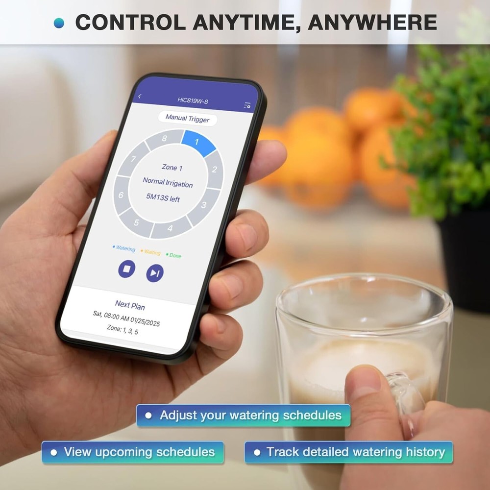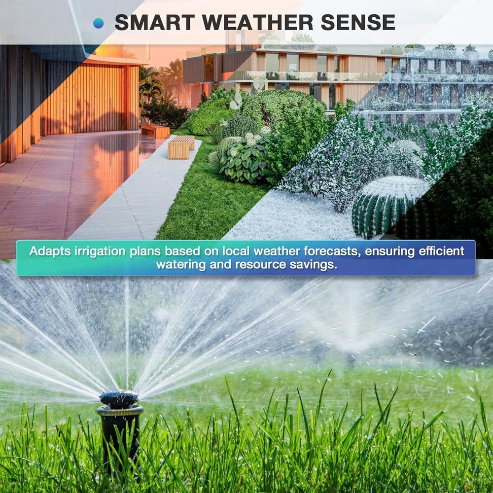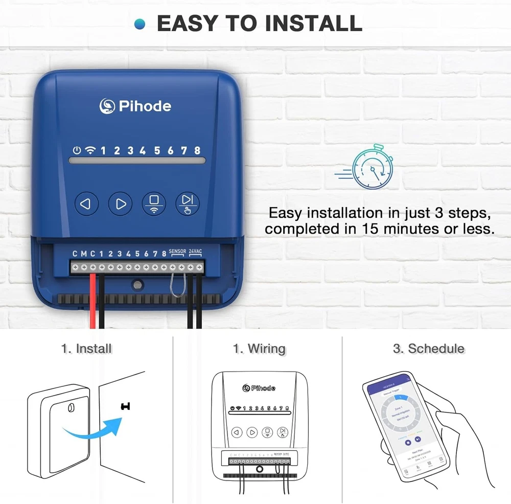 8 Zone Smart Sprinkler Controller with Local Weather Intelligence and Atmosphere Lights, Automated Watering and App Control WiFi Irrigation System, Save Water Through Rain Skip (Y#0335) About this item Smart Irrigation with Weather Integration: Pihode smart sprinkler controller delivers intelligent watering plans customized to your garden’s unique requirements. By entering basic regional information, the sprinkler controller system generates optimized schedules for watering duration and frequency. Integrated weather prediction technology automatically skips irrigation during rainfall, ensuring efficient water usage and healthier plants through precision care. Dual Control & Reliable Connectivity: Pihode sprinkler controller lets you manage your irrigation system effortlessly through two intuitive methods: use the durable built-in control panel for instant adjustments, or access advanced scheduling remotely via the user-friendly app. Designed for seamless 2.4GHz Wi-Fi compatibility, This wifi sprinkler controller maintains stable connectivity for uninterrupted control. Enhance convenience with hands-free voice commands through Alexa and Google Home integration, perfect for busy lifestyles. Versatile Irrigation Modes: Choose from three specialized watering modes: Normal Irrigation: Consistent daily watering for uniform coverage. Interval Irrigation: Customize schedules by date parity (odd/even days), specific intervals, or personalized timelines. Cycle & Soak: Ideal for slopes and dense soils, alternating watering phases to prevent runoff and maximize absorption. 15-Minute DIY Installation: Activate smart irrigation in three straightforward steps—mount the irrigation controller, connect to Wi-Fi, and configure zones through the app. No specialized tools or technical expertise required, allowing immediate setup and hassle-free operation. Reliable Performance and Support: Benefit from continuous software updates that enhance system functionality and security. Our 24/7 U.S.-based expert support team provides immediate assistance in English, ensuring quick resolution for any technical issues. Rest assured your irrigation system stays operational through every season with professional guidance just one call away.