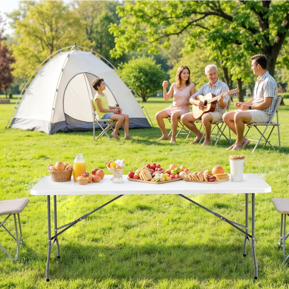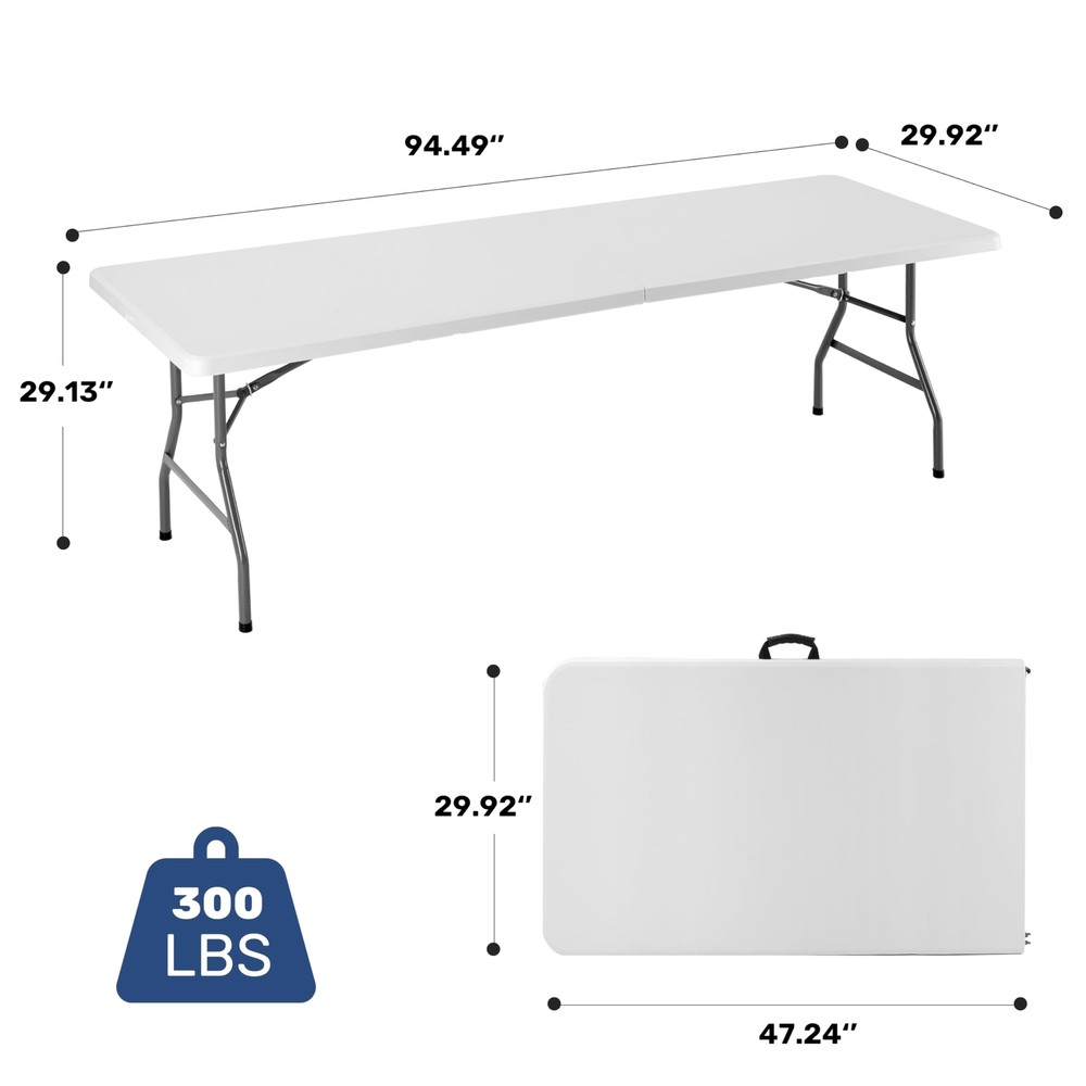 About this item Multi-Purpose Functionality: This versatile table transitions seamlessly between indoor dining or gaming and outdoor events like weddings, camping, or picnics Stable Construction: With a durable frame lock structure and anti-slip coated legs, this table offers exceptional stability and supports up to 300 lbs Convenient & Portable Design: Designed for fast setup and compact folding, this table includes a built-in carrying handle for easy transport and storage. Perfect for camping, picnics, and parties Easy-to-Clean: Made from water-resistant HDPE, the table’s surface is abrasion-resistant and easy to clean Space-Saving & Pre-Assembled: No tools required! Simply unfold the table and attach the legs. When not in use, fold it up for compact storage and space saving. Dimension: 94.49"D x 29.92"W x 29.13"H/ 47.24"D x 29.92"H (Folded)