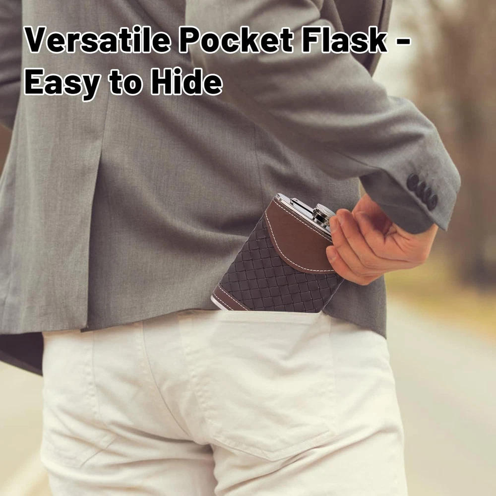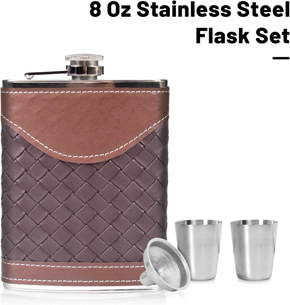 This hip flask is a fantastic gift! The dark brown leather stripe gives it a classic, stylish look, and the stainless steel interior keeps drinks fresh. The included funnel and shot glasses make it super convenient, and the polished finish feels premium. Perfect size for carrying, and the packaging makes it ready to gift. Sturdy, well-designed, and practical—definitely worth it!