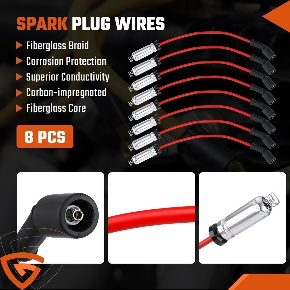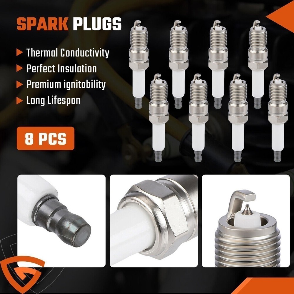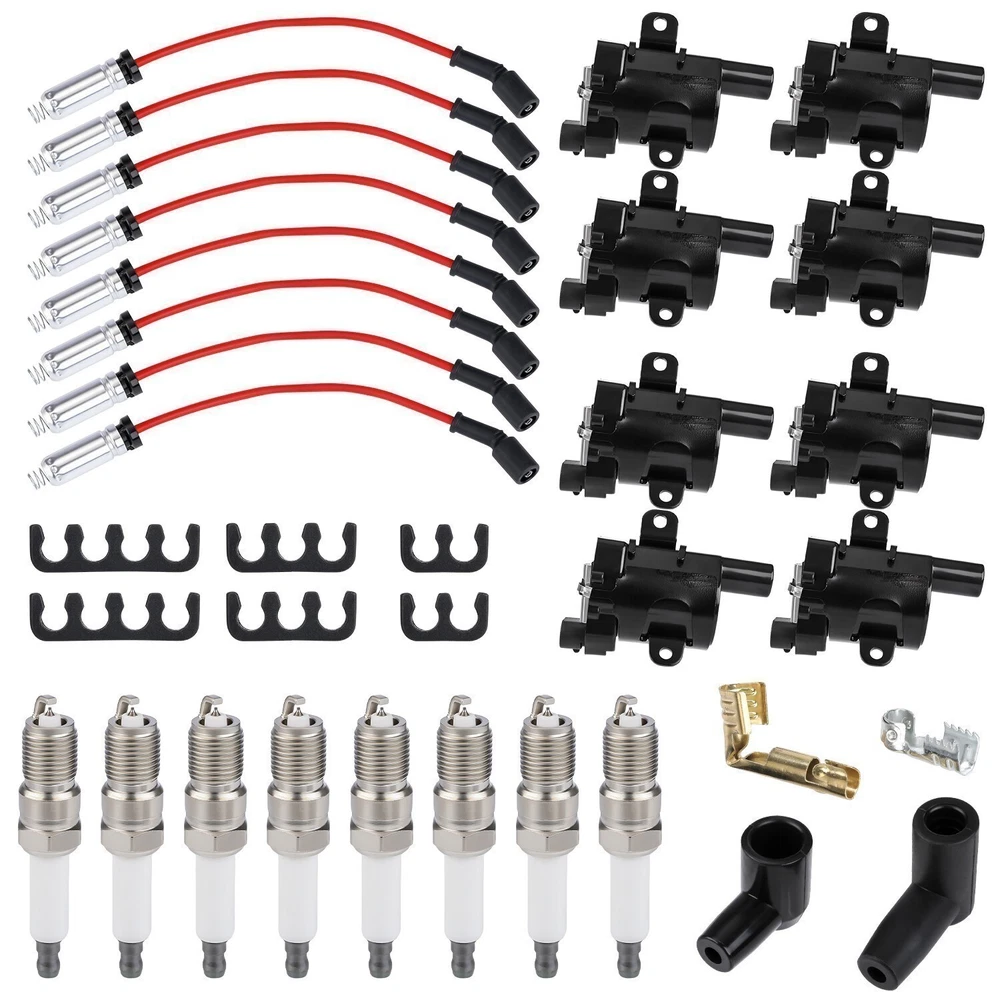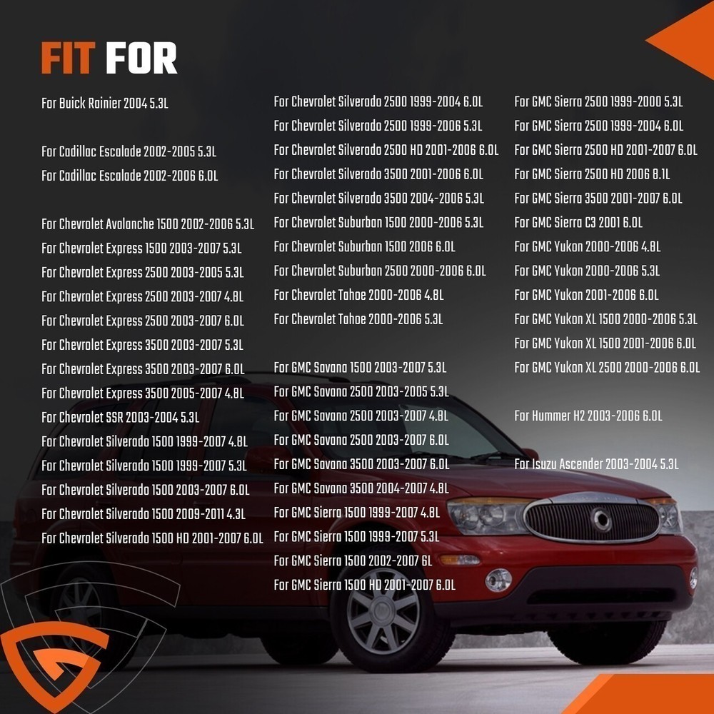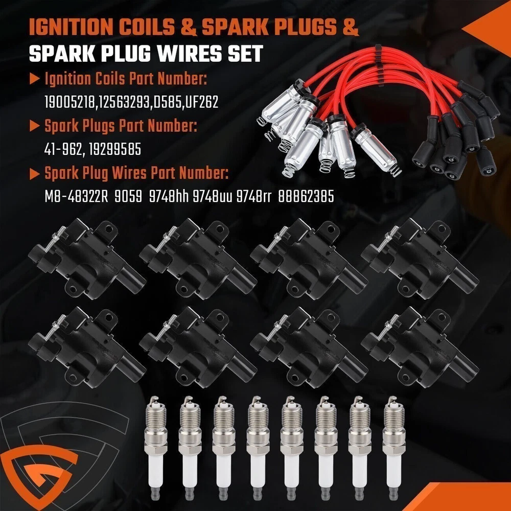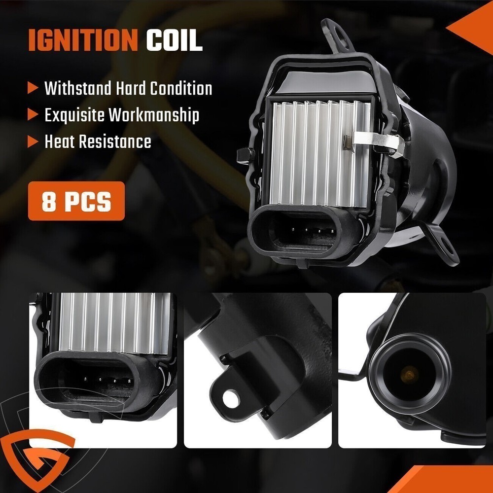 Fitment Notice: GM trucks and SUVs use two different types of coils: the MELCO style coils with the Square body and the DELPHI style coils with the Round body. Our coils shown in the pictures are the DELPHI style (Round )with heat sinks, which look like metal fins or small radiators. So please check whether your coils are same to ours or not .Thanks . Description: Primary Resistance: 0.820 ohms Coil Internal Construction: Epoxy Coil Color: Red&Black Maximum Voltage: 32,000 V Secondary Resistance: 7.10k ohms Inductance: 3.3mH Mount Type:Bolt On Coil Type:Electronic Voltage:12 Mounting Location:Engine Bay For Part Number: UF262, C1251, D585, 8125731900, 610-02839, GN10119 5C1082, E254, E254P, 52-1647, IC413, 10457730, 6737101 19005218, 8-10457-730-0, 8104577300, 12563293, CUF262 72909002614, 190005218, B045HE, BS-C1251, B045 12192195, 9748GG, 748GG, 12622553, 88862397, 12656210, XS10388 12192192 7873 12192133 88894393, 7874, 748EE, 09017, 748UU, 748BB Package include: 8x Ignition Coils (Round!!!) 8x Wires 8x Spark plug (as picture show) fitment list: Buick Rainier 2004 5.3L Cadillac Escalade 2002-2005 5.3L Cadillac Escalade 2002-2006 6.0L Chevrolet Avalanche 1500 2002-2006 5.3L Chevrolet Express 1500 2003-2007 5.3L Chevrolet Express 2500 2003-2005 5.3L Chevrolet Express 2500 2003-2007 4.8L Chevrolet Express 2500 2003-2007 6.0L Chevrolet Express 3500 2003-2007 5.3L Chevrolet Express 3500 2003-2007 6.0L Chevrolet Express 3500 2005-2007 4.8L Chevrolet SSR 2003-2004 5.3L Chevrolet Silverado 1500 1999-2007 4.8L Chevrolet Silverado 1500 1999-2007 5.3L Chevrolet Silverado 1500 2003-2007 6.0L Chevrolet Silverado 1500 2009-2011 4.3L Chevrolet Silverado 1500 HD 2001-2007 6.0L Chevrolet Silverado 2500 1999-2004 6.0L Chevrolet Silverado 2500 1999-2006 5.3L Chevrolet Silverado 2500 HD 2001-2006 6.0L Chevrolet Silverado 3500 2001-2006 6.0L Chevrolet Silverado 3500 2004-2006 5.3L Chevrolet Suburban 1500 2000-2006 5.3L Chevrolet Suburban 1500 2006 6.0L Chevrolet Suburban 2500 2000-2006 6.0L Chevrolet Tahoe 2000-2006 4.8L Chevrolet Tahoe 2000-2006 5.3L GMC Savana 1500 2003-2007 5.3L GMC Savana 2500 2003-2005 5.3L GMC Savana 2500 2003-2007 4.8L GMC Savana 2500 2003-2007 6.0L GMC Savana 3500 2003-2007 6.0L GMC Savana 3500 2004-2007 4.8L GMC Sierra 1500 1999-2007 4.8L GMC Sierra 1500 1999-2007 5.3L GMC Sierra 1500 2002-2007 6L GMC Sierra 1500 HD 2001-2007 6.0L GMC Sierra 2500 1999-2000 5.3L GMC Sierra 2500 1999-2004 6.0L GMC Sierra 2500 HD 2001-2007 6.0L GMC Sierra 2500 HD 2006 8.1L GMC Sierra 3500 2001-2007 6.0L GMC Sierra C3 2001 6.0L GMC Yukon 2000-2006 4.8L GMC Yukon 2000-2006 5.3L GMC Yukon 2001-2006 6.0L GMC Yukon XL 1500 2000-2006 5.3L GMC Yukon XL 1500 2001-2006 6.0L GMC Yukon XL 2500 2000-2006 6.0L Hummer H2 2003-2006 6.0L Isuzu Ascender 2003-2004 5.3L