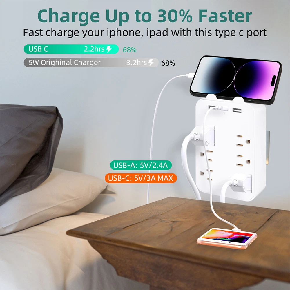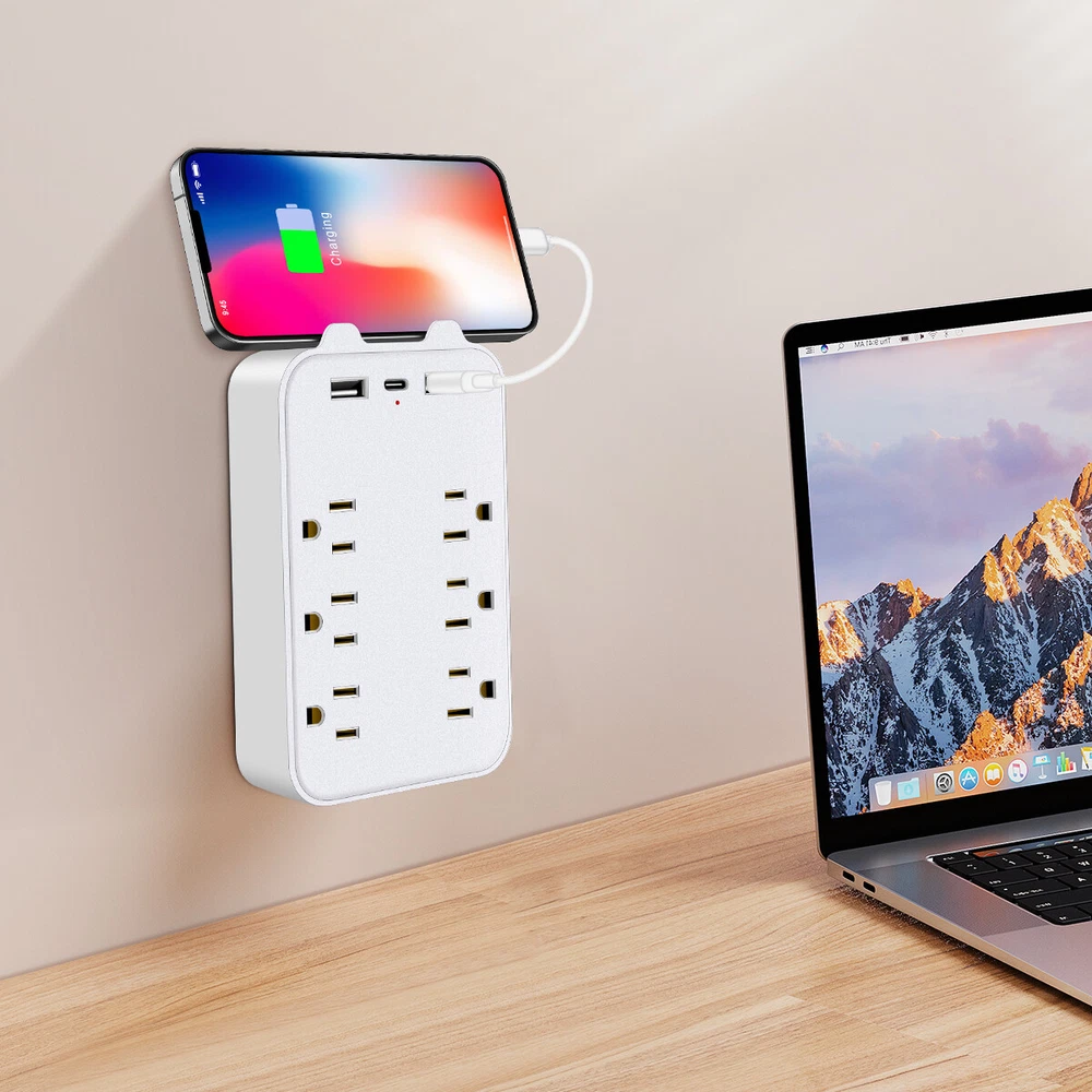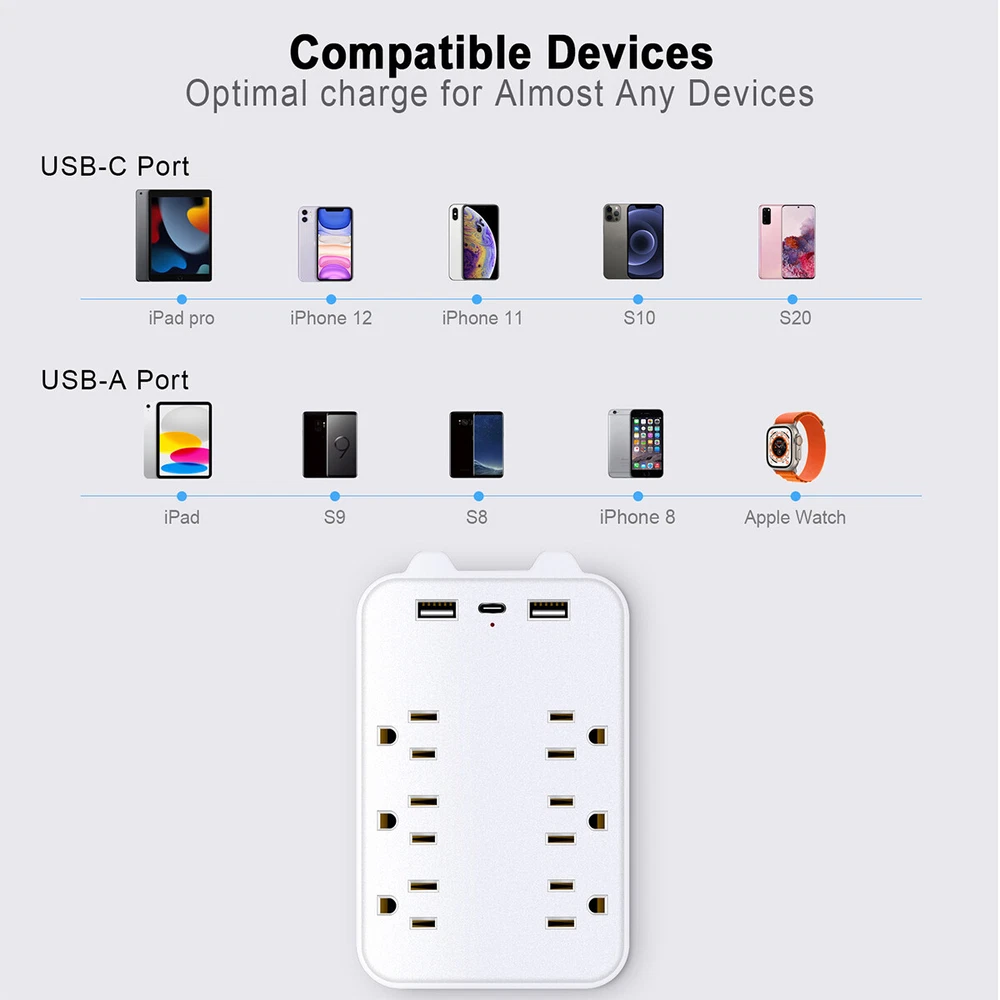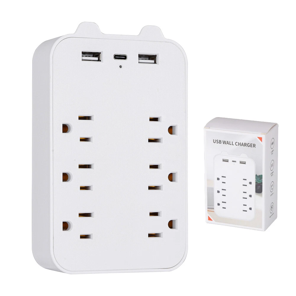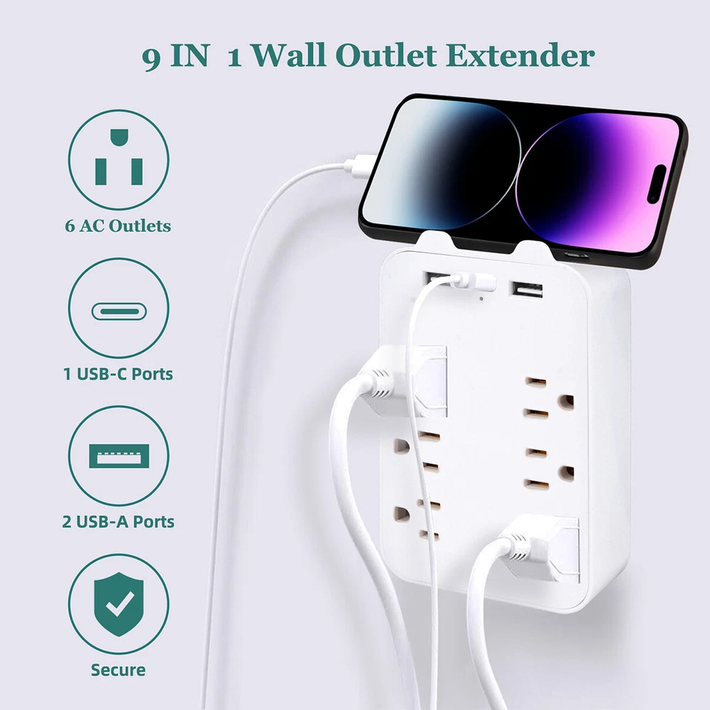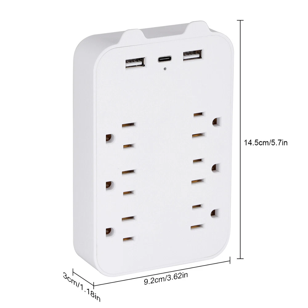 9 In 1 Surge Protector 6-Outlet Extender With USB & 1 USB-C Ports Multi Plug Product Description 6-Outlet Wall-Mounted Power Strip with USB and Type-C Ports : Expand your charging capabilities with this versatile power strip, featuring a modern white finish to complement any home or office decor. Key Features Ample Outlets : 6 standard American outlets for connecting multiple devices simultaneously. Advanced Charging : Includes 2 USB ports and 1 Type-C port for quick charging of smartphones, tablets, and other USB-powered devices. Efficient Power Delivery : USB and Type-C ports offer a total output of 5V 2.4A, ensuring fast and efficient charging. Compliant Design : Meets American electrical standards with an input voltage of AC100-130V, 50-60Hz, and a rated voltage and current of AC125V 10A, supporting a maximum output power of 1300W. Durable Build : Constructed from high-quality ABS material with a sleek white finish, and copper conductors for excellent conductivity and long-lasting performance. Specifications Number of Outlets : 6 American Standard Outlets USB Ports : 2 USB Ports Type-C Port : 1 Type-C Port Input Voltage : AC100-130V, 50-60Hz Rated Voltage/Current : AC125V 10A Maximum Output Power : 1300W USB/Type-C Total Output : 5V 2.4A Material : ABS with Copper Conductors Color : White Product Dimensions : 14.5cm x 9.2cm x 3cm Net Weight : 150g Indicator : Blue LED Light for Power Status Convenient Design Compact Size : Dimensions of 14.5cm x 9.2cm x 3cm and a weight of 150g, allowing for easy wall mounting and space-saving design. Indicator Light : A blue LED light indicates when the power strip is active, providing a visual confirmation that your devices are powered. Package Contents 1 x 6-Outlet Wall-Mounted Power Strip (White) Payment Shipping & Handling Returns Policy Contact US Feedback Payment Shipping will be arranged only your payment is cleared. We accept payment by PayPal only . All orders before 1pm(CST) will be shipped in the same day No shipping on Saturday,Sunday or Public Holidays & No responsibility for any customs duty. Shipping & Handling We ship the same business day if paid by 4pm EST(1pm PDT). No shipping on Weekend or Public Holidays & No responsibility for any customs duty. Returns Policy We offer a 60 day money back guarantee or exchange. Buyer pays return shipping and we pay replacement shipping. If you want to initiate a return ,please contact us to get a returning address before sending the item back. Contact US We hope that every transaction can have a happy ending. And if you have any more problems, please feel freeeee to contact us. we'll do what we can to help. Feedback We believe communication can result in a happier ending before you leave a red or gray feedback. And this account is my baby. I do care about it and will do what I can to protect it.