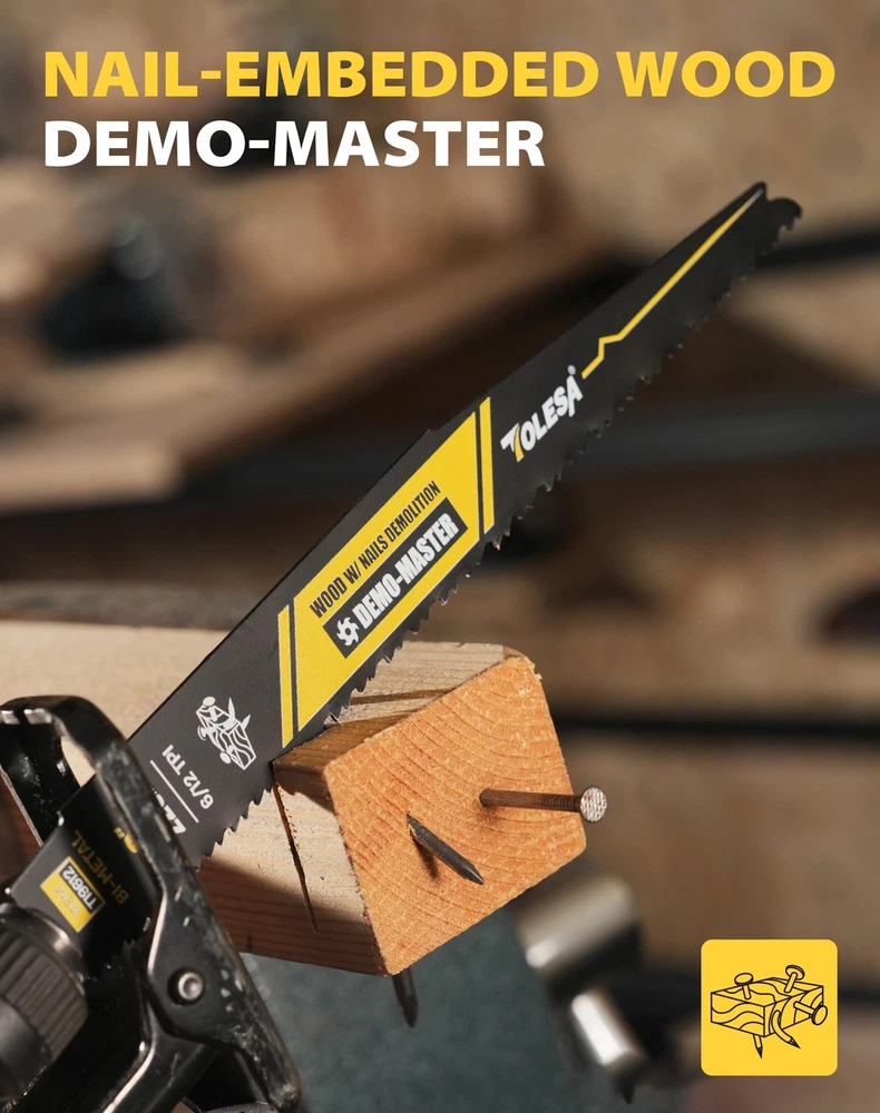 Excellent Cutting Performance: Bi-Metal 6/12T Reciprocating Saw demolition Blades are specifically designed for maximum performance in nail-embedded wood applications. when we trim wood containing nails such as abandoned fences, no longer have to worry about nail damage to the saw blade or frequently replace different kinds of reciprocating saw blades. Fast &Accurate Cutting : Designed with variable teeth, provides faster cuts with less vibration, Ensures optimal cutting performance on materials of varying hardness and thickness. High Strength Thickened Saw Blades: Unlike other bi-metal saw blades, constructed by high-density bi-metal with extra 8% cobalt, and 1.27mm thickness is thicker than many saw blades on the market, which means it has longer life span. More importantly, this will effectively reduce the risk of sudden blade breakage during cutting. Versatile Applications: Ideal for a wide range of materials including wood (with nails), common lumber, PE/PVC, OBS plywood, nails, screws, tires, wooden fences, plastic, and metal demolition, making them indispensable in various everyday tasks. Universal Shank Compatibility: Compatible with major reciprocating saw brands such as Bosch, Dewalt, Milwaukee Sawzall, SKIL, Makita, Black & Decker, Ryobi, Porter Cable, Hitachi, Flex, Hilti, and more, ensuring versatility and ease of use across different tools.