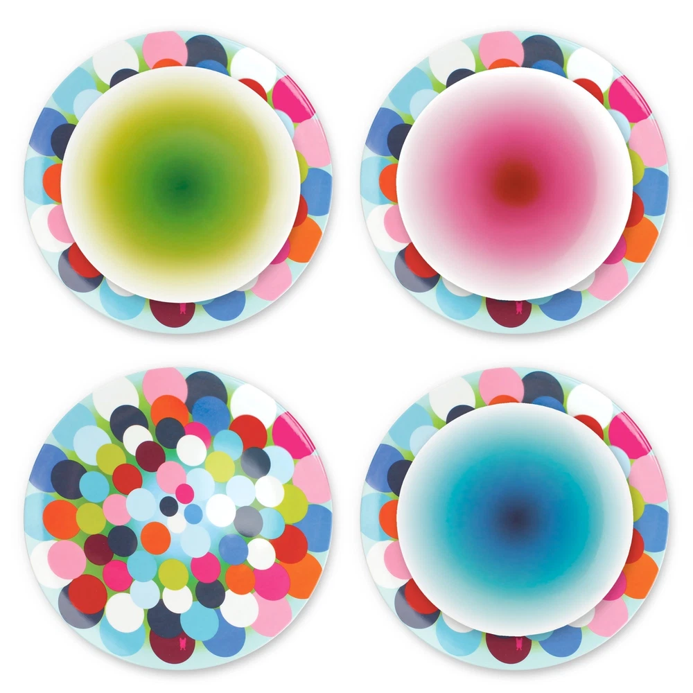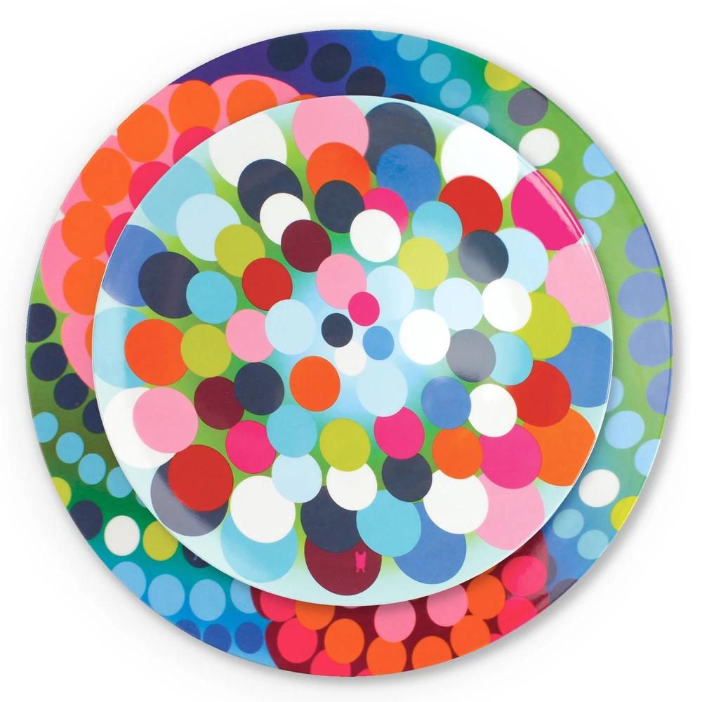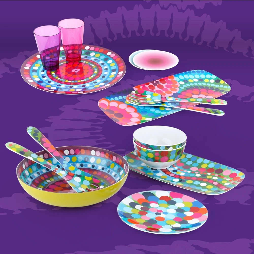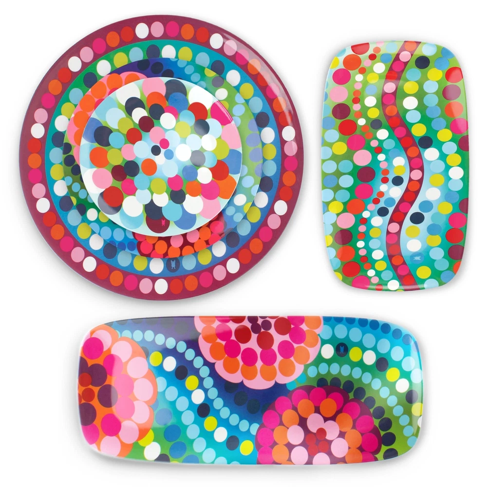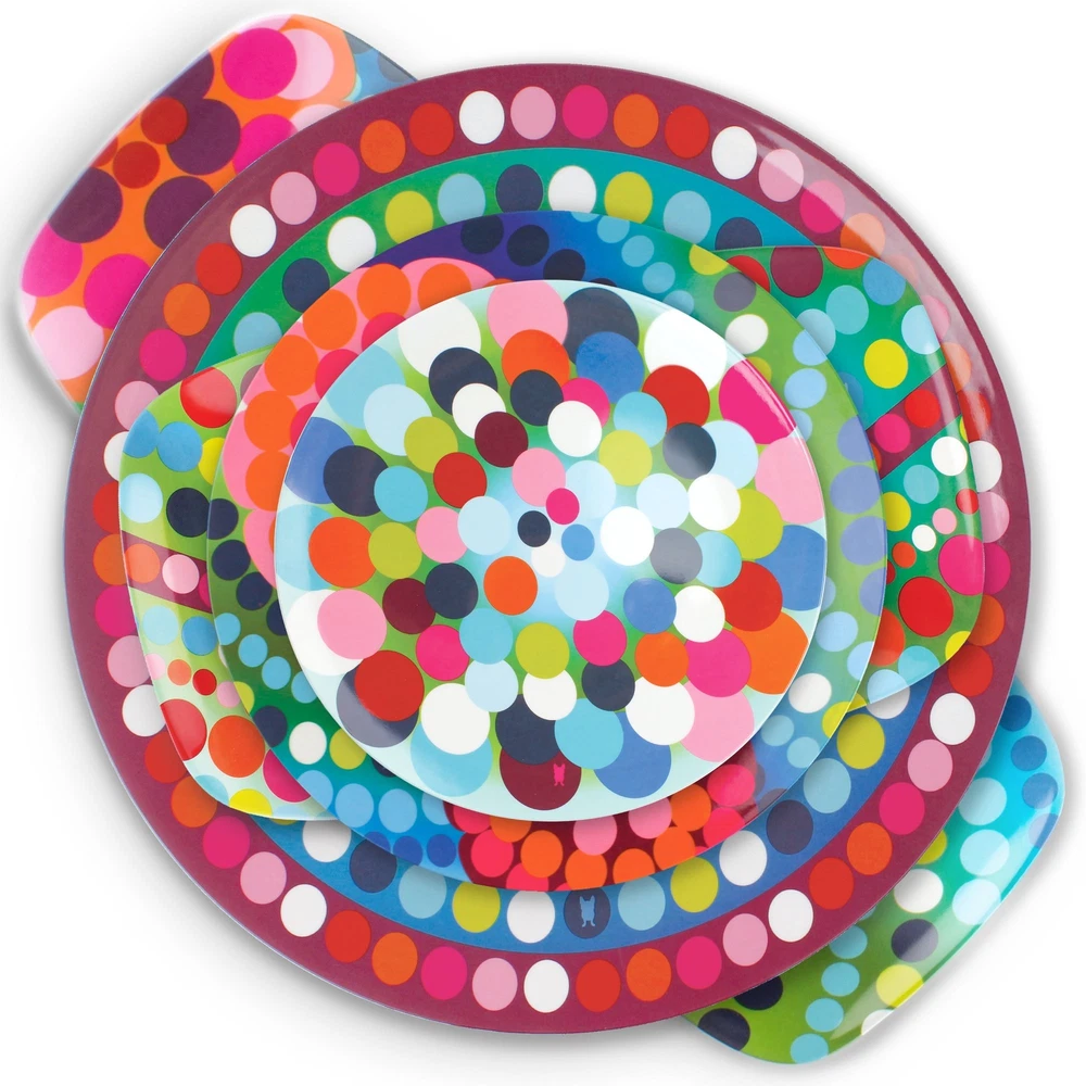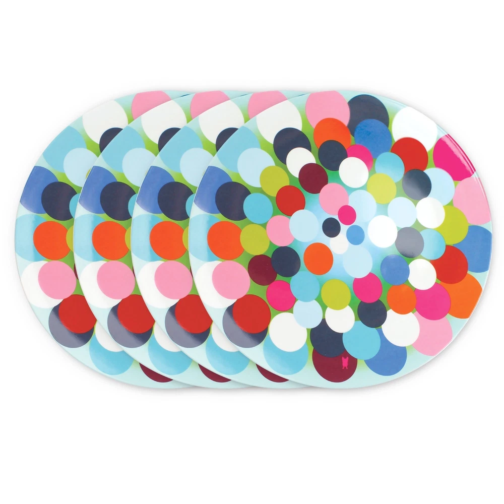 Made of 100 -percent melamine and can be used on the kitchen table, countertop or outdoor patio. Melamine is resistant to high heat, it's shatterproof, and an ideal ground for pattern. Plus, melamine does not easily absorb fluids from food, which helps you avoid contaminating your food with harmful bacteria D a leading cause of illness and food poisoning. The durability and functionality of the material is perfect for indoor or outdoor entertaining, everyday use and is completely safe for children. 's puts a spin on entertaining. It features a glazed surface that resists scratches. Not for microwave use. Top rack dishwasher safe. D reinterpreting everyday staples with a fresh, modern spin!. High quality Melamine dinnerware is perfect for everyday dining and entertaining; heavy Weight and festive, dinner ware is the finest collection of plates, platters, and serving utensils Perfect for indoor and outdoor use; Melamine is great for BBQs, summer fun, entertaining, fiesta, and parties of all kinds; very kid friendly, will not chip or crack easily Salad plate is great for all occasions; BBQ, pool parties, summer time, camping; the gorgeous colors are so appetizing your guests won't stop Talking about it Do not use in the microwave; Dishwasher safe; glazed melamine; non-absorbent; bpa-free; scratch and shatter resistant designs are created by Jackie Shapiro - iconoclast designer based in New York City; explore matching and mixing other patterns to create your personal collection