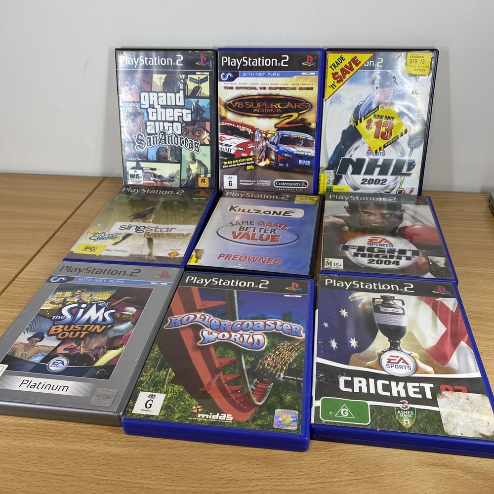 9 x PS2 Playstation 2 Game Bundle - Grand Theft Auto - San Andreas - V8 Supercars Australia 2 - NHL 2002 - Rollercoaster World - EA Sports Cricket 07 - The Sims Bustin' Out - EA Sports Fight Night 2004 - Killzone - Singstar Legends