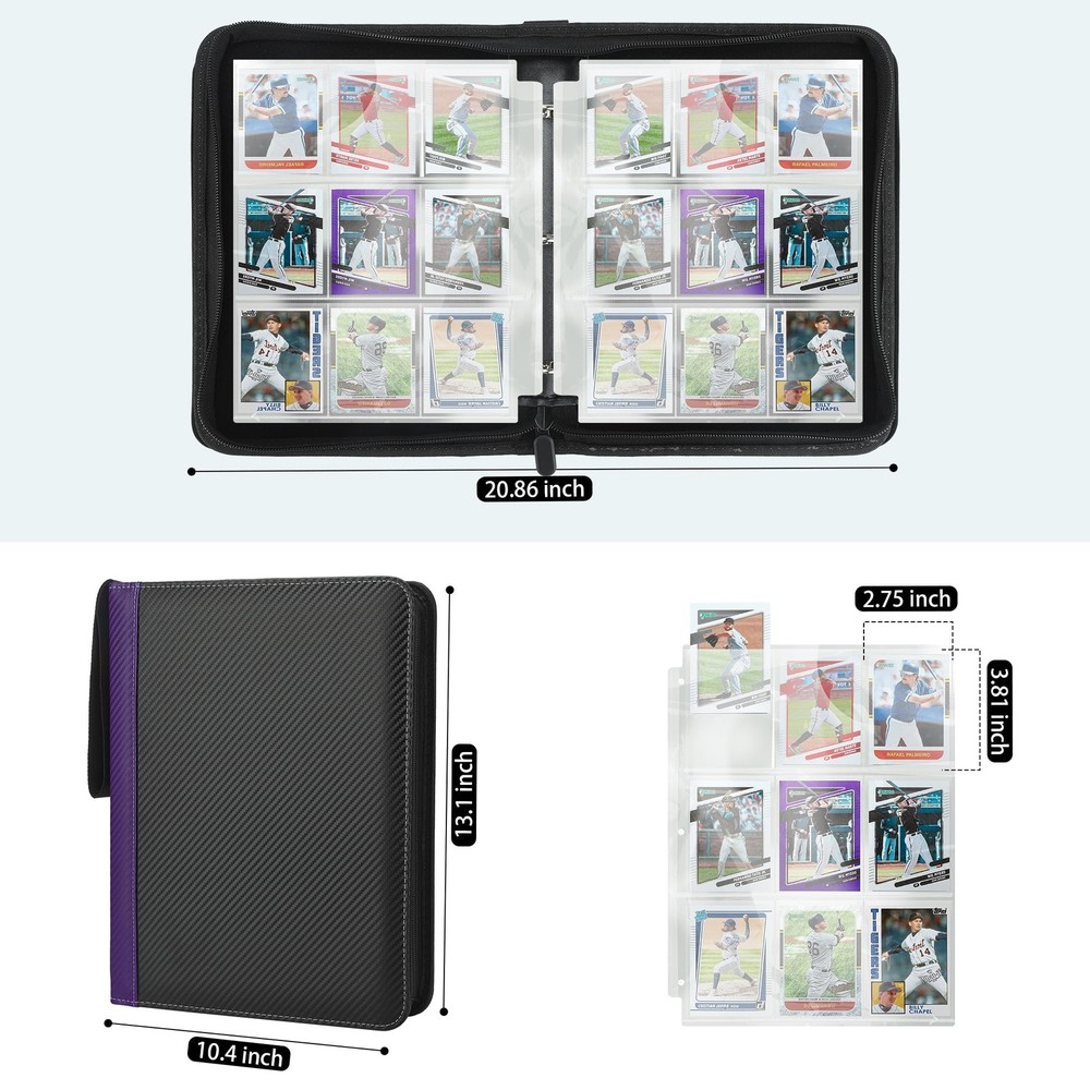 9 pocket Trading Card Binder with 50 Pages Sleeves Holder 900 Cards HOLDS A TOTAL OF 900 CARDS - Designed with both functionality and style in mind, our Album holder trading card sleeve is a must-have accessory for any dedicated card collector and player. This 9 pocket card binder has 50 double sided pages that can hold up to 900 cards, providing the perfect balance of protection and accessibility. SUPERIOR PROTECTION AND ORGANIZATION - The trading card binder features a durable and waterproof PU material and sturdy construction that can withstand everyday use, inner side made from soft black velvet to provide superior protection and organization. Our card binder has good dust-free and moisture resistance for your prized PKMN card collection, ensuring that your cards stay safe, secure, and in pristine condition. 3-RING BINDER WITH 50 PAGES SHEETS - The 3-ring design is convenient for you to add or remove sheets at will. 9-Pocket binder with 50 pages of sheets can hold up to 900 cards, providing plenty of space to get all your cards organized. SUITABLE FOR MULTIPLE CARD - Our Card Binder for trading cards is compatible with standard sized cards such as football cards, baseball cards, playing cards, mini-Polaroid photos, MTG Card Game, Cards Against Humanity, Unstable Unicorns Base Game, Monopoly Deal Cards and of course, Yu-Gi-Oh Card Game, Skylanders and much more. IDEAL GIFT FOR TCG LOVERS - Looking for the perfect gift for the trading card game enthusiast in your life? Look no further than our premium trading album display holder. Handle straps design can carry around to show off cards to your friends.
