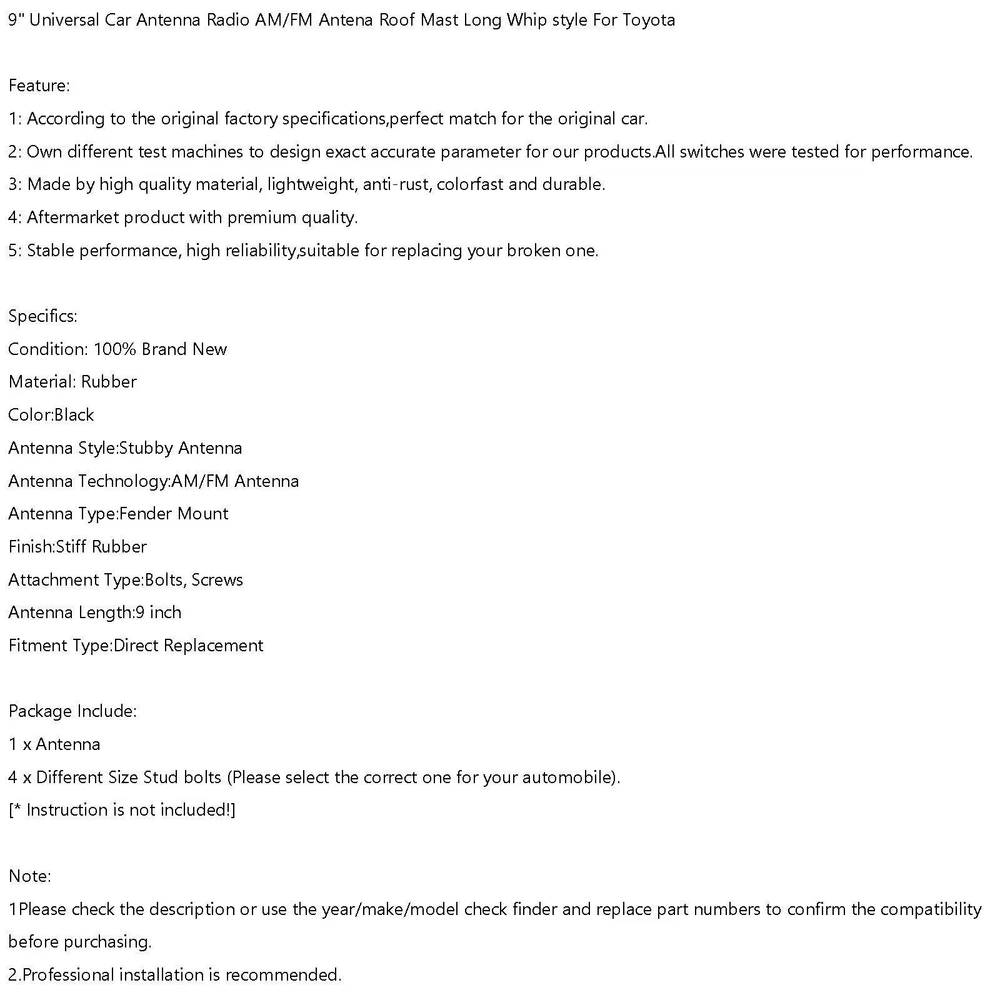 Auto Transmission Valve Body 01M325283A For VW Jetta Golf Beetle 1999-2005 170.78 USD Free shipping For Peterbilt Door Latch Striker R56-6017 15.78 USD Free shipping FUEL PUMP FUSE RELAY fit for Yamaha YZF R1 R6 FZ1 Fazer FZ8-N Naked 5VK-81950-40 28.87 USD Free shipping Sun Visor Holder Retainer Clip AL8Z-7804132-AA For Ford Escape 2010-2012 12.59 USD Free shipping Oil Cooler Filter Housing Seal Gasket O-ring 21304-JA11A For Nissan Armada Titan 10.15 USD 10.68 USD Free shipping 5% off Regulator Rectifier for Johnson Evinrude 9.9-60Hp 82-03 173692 581778 582304 17.85 USD 18.79 USD Free shipping 5% off M18X1.5 Female Aluminum Weld On Fitting Bung US 11.2 USD 11.79 USD Free shipping 5% off Clutch Booster Fit for Nissan Patrol GQ Y60 TB42 & TD42 Diesel # 30630-VB000 67.87 USD Free shipping Ignition Cover Gasket For 250 EXC-F XCF-W Six Days XC-F 2006-2011 77030140000 T9 12.15 USD 12.79 USD Free shipping 5% off Black mirror delete blanking block off plates fits BMW S 1000 RR 2020-2023 19.72 USD Free shipping H8 For`Philips CoreDrive Halogen Fog 12360CDC1 12V 35W PGJ91-1 M2 13.79 USD Free shipping Trunk Lid Tailgate Back Door Control Module Unit For BMW X5 E70 X6 61357335274 59.78 USD Free shipping Power Outlet Cigarette Lighter Socket 253369B92A For Nissan #1 14.13 USD 14.87 USD Free shipping 5% off Voltage Regulator Rectifier For Honda XR 600 R XR600R XR 650 R XR650R 91-07 31.15 USD 32.79 USD Free shipping 5% off Universal Motorcycle CNC Adjustable Steering Damper Stabilizer Top Black YU 50.15 USD 52.79 USD Free shipping 5% off Wet Clutch Shoe Carrier Assy w/Springs Fit for Honda PCX 125 150/125/150 09-18 53.99 USD Free shipping A Fantastic Shop Send us a message Our Store Seller Profile Feedbacks Save this seller Contact 9" Universal Car Radio AM/FM Antena Roof Mast Long Whip style For Toyota V 9" Universal Car Antenna Radio AM/FM Antena Roof Mast Long Whip style For Toyota Feature: 1: According to the original factory specifications,perfect match for the original car. 2: Own different test machines to design exact accurate parameter for our products.All switches were tested for performance. 3: Made by high quality material, lightweight, anti-rust, colorfast and durable. 4: Aftermarket product with premium quality. 5: Stable performance, high reliability,suitable for replacing your broken one. Specifics: Condition: 100% Brand New Material: Rubber Color:Black Antenna Style:Stubby Antenna Antenna Technology:AM/FM Antenna Antenna Type:Fender Mount Finish:Stiff Rubber Attachment Type:Bolts, Screws Antenna Length:9 inch Fitment Type:Direct Replacement Package Include: 1 x Antenna 4 x Different Size Stud bolts (Please select the correct one for your automobile). [* Instruction is not included!] Note: 1Please check the description or use the year/make/model check finder and replace part numbers to confirm the compatibility before purchasing. 2.Professional installation is recommended. About US About Our Items We strive to describe all items accurately and thoroughly, with the utmost care and attention to detail. However, to ensure a mutually satisfactory transaction, we kindly ask for your assistance in thoroughly reviewing the item description and photos, and addressing any questions before placing a bid. Customer Satisfaction We stand behind our commitment with exceptional service, a 100% money-back guarantee, and a dedication to customer satisfaction. I am readily available to address any inquiries or concerns you may have, both before and after your purchase. Our aim is to ensure your shopping experience is enjoyable and that you're delighted with your purchase. Feedback Your feedback is crucial to our business's success. If you're satisfied with your purchase and the service you received, we would greatly appreciate your positive feedback, along with an overall Detailed Selling Rating (DSR) of 5. Please take a moment to leave us positive feedback. Our eBay account is set up to automatically reciprocate positive feedback once yours is received. If you're considering leaving neutral/negative feedback or opening an eBay/PayPal case, we encourage you to reach out to us immediately. We're committed to resolving any issues to the best of our ability. Shipping Parcel will be shipped using Standard shipping method. For security purposes, items will be shipped exclusively to the confirmed address on Paypal. Please ensure your Shipping address is up to date before proceeding with payment. Estimated delivery time within the United States ranges from 3 to 10 business days, depending on your location. Returns We accept returns within 60 days from the date the buyer receives the item. If the item is found to be defective upon receipt, the customer has up to 30 days from the date of receipt to request an exchange for a new item or a refund. For returns due to a change of mind, we accept items in their original selling condition. However, if the package has been opened due to a mistaken order, it does not qualify for our return policy. Please note that the buyer is responsible for covering the cost of return postage. If you encounter any issues, please reach out to us via eBay message, and we'll respond within 24 hours. ANTENNA ROD WITH DRIVE CABLE For Toyota Lexus Land Cruiser 86337-60080 13.78 USD Free shipping Radio Aerial Antenna 65202296772 For Mini R50 R52 R53 R55 R56 F54 F55 F56 F57 11.79 USD Free shipping 7" Car Antenna For GMC Sierra / Chevr Silverado 1500 2500 3500 2007-2019 14.79 USD Free shipping ANTENNA ROD WITH DRIVE CABLE Fits for Toyota Lexus Land Cruiser 86337-60080 13.78 USD Free shipping Manual Lock Down Antenna For Landcruiser 80 Series HDJ80 HZJ80 FZJ80 23.79 USD Free shipping 7" Car Antenna Mast AM/FM For Mitsubishi Outlander 2007-2017 13.79 USD Free shipping 9" Amplified AM/PM Roof Aerial Antenna + Base Combo Set For VW Jetta Bora Passat 16.79 USD Free shipping 11"Inch Black Antenna Mast AM/FM For Toyota Tacoma 1995-2016 10.68 USD Free shipping 7" Car Antenna 863090R010 For Toyota RAV4 