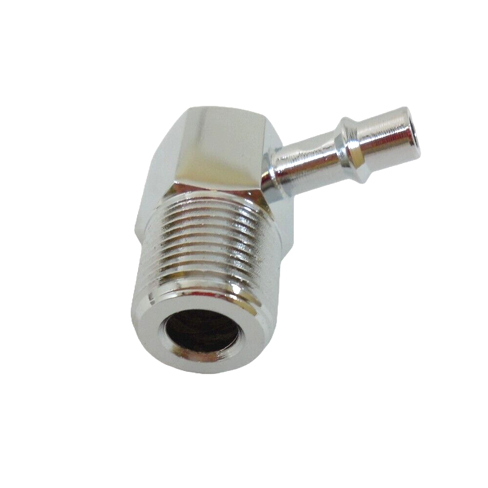 90° INTAKE MANIFOLD VACUUM FITTING - CHROME Features: Application: Universal Angle : 90° Size: 3/8 NPT to 1/4" Hose Barb Material: Aluminum Finish: Chrome Plated. Dimensions : 1.5" Tall (Overall) Fast and Free Shipping You're already purchasing the item. Why pay additional for shipping, especially slow shipping? We get your order shipped out within 1-business day and delivered to your doorstep as quickly as possible. Competitive Pricing With our dynamic pricing model, our prices are always competitive. Our prices are some of the lowest that you will find on the internet. Rest assured that you're getting a good deal when purchasing with us. 30-day Money Back Guarantee We are committed to making sure that you leave this transaction satisfied. If you're unhappy with the product for any reason, you may return it back for your money-back or a replacement within 30 days. No questions asked!