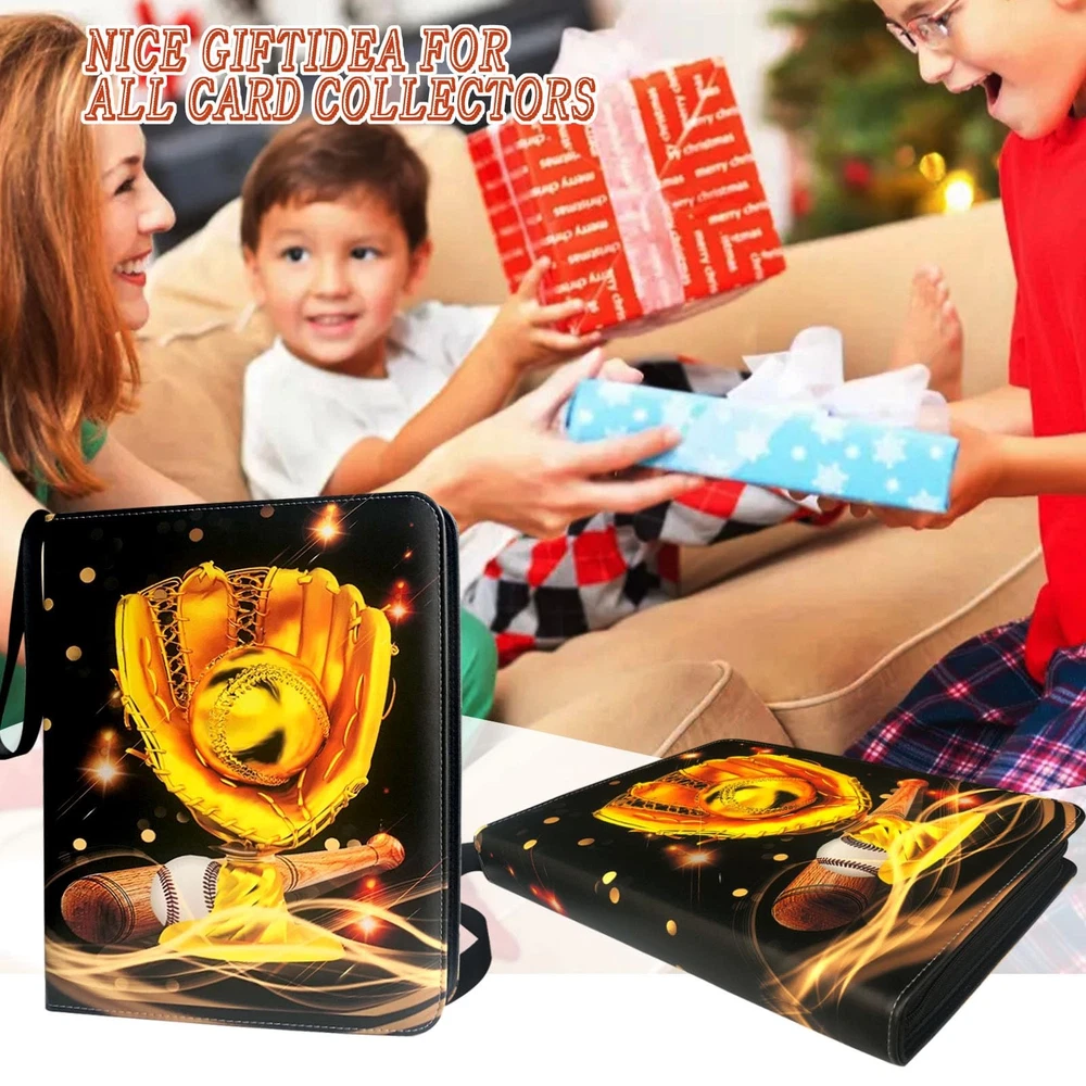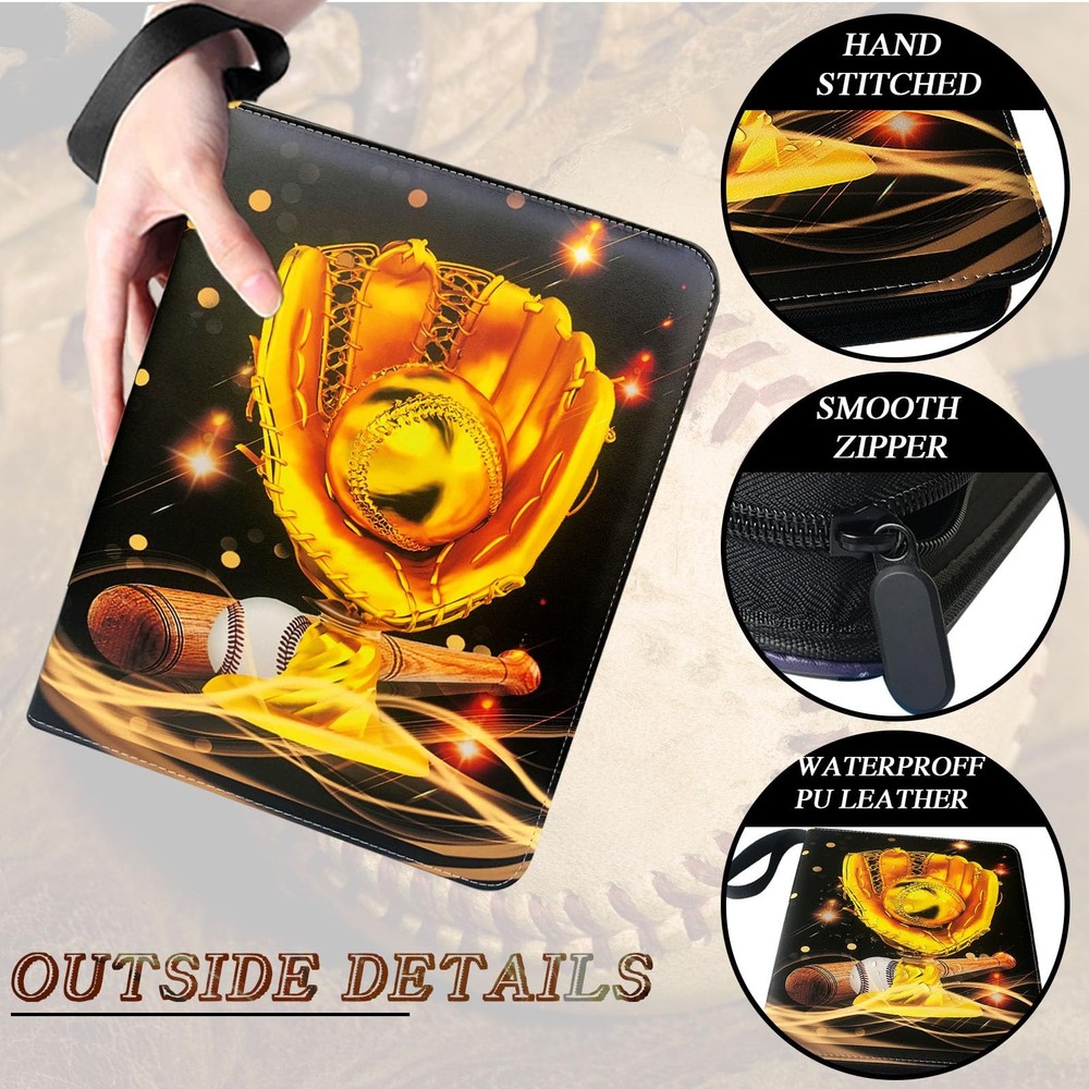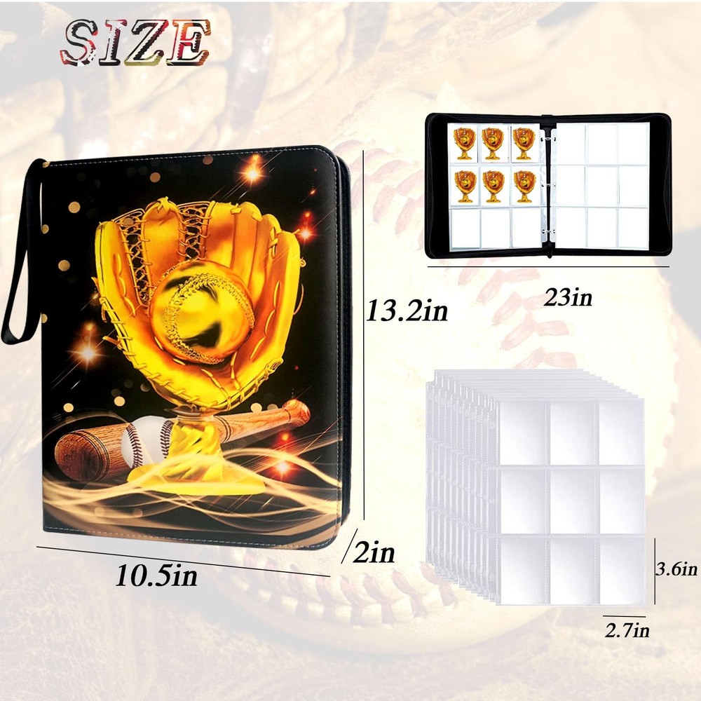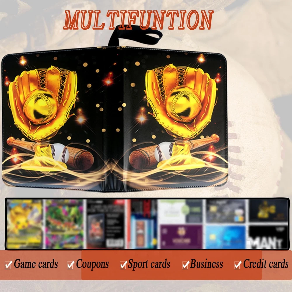 Baseball card binder is made of high quality PU leather, durable and waterproof. Highly transparent card sleeve for easy display and browsing. The zipper design ensures that the cards cannot be lost. All-round protection for your cards. The 9-pocket card binder with 50-page sleeve can hold 900 cards. Store and display your cards in this trading card binder to keep them organized. Compatible for Different Card, Trading card binder fits all standard size cards like soccer card football cards, baseball cards, top aces, game cards, attack cards and more. 【Baseball Card Binder 9 Pocket】Each baseball card binder has 50 pages, each page has a double-sided card slot,holds up to 900 cards. hobby. Fits any standard, 3-hole pages or paper. It is refillable/expandable, It means that you can arbitrarily increase or reduce the number of internal Pages. 【Waterproof PU Fabric】Sport card binder is made of premium PU leather, they can be easily wiped even if they are accidentally covered with a little stain. The middle layer is protection material-Velvet, which has good shock and moisture resistance and provides a series of protection. 【 Unique design】Baseball card binder with sleeves have a unique design, bright and colorful cover design, and baseball fans like this design to make them look different. The extra wristband design makes the card binder easy to carry to your friend's house or travel. 【Applicable to Various Cards】Trading card binder applicable to various cards,It is compatible with other standard cards such as YuGiOh, Magic Cards, Football Cards, Baseball Cards, Game Cards etc. 【Ideal Gift】 Help kids develop good storage habits. or as an album for school supplies! This is an ideal gift for card collectors, Sports fan, children and friends