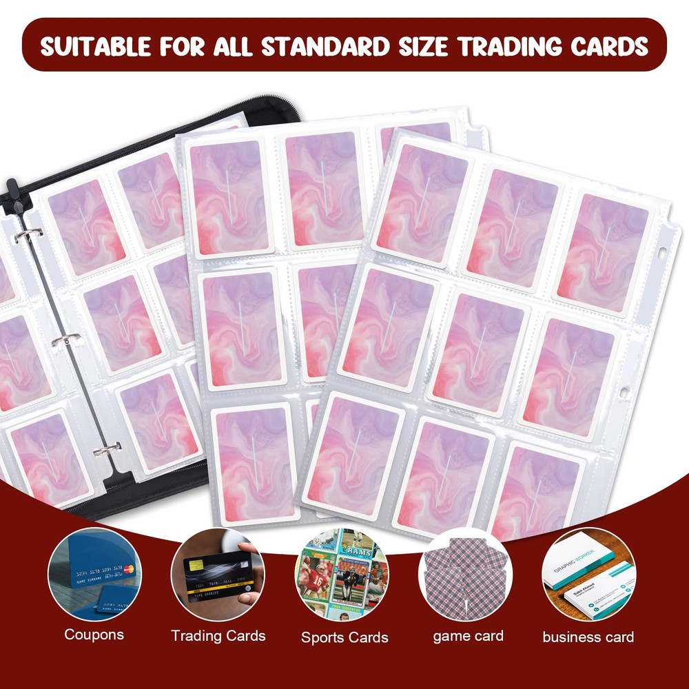 The protective sheets are made of thick waterproof material, dust-proof and moisture-proof, which effectively protects the card from fading and staining. The light transmittance is up to 99%, making the collection content clearer, thicker material, wear-resistant, scratch-resistant, and protect the card better. It adopts a humanized wristband design, which is easy to carry and you can show your collection to friends anytime, anywhere Exquisite Craftsmanship and Waterproof PU Material - The surface of this card binder is made of premium-quality PU leather, which is waterproof, scratch-resistant, easy to clean. The 3-ring buckle is made of high-quality stainless steel, which can be easily opened and is not easy to scratch your hands, and it is convenient to increase or decrease the card sleeve Multi-protection - This baseball card binder adopts a closed zipper design to prevent the card from falling. The protective sheets are made of thick waterproof material, dust-proof and moisture-proof, which effectively protects the card from fading and staining Humanized Wristband Design - Card binder 900 pockets for baseball adopts a humanized wristband design, and you can hang it on your wrist when you go out, easy to carry 900 Pokects Card Binder - The card binder 9 pocket has 50 double-sided protective sheets to hold up to 900 cards. Sports card binder can store and display all the trading cards you have, the cards can be stored in an orderly manner, instead of throwing them everywhere, which cultivates children's storage integration ability and help children develop good storage and organization habits Great for Various Cards - The card holder binder not only can store game cards, business cards, photos, and other standard-size cards but also can as present for Thanksgiving, Christmas, birthdays, and other holidays for children, adding different fun to them