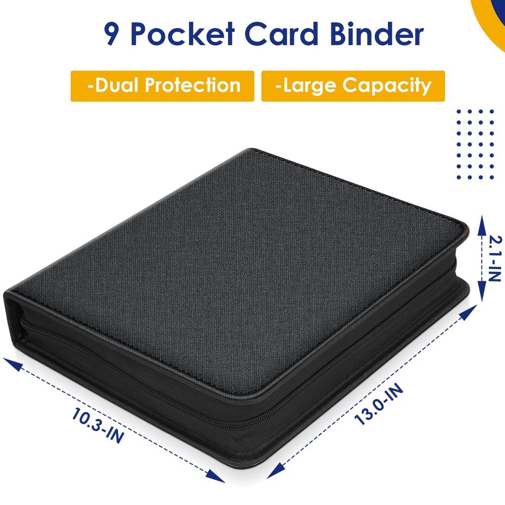 9 Pocket Trading Card Binder Package Include: One pakage including a Baseball Cards Binder with 50 durable page holding 900 cards (with 9 pockets per page) Trading Cards are NOT INCLUDED. Large Capacity Card Storage: card binder contains 50 pages of card sleeve pages, each page is double-sided, each side has 9 pockets. It providing plenty of space to get all your cards organized, great for card storage and display. Effective Protection: Made by high-density EVA foam and PU leather Material, the product thereof is waterproof and exterior is comfortable to touch and hold in hands. Equipped with easy-pulled zipper, it is portable for you to keep the card binder and prevent it from losing. Double Side Pockets: It can keep cards securely stored and easy to access, but won't slide out easily. Card Binder is convenient for inserting and removing cards frequently. Wide Application: Our Cards Binder fit for all standard sized trading cards such as, Baseball Cards, Sports Cards, Playing Cards, Top Trumps, Gaming Cards, attack cards, 3 inch photos, coupons, business cards etc.