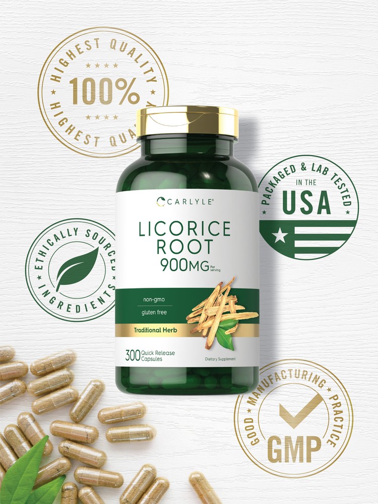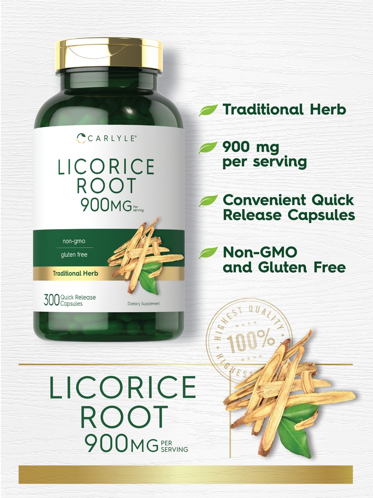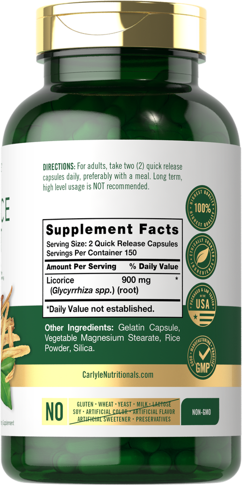What is Licorice Root? Licorice (Glycyrrhiza) is a Chinese traditional herb that was discovered centuries ago and is still popular today. The roots of this perennial plant possess powerful plant nutrients making it a highly coveted ingredient in many cultures. It is commonly featured in herbal supplements such as powder, liquid, tablets, and capsules. Carlyle Licorice Root: Carlyle Licorice Root capsules contain 900 mg of Licorice root per serving, providing powerful plant nutrients for your daily routine. Our supplement is gluten-free and non-GMO, making it an exceptional source of this traditional herb. Rooted in Wellness: Our expertise in sourcing the purest ingredients combined with advanced technologies makes us proud to deliver premium, honest supplements at the best value. Carlyle Licorice Root is a testament to our commitment to excellence, made with powerful ingredients rooted in wellness. Thanks for choosing us in your pursuit of living healthy. Not intended for use by pregnant or nursing women. If you are taking any medications, planning any medical or surgical procedure or have any medical condition, consult your doctor before use. Persons with high blood pressure should consult a doctor prior to consuming licorice root. Using licorice from glycyrrhiza can elevate blood pressure with prolonged use. Do not use for more than 6 weeks. If any adverse reactions occur, immediately stop using this product and consult your doctor. Not intended for use by persons under the age of 18. If seal under cap is damaged or missing, do not use. Keep out of reach of children. Store in a cool, dry place.