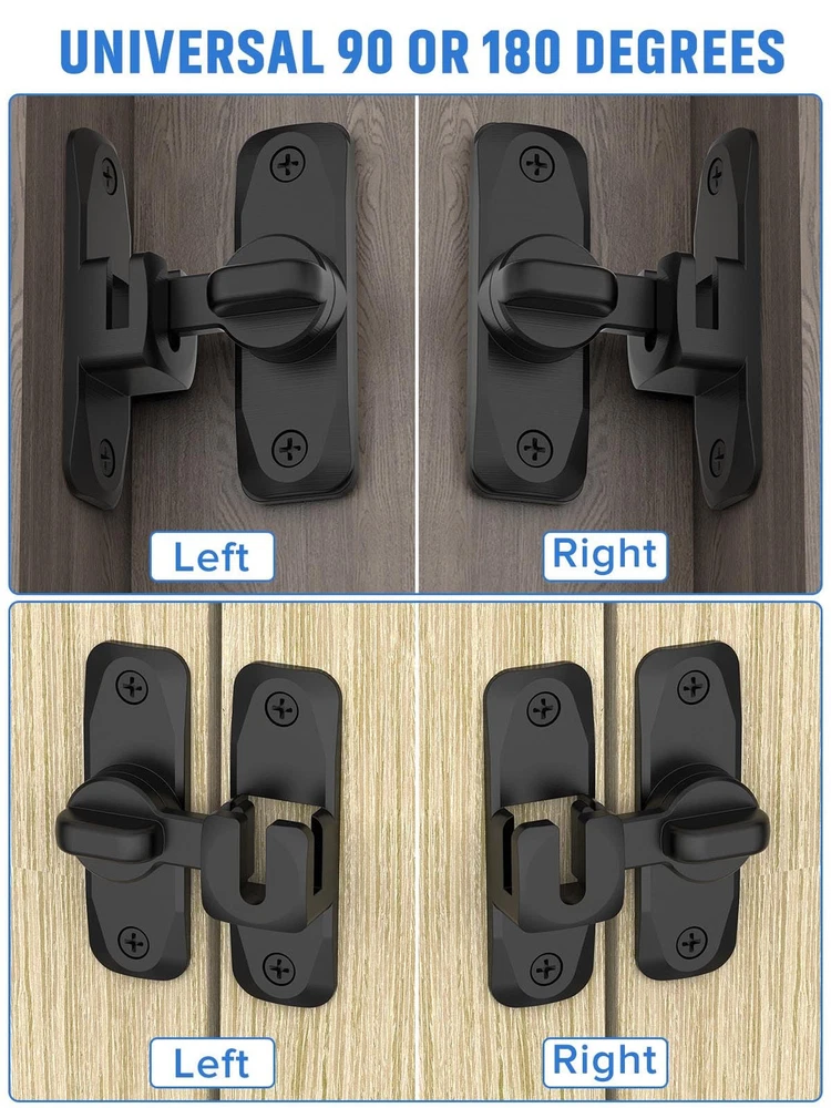 90/180 Degree Flip Barn Door Lock, Protect Privacy - Security Door Latch, Small Gate Latches Hardware for Barn, Garden, Bathroom, Cabinet, Window, Sliding Door (Black-2PCS) Upgraded 2-IN-1 Quality Door Lock: The 90/180 Degree barn door lock can be mounted at 90° right angles, also can be mounted at 180 degree angles for even more space-saving use. Ideal for family bedrooms, doors, bathrooms, gates, sheds, cabins, windows, cabinets, kitchens, offices, barn door latches and more Heavy Duty Material: The quality flip latch lock is made of zinc alloy material with multi-layer polishing technology on the surface, it is moisture-proof and anti-corrosion, will not rust and change color, to ensure safe use of a long time 2.5mm Thick Door Latch Spacer: The spacer is made of solid aluminium alloy material; Thickness: 2.5 mm; Length: 80 mm; Width: 25 mm; If the door and the frame/wall are not in the same plane, the sliding barn door locks can be installed by adding this spacer (for example, if the door gap ≤ 2.5 mm, you can add one 2.5 mm spacer; if 2.5 mm<the door gap ≤ 5 mm, you need add two 2.5 mm spacer) Quick to Install and Maintain: The barn door lock is suitable for left or right installation, and installation at an angle of 90° and 180°. Simply fit the door latch lock to your door frame, mark the height and mounting holes and mount to your door jam with the supplied screws Multi-Scene Use: door lock suitable for most door, It is suitable for bedroom, balcony, garage, window, barn, sliding door, kitchen, bathroom, cabinet, drawer, pet lock, etc. The barn door lock is a safety measure for your family, preventing unwanted entry and keeping toddlers and pets safely inside