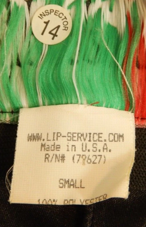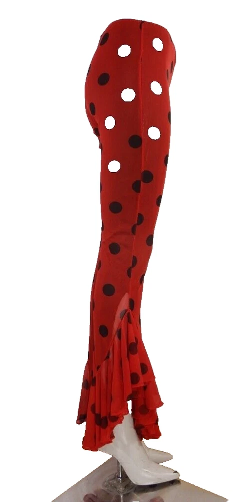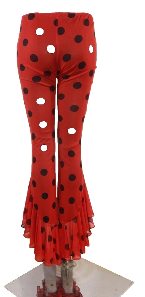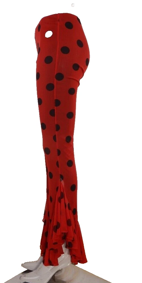 Vintage Lip Service pants, elastic waist. Low rise (7.5"). Inseam crotch to bottom of ruffle is 33". All the polka dots are black, for some reason some of them showed up white in the photos even though they aren't reflective that I can tell.