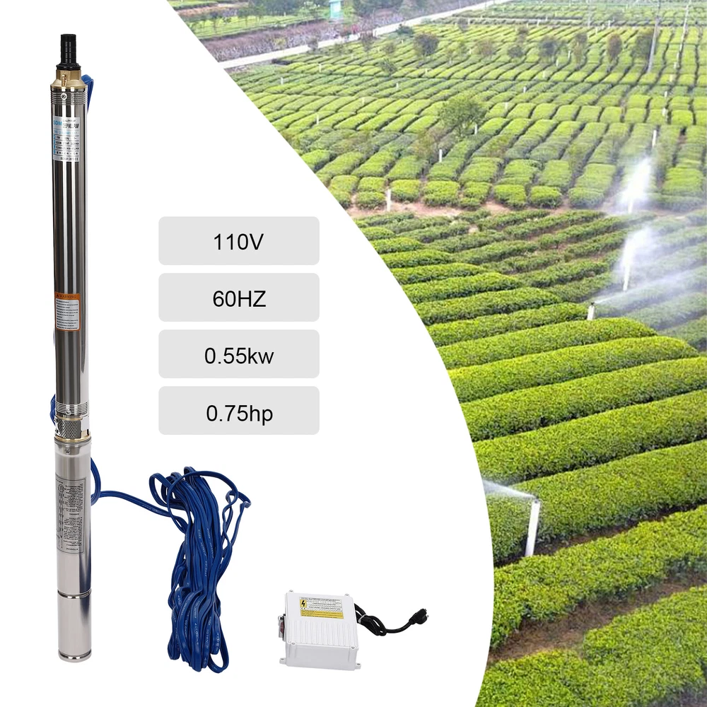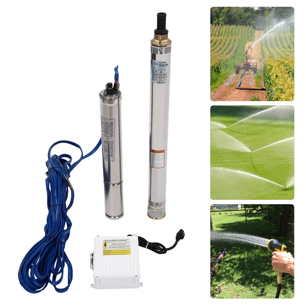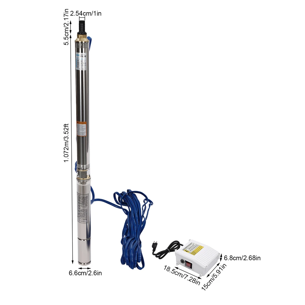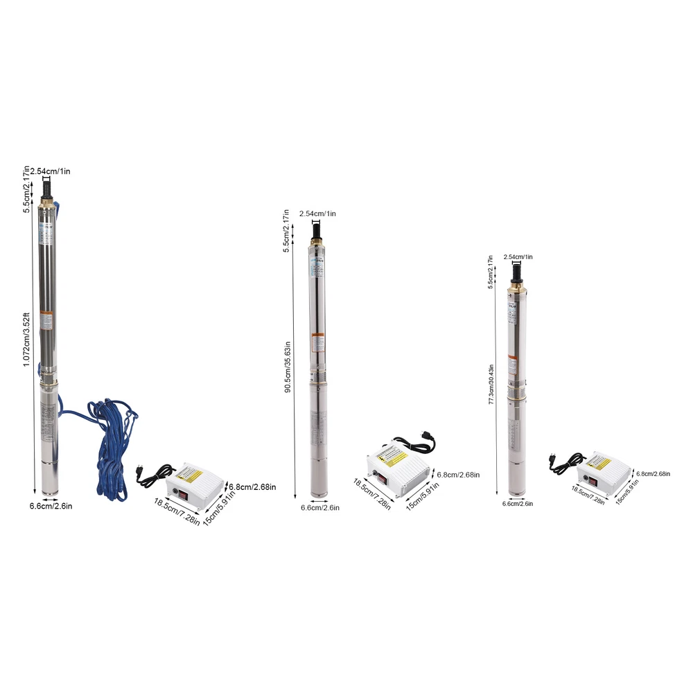 Type: 2.5SDM1.5/17 Power: 0.55KW(0.75HP) Delivery Lift: 13m/42.65ft, 43m/141ft, 60m/196.85ft Flow Rate: 5L/1.32gal/min, 25L/6.6gal/min, 45L/11.89gal/min Gross Weight: 12.5kg/27.56lbs Package Size: 96.5*26.5*11cm/37.99*10.43*4.33inch Product Size(D*H): 6.6*107.2cm/2.6*42.2in Type: 2.5SDM1.5/8 Power: 0.25KW(0.33HP) Delivery Lift: 6m/19.69ft, 21m/68.9ft, 28m/91.86ft Gross Weight: 9kg/19.84lbs Package Size: 105*11*20cm/41.34*4.33*7.87inch Product Size(D*H): 6.6*77.3cm/2.6*30.43in Type: 2.5SDM1.5/12 Power: 0.37KW(0.5HP) Delivery Lift: 9m/29.53ft, 32m/105ft, 41m/134.5ft Gross Weight: 10.2kg/22.49lbs Package Size: 125*20*11cm/49.21*4.33*7.87inch Product Size(D*H): 6.6*90.5cm/2.6*35.63in Package Included 1* Submersible Pump 1* Water Outlet 1* Control Box 1* English Manual 91.86/134.5/196.85 FT Deep Well Submersible Pump 1" Stainless Steel Water Pump Description If you're looking for an efficient and simple irrigation solution, take a look at our submersible pump, a jewel in the world of irrigation technology for its performance and ease of operation. This submersible pump's unique design of deep water and silent operation quietly provide your farmland with a constant supply of living water, making every inch of soil come alive, which is undoubtedly the ideal choice for scientific irrigation and improved agricultural efficiency. Key Features Build to Last : It is made of high-quality stainless steel, copper, plastic, and rubber, and adopts a polishing process, making it solid, and not prone to rust and corrosion, so it can remain beautiful and practical for a long time. High Efficiency: The 0.55/0.25/0.37KW submersible motor, 3420rpm speed, maximum 11.89gal flow rate with 17 impellers as well as a diffuser and intake screen make your pumping and watering work faster and easier. Large Delivery Lift: The maximum lift of the pump is 196.85/91.86/134.5ft, which allows you to irrigate farmland, fish ponds, and orchards for a long distance, saving the time and cost of manual transportation. Easy to Clean: Thanks to its smooth surface and simple structure, and it is used to work in water, so it is very easy to clean. Space-saving: Vertical construction and compact dimensions allow it to be used or stored in the trunk of a car without taking up too much space. Simple Installation: Simple construction and a detailed English manual make it easy to put together and get up and running quickly. Protective Package: Our product is packaged with a sponge to maximize protection from damage during shipping. Customer Service: We aim to provide quality products and services. If you have any problems, please feel free to contact us. We will reply and solve the problem for you as soon as possible. Details Standard Water Outlet: The pump adopts a 1-inch large diameter water outlet, which can be matched with different types of water pipes and is very practical. Long Cable: The 65.62ft long cable increases safety and convenience for you. Application This product is suitable for extracting groundwater from deep wells, and can also be used in water-lifting projects of rivers, reservoirs, canals, and so on. It can be used for farmland irrigation, and water for humans in mountainous areas, villages, homes, farms, campervans, cities, factories, and railways. Specifications Material: Stainless Steel, Copper, Plastic, Rubber Color: Silver and Blue Process: Polishing Assembly Required: Yes Power Source: Corded Electric Plug Type: US Standard Voltage: 110V, 60Hz Speed: 3420rpm Number of Impellers: 17 Outlet Diameter : 2.54cm/1in Cable Length: 20m/65.62ft Control Box Size: 18.5*15*6.8cm/7.28*5.91*2.68in Water Outlet Size(D*H): 2.54*5.5cm/1*2.17in Type: 2.5SDM1.5/17 Power: 0.55KW(0.75HP) Delivery Lift: 13m/42.65ft, 43m/141ft, 60m/ 196.85ft Flow Rate: 5L/1.32gal/min, 25L/6.6gal/min, 45L/11.89gal/min Gross Weight: 12.5kg /27.56lbs Package Size: 96.5*26.5*11cm/37.99*10.43*4.33inch Product Size(D*H): 6.6*107.2cm/2.6*42.2in Type: 2.5SDM1.5/8 Power: 0.25KW(0.33HP) Delivery Lift: 6m/19.69ft, 21m/68.9ft, 28m/ 91.86ft Gross Weight: 9kg /19.84lbs Package Size: 105*11*20cm/41.34*4.33*7.87inch Product Size(D*H): 6.6*77.3cm/2.6*30.43in Type: 2.5SDM1.5/12 Power: 0.37KW(0.5HP) Delivery Lift: 9m/29.53ft, 32m/105ft, 41m/ 134.5ft Gross Weight: 10.2kg /22.49lbs Package Size: 125*20*11cm/49.21*4.33*7.87inch Product Size(D*H): 6.6*90.5cm/2.6*35.63in Package Included 1* Submersible Pump 1* Water Outlet 1* Control Box 1* English Manual Notes Please check that the voltage and frequency correspond to local standards before ordering. Please do not use it without water. Please note that the pump needs to be installed vertically. Please note that the pumping speed is related to the depth at which the water pump enters the water, and the deeper the depth, the lower the speed. Please note that this product is only suitable for pumping clear water, not oil, chemical raw materials, and other liquids. Please read the operating manual and label completely before use, and pay particular attention to the safety instructions included. Please allow the slight color difference caused by the shooting light and 1-3cm error due to manual measurement, and make sure you do not mind before ordering. Payment Delivery details Terms of sales About us Contact us Payment We accept ebay payment 。 Fees such as import duties, taxes are not included in the item price or shipping costs. These charges are the buyer's responsibility. Delivery details Shipping: 2-9 working days to: USA Terms of sales We maintain high standards of excellence and strive for hundred percent customer satisfaction. Feedback is very important to us. We hope that you contact us immediately before you give neutral or negative feedback, so that we can address your concerns. It is impossible to address issues if we do not know about them! About us Your satis faction is our ultimate goal. We work hard to earn your trust and future business. Our certified technicians have tested each item before shipping. The unit 
