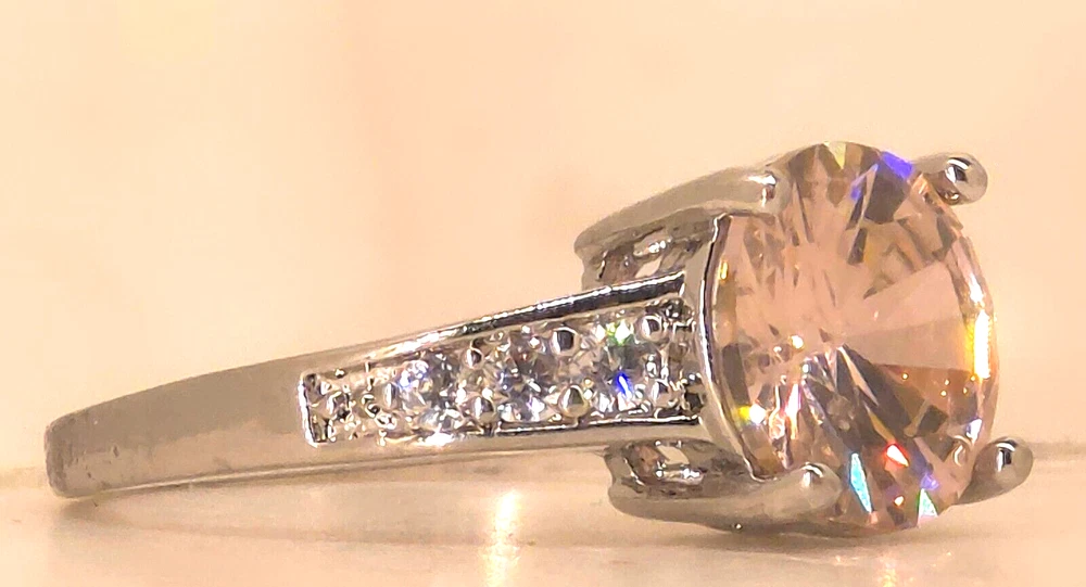 This is a stunning cocktail ring featuring a round pink Cubic Zirconia main stone with a width of 9.7mm. The ring is silver plated and set in a prong setting style. It is designed for special occasions like engagements, weddings, anniversaries, birthdays, and more. With a band width of 2mm and a size 7 fit, this ring exudes beauty, art, and love. Perfect for anyone who loves pink and wants to make a statement.