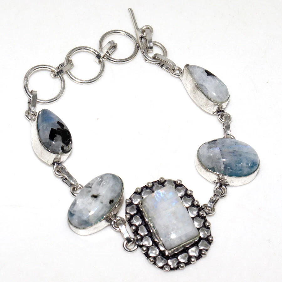 925 Silver Plated Rainbow Moonstone Ethnic Bracelet Jewelry Size 7.5" JW
