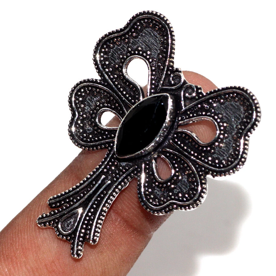 925 Silver Plated-Black Onyx Ethnic Butterlfy Ring Jewelry US Size-9.5 JW