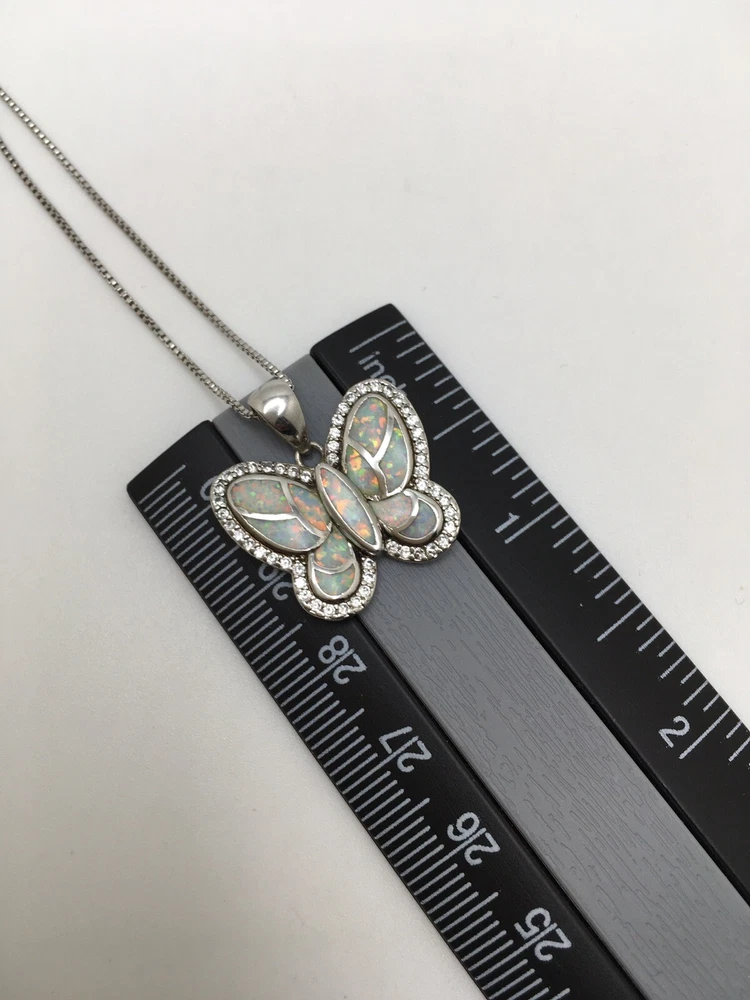 925 Sterling Silver 1” White Fire Opal Butterfly Pendant Necklace 18" #1810 Unknown origin of stones. Could be lab created. Hand polished. Previously owned. Measuring Tools & display not included. Combined Shipping! 1st item $4.59, each additional item is $1. Max shipping cost $10. Combine shipping for up to 7 days! We value YOU! Items are returnable and fully refundable! SilverSchark began as a hobby that grew into a business. We take old retired sterling silver jewelry and revitalize it to wearable condition. Utilizing an ultrasonic machine with sterling silver solution most items are restored to their original beauty. Occasionally scratches are buffed out and some minor repairs are made to bring these tired pieces back to life. Diamonds are always tested. If a piece is not stamped or is suspected of not being sterling silver, the item is acid tested for confirmation. Tests will always be listed in the description. We understand that patina is desired on vintage or antique items so some of the listings will not be cleaned and polished. The description of each listing will tell its tale of restoration. Combined shipping is always welcome! Just ask for an invoice if your cart doesn't look correct. Max shipping cost is $10 per shipment regardless of number of items!