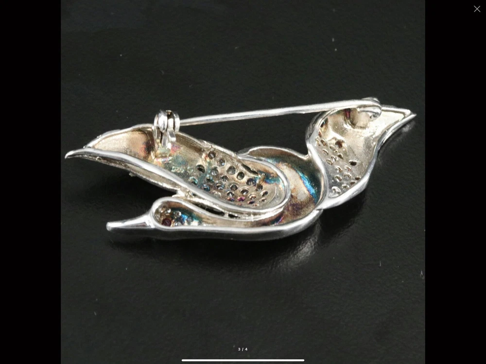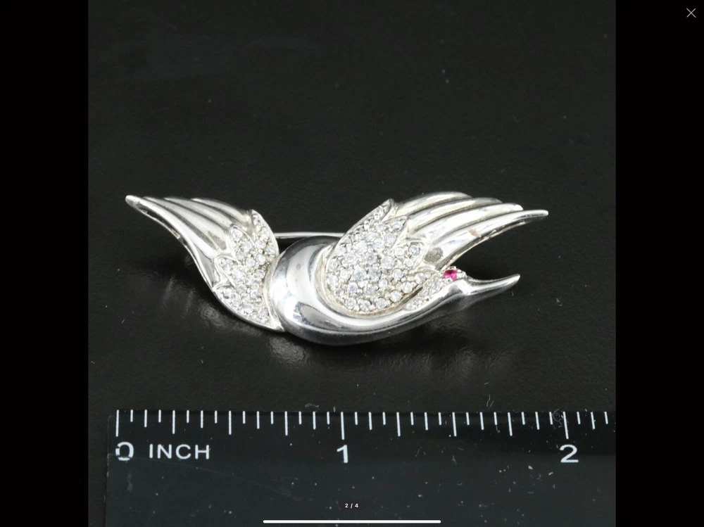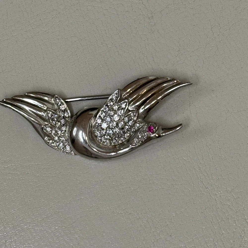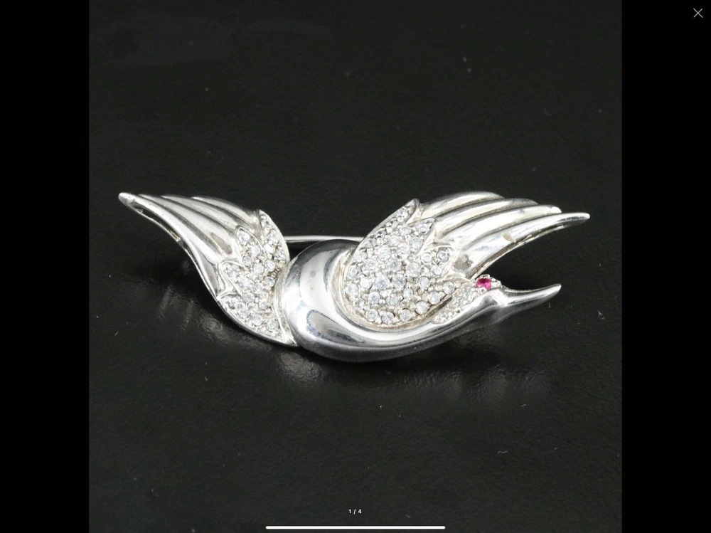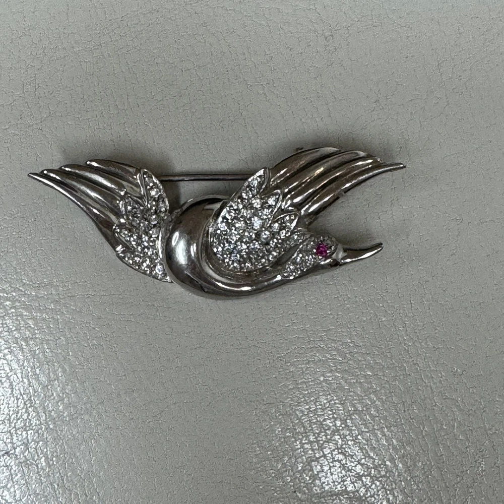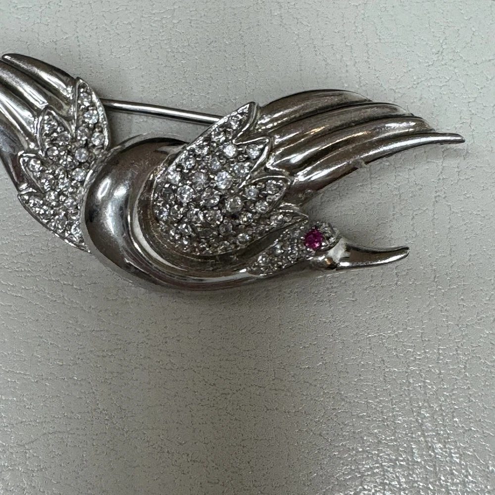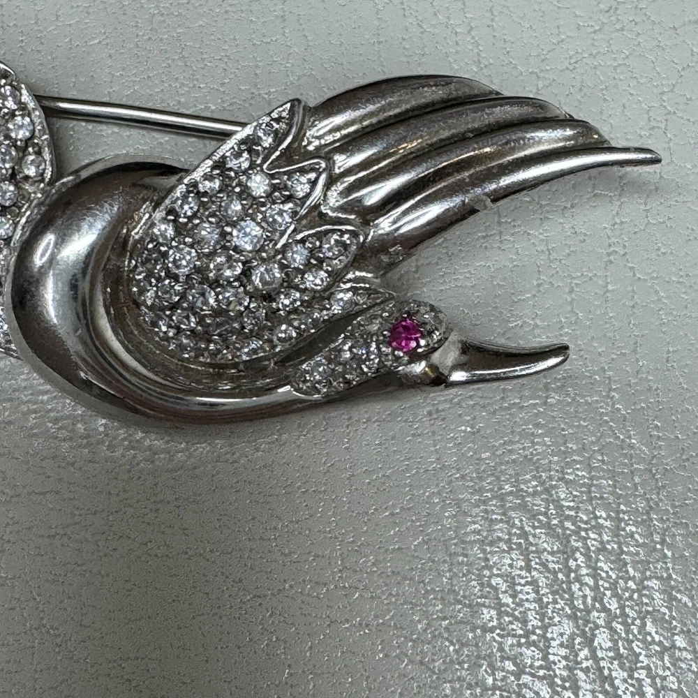 Title: Vintage Sterling Silver Flying Goose Brooch, Lab Ruby & CZ, Bird Pin Description: This vintage sterling silver brooch features an elegant flying goose design, adorned with shimmering cubic zirconia (CZ) and a striking lab-grown ruby eye. The graceful curves and sparkling stones give this piece a timeless charm, perfect for collectors and jewelry lovers alike. • Material: Sterling Silver (Hallmarked S 925 CI) • Weight: 7.80 grams • Closure Type: Locking C-Clasp • Stone Type: Lab-Grown Ruby & Cubic Zirconia (CZ) • Condition: Good This piece is a wonderful addition to any vintage jewelry collection and a great statement accessory. Shipping & Policies: • I ship within 24 hours (excluding weekends and holidays). • Combined shipping available for two or more items—just ask! • Check out my shop, Vintage Wowzers, for more unique treasures. I list new items daily, so follow me and come back often! Thanks for shopping with me! Have a wonderful day. xoxo, Vintage Wowzers FEBEBTH42
