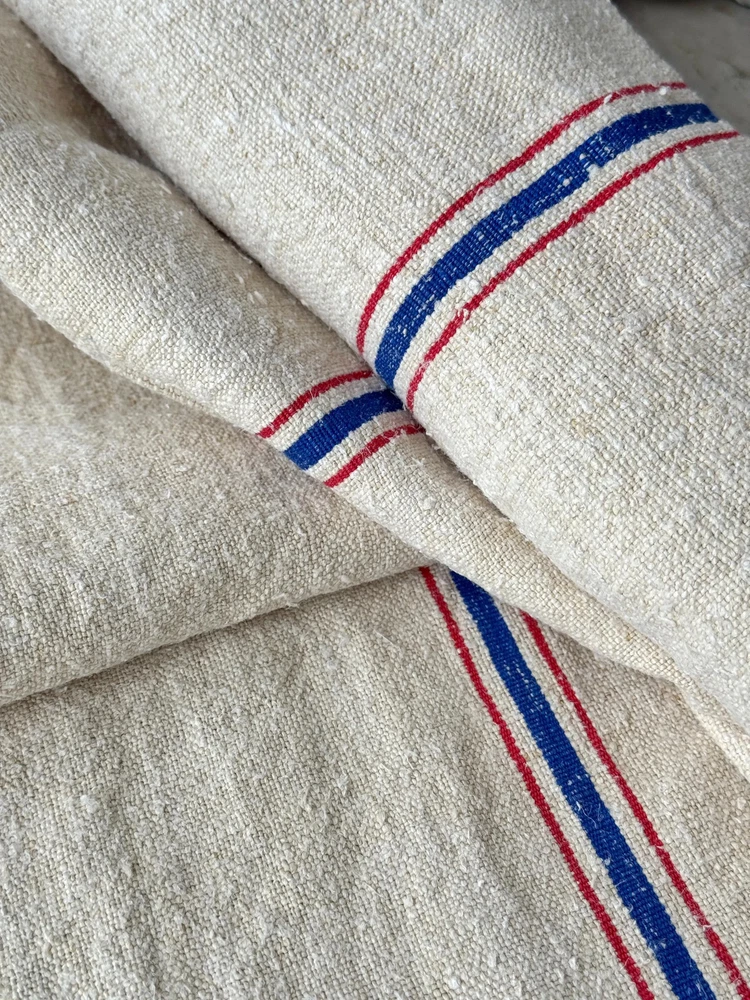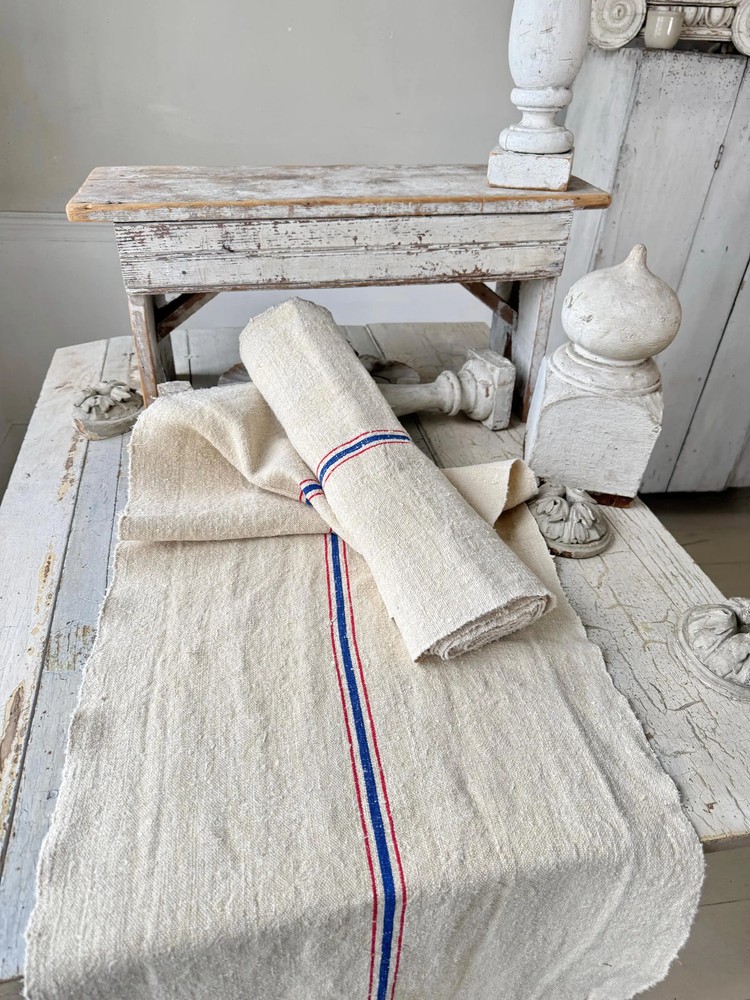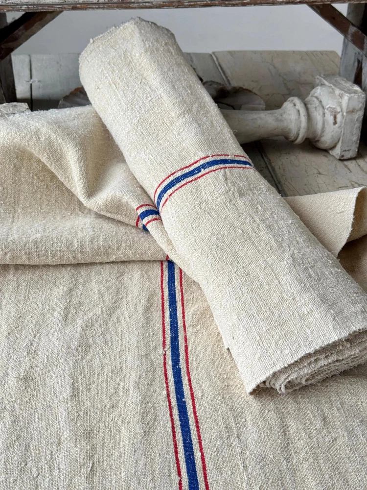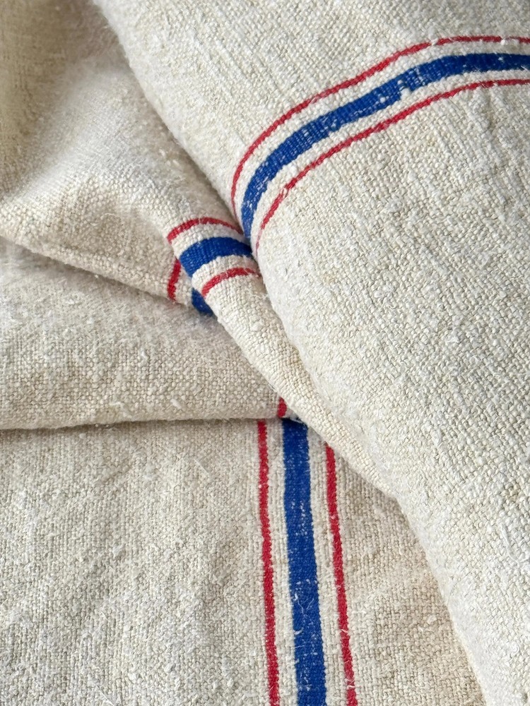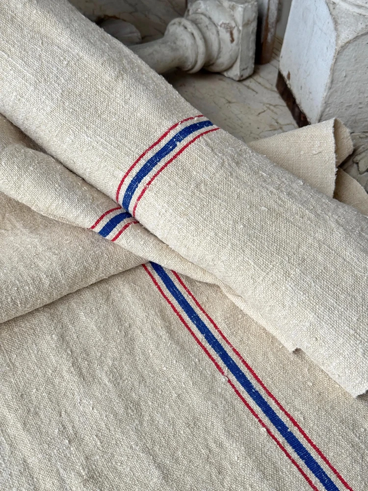 Welcome to The Textile Trunk ~ please follow us on ! We are ~ A very early fabric, hand woven sometime around 1900-1920 ~The stripes are stunning ! Super durable, gorgeous blue red stripes~ this fabric was meant to last many many generations. I've used this wonderful fabric in my home for over 28 years now, the pieces that I've washed over and over and over, still look like they did 28 years ago. It's a remarkable textile~ ~~*~ Nubby and floppy ~ This bolt is ideal for window treatments, table runners, pillows, upholstery etc! ~ Wonderfully high quality. I love knowing these linens were grown without the use of pesticides, just lovely natural fabric. It took the average weaver an entire night to weave only 21 inches! The time invested in this fabric is simply mind boggling and that is after they grew the fibers , retted them, spun them, died the stripe threads and THEN woven them. These are treasures beyond belief ~*~ ~ ~*~ *~ This wonderful textile was originally woven for grain sacks in rural French homes, where sturdy cotton and hemp fabrics were made to withstand years of heavy use. This length is the unused portion that was never stitched into a sack — it would have been carefully tucked away in a dowry chest, saved for future household needs. Textiles like this were treasured and used thoughtfully, and today they’re ideal for ecofriendly living, offering a sustainable way to bring authentic vintage character into the home while reusing materials that were made to last. MEASUREMENTS : This bolt measures 9.25 yards long by 20 inches wide ~~ CONDITION : I've freshly laundered this bolt and it's ready to use ~ there are some pale blue marks from dye transfer, quite small and some pale storage marks ~ ~ Light signs of time and use often inherent in these wonderful bolts ~ any and all condition is reflected in the price ~ Inventory : EL 555