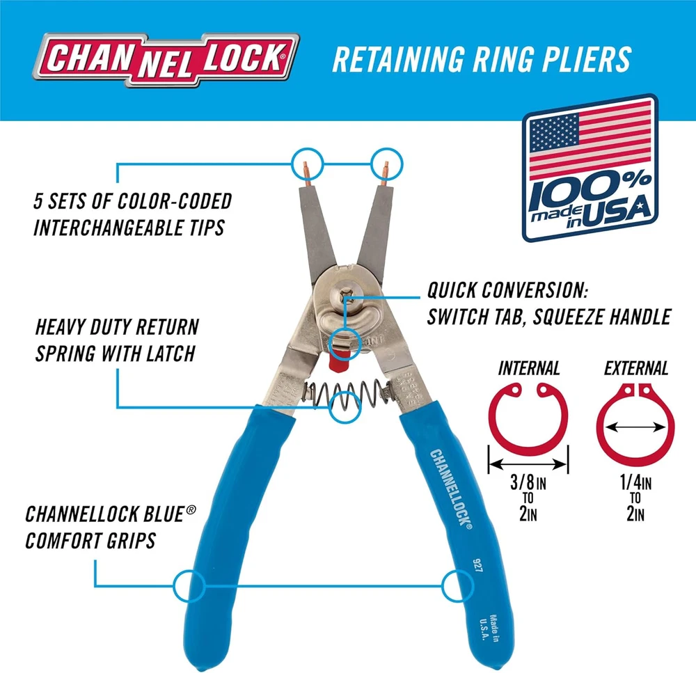Store New Arrivals Add to Favorite View Feedback Contact 927 8-Inch Snap Ring Plier | Precision Circlip Retaining Ring Pliers Description Item model number 927 Style 8-Inch Retaining Ring Plier Power Source Hand Powered Pattern Snap Ring Plier National Stock Number 5120-01-624-1371 Country of Origin USA Grip Type Ergonomic Batteries Included? No Batteries Required? No Warranty Description Lifetime warranty. All tools are 100% guaranteed against breakage and failure. Product Dimensions 14.7"L x 4.9"W Pattern Name Snap Ring Plier Is Discontinued By Manufacturer No Specific Uses For Product Gripping Item Package Quantity 1 Item Weight 8.96 ounces Part Number CHL927 Color Factory Global Trade Identification Number 00025582566614 Handle Material Alloy Steel Included Components - Hd Retaining Ring Plier (927) Size 8-Inch QUICK CONVERSION by a simple switch of the tab, easily remove or apply both internal and external rings INTERNAL ring diameter range of 3/8 to 2-inch and EXTERNAL ring diameter range of 1/4 to 2-inch INTERCHANGEABLE TIP KIT includes: .039, .047, .074 straight and .039, .047 90-degree CHANNELLOCK BLUE grips for comfort 100% MADE IN USA Product Description The CHANNELLOCK® 927 8" Retaining Ring Pliers easily convert from working with external to internal snap rings with a simple switch of a tab. The heavy duty return spring reduces hand fatigue and provides increased accuracy when applying or removing snap rings. CHANNELLOCK® Retaining Ring Pliers are 100% made in USA and include 5 pairs of interchangeable tips. From the Manufacturer The Channellock 927 - 8-Inch Retaining Ring Plier - has a capacity of 1/4-Inch to 2-Inch external, and 3/8-Inch to 2-Inch internal. It includes tips: .036, .047, .070 straight. .036, .047 90°. This 8-Inch Retaining Ring Plier converts from internal to external rings with a simple switch of the red tab and has a heavy duty return spring. It is heat treated for longer life. Sealed air pocket CHANNELLOCK BLUE comfort grips. ABOUT US We offer the best prices around on high quality products. Our E-store includes media such as books, movies, music and games while offering electronics, toys, sporting apparel, clothing, tools, general home, garden items and more. SHIPPING We are always working hard to ensure your package arrives as soon as possible. Please understand that some factors like weather, high postal traffic, and the performance of shipping companies are outside of our control. We offer free shipping to the lower 48 states and ship within 2 business days of payment, usually sooner. We do not accept P.O. Boxes. Please provide a physical address. RETURNS We offer a 30-Day Return Policy on items which you are not completely satisfied with. You have the option for a full-refund or an exchange of the item. No returns are available on items shipped outside of the USA. PAYMENT We accept PayPal. CONTACT US This page content is yet to come Please ad us to your favorite seller and visit again later Thank You CUSTOMER SATISFACTION We try our very best to make sure every customer is completely satisfied. If there's a problem, message us! We're happy to help.