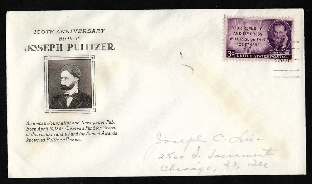 #946 3c Joseph Pulitzer - Grimsland FDC Addressed with partial cancel Issued 4/10/47 New York, NY Combined shipping for additional Stamps/Sheets/FDC's. Highest plus $0.25 per item on Store purchases or auctions closing within next 7 days. carefully packed to prevent bending in shipment. Please wait for combined invoice when purchasing multiple items.