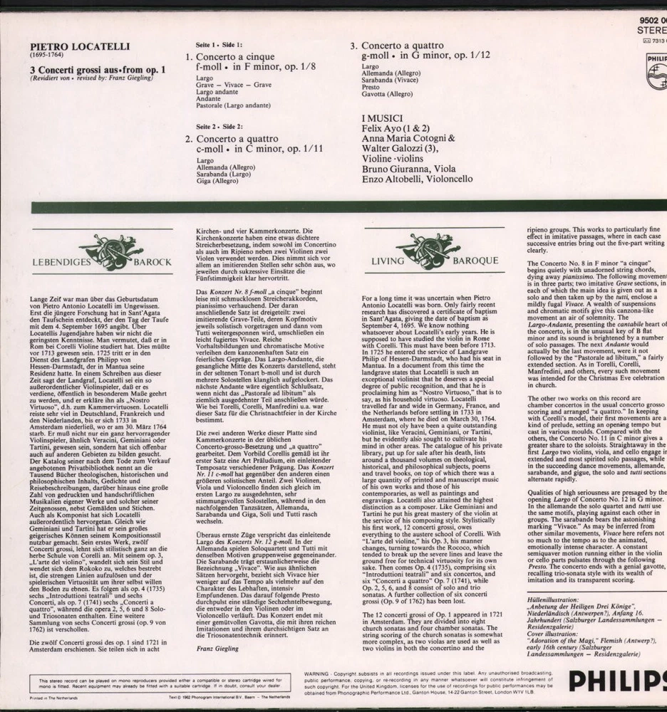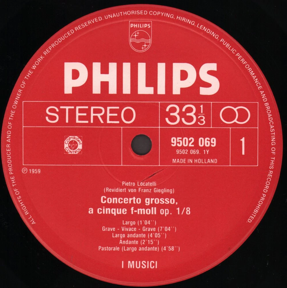GRADING Our Grading System The table below is an overview of how our grading system works. The first grade is for the sleeve and second grade is for the media/disc, e.g. VG+/EX means that the item's sleeve is in Very Good Plus condition and the media/disc is in Excellent condition. If there is only one condition, e.g. /EX, it means that the item is not in a picture sleeve and that the media/disc is in excellent condition. Records that aren't in picture sleeves will either be in a company sleeve or a generic plain sleeve. If you have any questions, please get in touch. Condition Sleeve Media MINT (10/10) Mint, perfect Mint, perfect EX+ (9/10) Excellent plus, near mint Excellent plus, near perfect EX (8/10) Excellent, well looked after, clean, only slight signs of use Excellent, well looked after, clean, only slight signs of use EX- (7/10) Excellent minus, light wear and signs of use Excellent minus, light wear and signs of use VG+ (6/10) Very good plus, some moderate wear Very good plus, some scuffs, no deep marks VG (5/10) Very good, well used and worn Very good, well used and marked VG- (4/10) Very good minus, very worn Very good minus, very worn and marked GOOD (3/10) Good, some major wear Good, some major wear and scuffing FAIR (2/10) Fair, major wear Fair, major wear and scuffing POOR (1/10) Poor, severe wear Poor, severe wear and scuffing DELIVERY Combined Postage If you add all the items you wish to purchase from us to your shopping basket/cart, and then go to the checkout page from the shopping basket page, the shipping cost will be automatically combined. Packaging All of our items are parcelled using strong specially designed packaging, each vinyl in an order is placed in a clear plastic sleeve and plain paper white sleeve, and is separated from its cover (unless it is advertised as sealed), to prevent any damage during transit. If an item is sealed, and you would prefer the vinyl to be placed outside of its sleeve before dispatch, please let us know. Prices You can see all delivery options and prices for an item on the "Postage and payments" tab. Tracked delivery If you wish to have a tracking number with your order, please select the "Signed" or "Express" delivery option, "Standard" delivery does not include a tracking number. SHOP Click here to view our Ebay shop, with over 200,000 items in stock FAQ Does a used item include the original inner sleeve/insert/poster etc.? We will always include in the description if a used item includes any additional parts, e.g. "with inner" or "includes poster", if you know an item originally came with any additional parts, such as a printed inner sleeve, and it isn't mentioned in the description, then generally the used item won't include it, but please feel free to ask. New items will always be complete, unless otherwise specified. CATEGORIES Shop Home 10" Vinyl Records 12" Vinyl Records 7" Vinyl Records Cassettes (Tape) CDs (Compact Discs) LP Vinyl Records Music Memorabilia Other Artist I Musici Title Locatelli - 3 Concerti Grossi Op. 1 Format LP Vinyl Country Netherlands Label Philips Catalogue Number 9502069 Description 14 track stereo - embossed sleeve has small creases next to spine Condition (Sleeve/Disc) VG+/EX Track List Concerto A Cinque F-moll • In F Minor, Op. 1/8 - A1. Largo (1:04) - A2. Grave - Vivace - Grave (7:04) - A3. Largo Andante (4:05) - A4. Andante (2:15) - A5. Pastorale (Largo Andante) (4:58) Concerto A Quattro C-moll • In C Minor, Op. 1/11 - B1. Largo (2:55) - B2. Allemanda (Allegro) (2:00) - B3. Sarabanda (Largo) (2:13) - B4. Giga (Allegro) (3:08) Concerto A Quattro G-moll • In G Minor, Op. 1/12 - B5. Largo (2:10) - B6. Allemanda (Allegro) (2:55) - B7. Sarabanda (Vivace) (2:39) - B8. Presto (1:37) - B9. Gavotta (Allegro) (3:27) DELIVERY INFORMATION If you wish to have a tracking number with your order, please choose the Signed or Express delivery option, the Standard delivery option does not include a tracking number. Please note, the Express option for delivery outside of the UK includes a tracking number, but has the same delivery time as the Standard option. WE HAVE MORE I MUSICI ITEMS IN STOCK We have more items in stock by this artist, click here to see them. ABOUT US Vinyl Tap has been in the business of selling music for over 30 years, and in that period we have supplied many thousands of collectors and music fans around the globe with vinyl, CDs and music memorabilia. You can check out the over 200,000 items that we have in stock on our Ebay shop, here . Artist: I Musici - Title: Locatelli - 3 Concerti Grossi Op. 1 - Format: LP Vinyl - Country: Netherlands - Label: Philips - Catalogue Number: 9502069 - Year: - Description: 14 track stereo - embossed sleeve has small creases next to spine