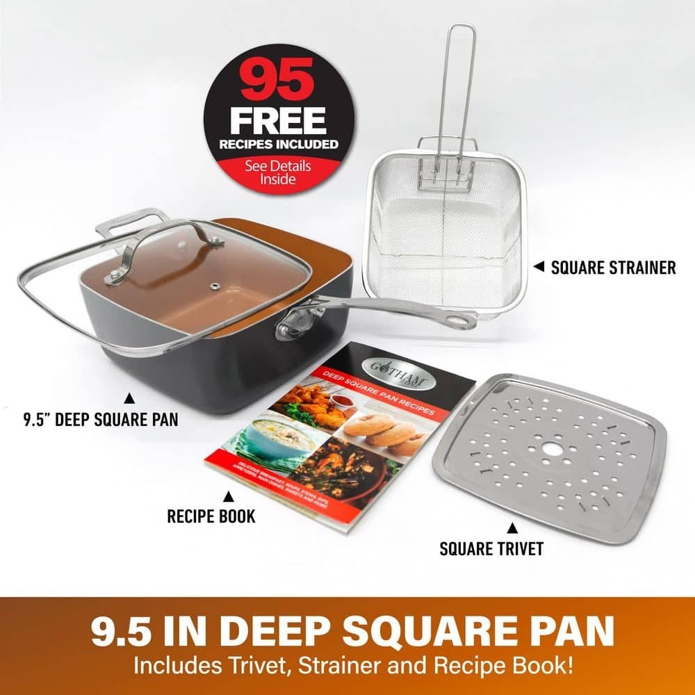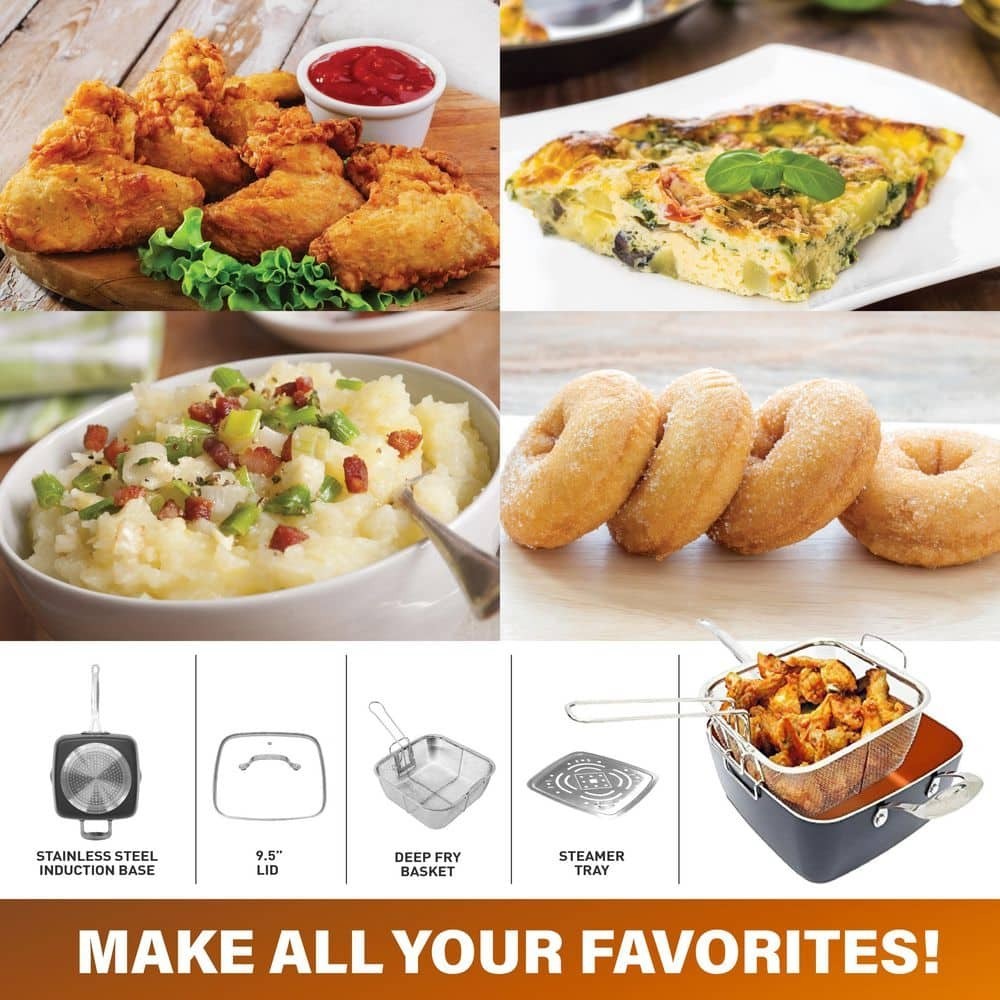 9.5 in. Ti-Ceramic Non-Stick Deep Fry Pan 4-Piece Cookware Set About This Product This 9.5 in. deep square fry pan set is designed for maximum versatility and durability in the kitchen. Coated with a high-performance titanium-ceramic nonstick surface, it allows for easy cooking and effortless cleanup—perfect for frying, steaming, searing, or baking. The nonstick surface resists sticking, even with stubborn foods like burnt cheese or chocolate, and doesn’t alter food flavor when cooking acidic ingredients like tomatoes. Built to handle high heat and daily use, this pan resists warping and is safe for use with metal utensils. Highlights Complete Set: Includes 9.5 in. deep square fry pan with glass lid, frying basket, and stainless steel steamer tray Triple-Layer Nonstick Coating: Ceramic and titanium-infused for effortless food release and durability Multi-Use: Ideal for frying, steaming, searing, baking, and more High Heat & Oven Safe: Safe up to 500°F; works on all stovetops except induction Ultra Durable: Scratch-resistant coating safe for use with metal utensils Easy Cleanup: Dishwasher safe and rust-proof construction Healthy Cooking: Free from PFOA, PFOS, lead, and cadmium Even Heating: Solid aluminum core with spiral bottom ensures even heat distribution Shipping Policy FREE SHIPPING within the 48 states! We do not ship to Alaska, Hawaii, Puerto Rico, Guam, Virgin Islands. We do not ship to APO/FPO/DPO addresses and P.O. BOXES - please provide a physical address! Your order will be processed within 3-5 business days once the payment has been received. Standard shipping typically takes 3-10 business days depending on the item. We do not offer combined shipping services. Return Policy We offer a 30-Days Return Policy on items which are damaged in transit or defective products from the manufacturer. You have the option of a full refund or an exchange of the item. All returns must be in its original condition as when it was received (include all of the original accessories or items that came with it). Feedback & Contact Us Customer satisfaction is very important to us. If you have any problem with your order, please contact us and we will do our best to make you satisfied. If you have any queries, please contact us via eBay. We usually respond within 24 hours on weekdays. Thank you for shopping with us!