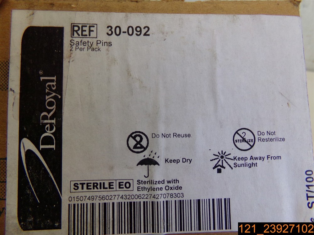 This item is:_______Box of 95 pairs, Deroyal safety pins, large 2", sterile, model 30-092 Includes only what is shown in the picture. Warehouse Location:____ROW 3, SHELF 069_______________________________________ Sales tax will be added to items shipping to locations in Kansas. _____________________________________________________________________ _____________________________________________________________________ _____________________________________________________________________ By bidding and or purchasing this item(s) you (the buyer) agree to the following terms and conditions: 1. An “item” is defined as the following: The unit or units purchased in the ebay listing, (it could be a single unit, multiple units, a mixture of units, a variety of units, the incorrect unit or any combination of units not mentioned). It also includes the packaging, or lack thereof, the shipping label, and any contents place in the package by error. 2. The “Seller” is defined as Seller and/or Consingor. 3. The “buyer” is defined as the entity that purchased the item from Seller and/or Consingor. 4. If the buyer does not agree to these terms and conditions then do not purchase from us. 5. All items are sold “AS IS” No warranty or liability is expressed or implied. 6. The buyer agrees that: All items are shipped without insurance. It is the responsibility of the buyer to let us know if they want insurance on the item. Insurance cost is $2.00 for every $50 insured, in $50 increments. The buyer agrees that if no insurance is purchased and the item is not received or received damaged that no claim shall be brought against the seller. 7. We only ship to PayPal confirmed street addresses, no exceptions. No PO Boxes, APO, FPO or similar addresses. 8. The buer agrees that the sale is considered complete once the carrier has picked up the item from the seller. 9. The buyer agrees that if there is a dispute that arises that the dispute will be settled in the State of Kansas under the laws of Kansas. 10. The buyer agrees that the item fits the buyers purpose prior to bidding. 11. The buyer agrees to indemnify and hold harmless the seller from any and all claims arising out of any conditions or defects for the item or items that they purchased 12. We only ship to the continental United States. The shipping price quoted is for the continental United States Only. All other locations will be charged extra. Out of county buyers agree to pay any additional charges that we ask them to pay including but not limited to import duties, shipping costs, packaging costs, time costs, and other costs. If the item is shipped via ebay global shipping program these terms and conditions still apply. 13. Claims made against the carrier for non-delivery, lost in transit or any other reason shall be made solely by the buyer without aid from the Seller. 14. In the event that any clauses or phrases contained here within are ruled out by a judge, the law, a lawyer, jurors, and or any other entity all others remain in effect. 15. If any claim is brought against the Seller the buyer agrees to pay for any and all costs including legal fees, travel, time, accommodations, and other costs. Late payment will result in the seller charging interest at the maximum legal rate. 16. In any event or circumstance the maximum liability to the Seller is the purchase price plus cost of shipping plus sales tax if applicable. This amount is not subject to inflation, interest, inconvenience fee or any other price adjustment. 17. The buyer agrees there will be no refunds for any reason outside of Ebay’s return policy. 18. The buyer understands that our items are wholesale, overstock, unclaimed, foreclosure purchase or salvage goods. Most boxes have been opened for inspection and photos. If items are listed as new they may not come with original packaging. 19. The buyer agrees that they are trained, licensed, qualified, and understand how to properly use, dispose of and handle the product in accordance with law and regulations. 20. The buyer agrees that if any part of these terms and conditions is determined to be void that it does not void or alleviate the enforcement of the remainder of this contract.