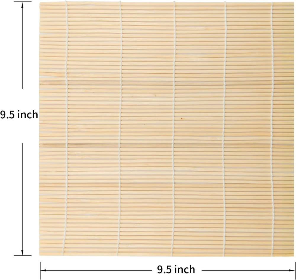 Top quality is guaranteed- crafted exceptionally well. Made of high quality bamboo material, lightweight, durable, all natural, no chemicals and glues. Size: 9.5" x 9.5". Each sushi mats bamboo is made from woven with cotton string, there are no splinters and no unraveling of the cotton string stitching. To extend the lifetime of this product, please make sure it is completely dry after use but don't expose it to high heat. No extra tools are needed, just add rice or other vegetables in the sushi mat, then roll it, and you will get your favorite sushi roll, non stick, easy to use, easy to operate for housewives or beginners. Hosting a sushi party is a fun, hands-on culinary experience that your guests will never forget! You can also cook sushi rolls with your children. It'll teach your kids something new, and develop the fine motor skills of their hands. A great chance to present to your friends or loved ones with something special. Sushi-making is a new experience, one that everyone should try. A compact, unique and useful gift that makes your friends always be cherished! Product Description Safe Material Each sushi roller is made of premium bamboo. The bamboo is renewable source, durable, all-natural, no chemicals or glues Easy to Use No extra tools are needed, just sushi mats can be used to make sushi, saving your money. Perfect for Beginners Making the sushi was very easy, the kit includes everything you need. It also came with a set of bamboo chopsticks which I felt was a nice touch. How to Make a Sushi Roll? Step 1 Spread a strip of plastic wrap over the bamboo mat.Then place a sheet of nori on the plastic wrap. Step 2 Wet your fingers and spread the sticky sushi rice over the nori. Step 3 Add your ingredients toward the center of the rice-covered nori. Step 4 Gently lift the bottom of the mat up and over the sushi.Press and shape the ingredients into a tube.