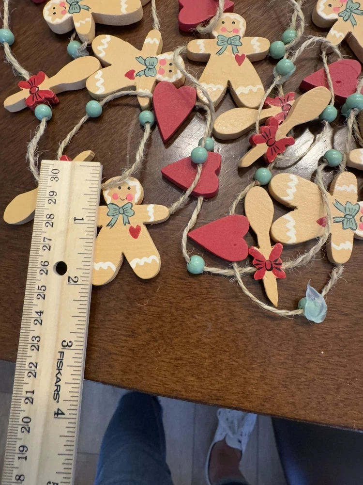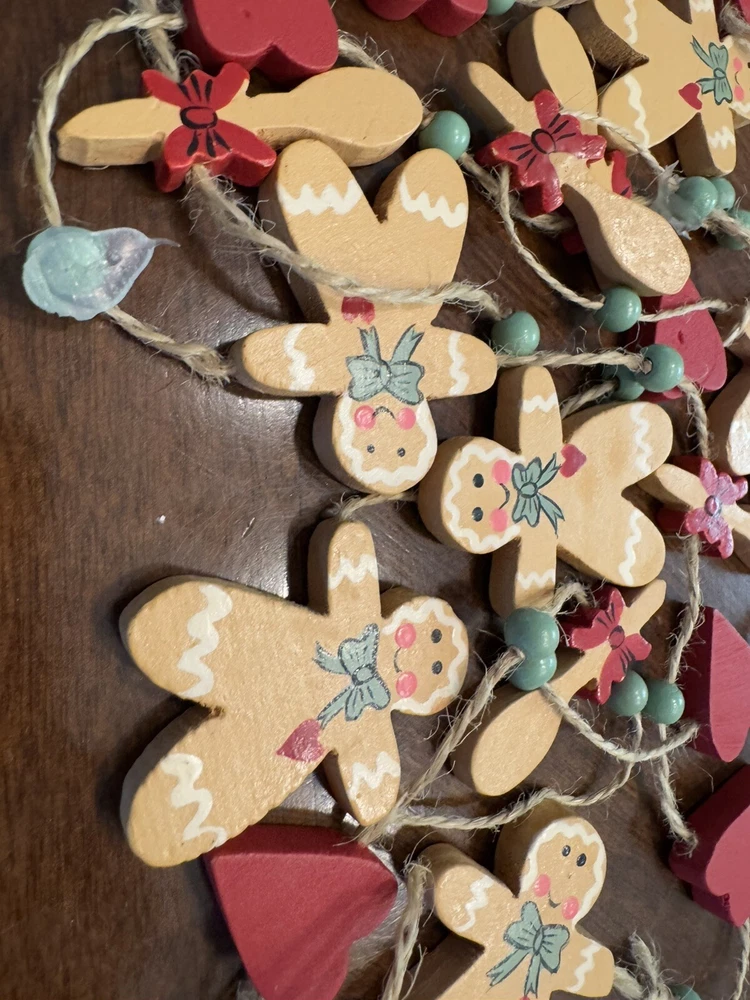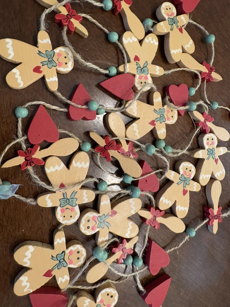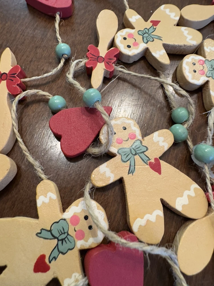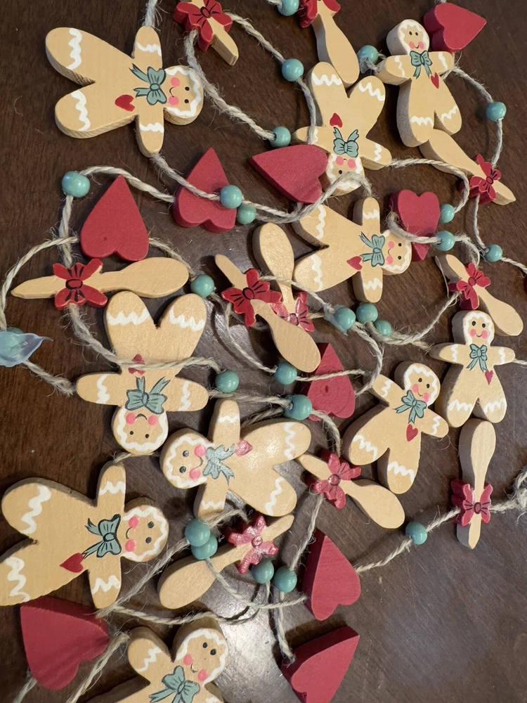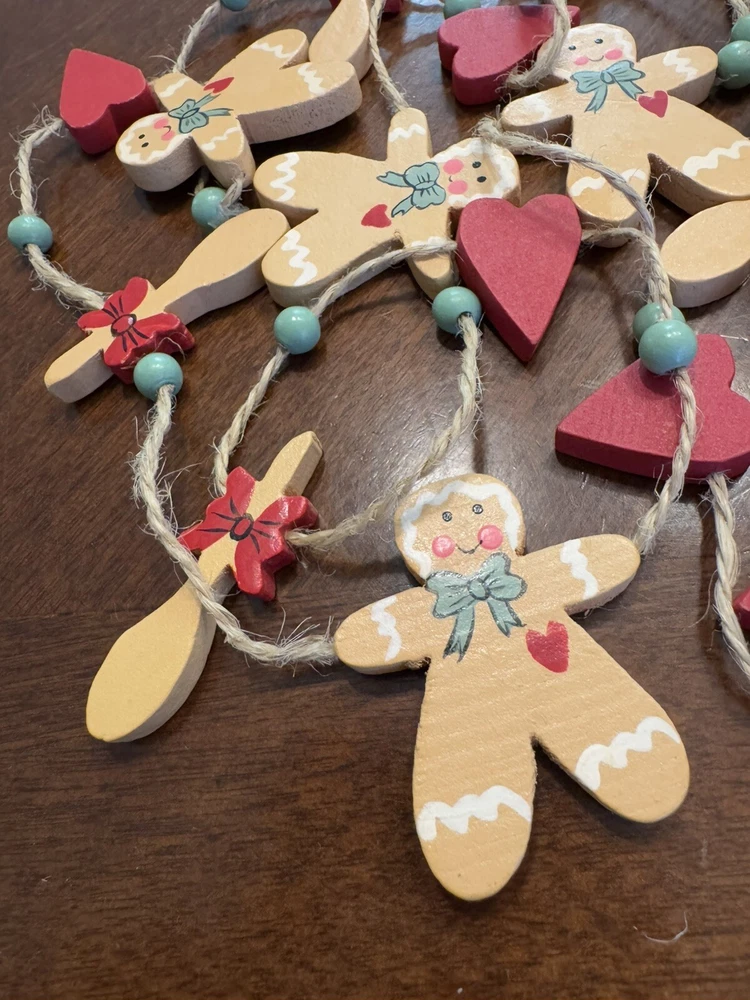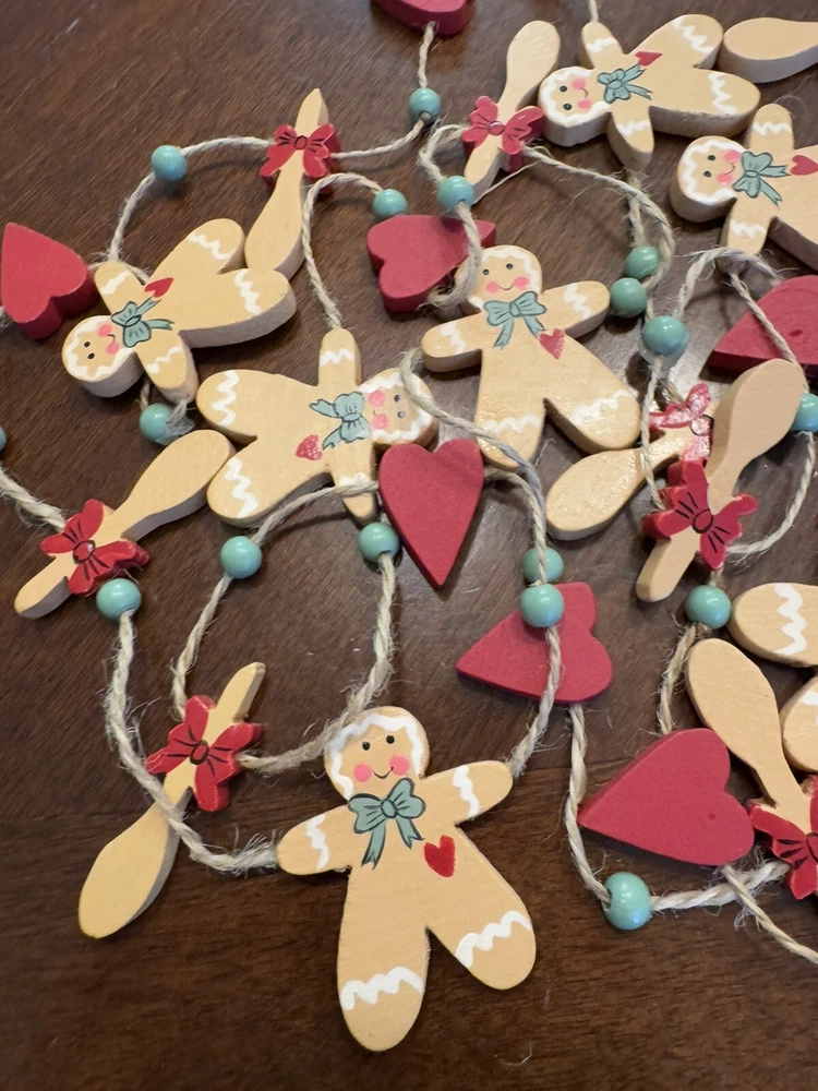 Get into the holiday spirit with this delightful 96" Christmas garland featuring gingerbread men, hearts, and wood spoons. Perfect for adding a festive touch to your home or as a thoughtful gift for loved ones. The garland is made from high-quality materials and is sure to last throughout the holiday season. With its charming design and intricate details, this garland is sure to become a cherished part of your holiday decor. Whether you're using it to decorate your home or as a table centerpiece, this garland is sure to bring joy and cheer to any setting. Smoke Free Home Always happy to combine for shipping savings Please see all photos