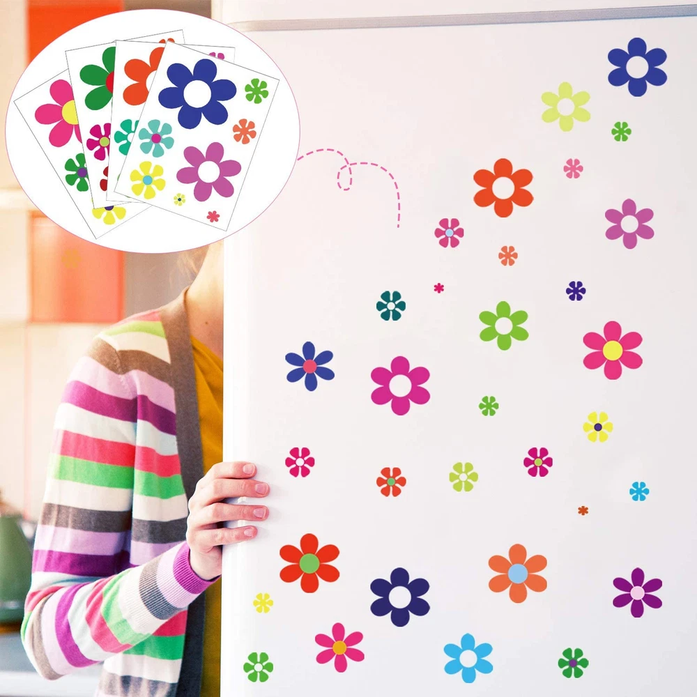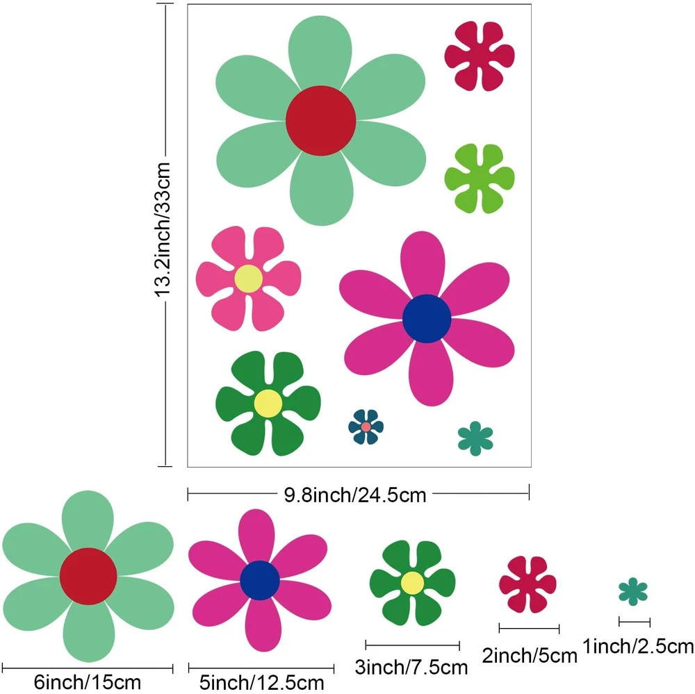 Sufficient quantity: you will receive 96 pieces of colorful daisy stickers in different bright colors, sufficient quantity and various colors for you to decorate your window, laptop, car, notebook and hippie party Appropriate size: the retro flowers stickers contains 5 sizes, 6 inch, 5 inch, 3 inch, 2 inch, 1 inch, they are printed on quality bubble-free vinyl with die cut around edges; Beautiful flower design will provide a good decoration effect to any place you want to stick Delicate and beautiful pattern: these daisy flower decals are all designed with daisy flower shape in different vibrant colors, look lively and lovely, can adorn your car or window to look more delicate and beautiful. Note: Our stickers are in translucent form, please confirm carefully before ordering Reliable Material: our car daisy flower decals are made from high quality vinyl material; They feature adhesive on the back, ensuring they're safe, reliable, and smooth with good stickiness; They're sun-proof and waterproof, not prone to falling off or fading; Rest assured they're designed for long term use; If any residue is left after removing the decal, simply clean it with a damp cloth, or use a hair dryer to melt the adhesive with hot air, then wipe it off with a damp cloth Easy to Paste and Remove: each retro flower decal is easy to stick on smooth surface and remove, you can change the position of each sticker to rearrange it by peeling it off easily, can give you different decorative effect Product Description Waterproof, weatherproof, and durable for outdoor use. Easy to paste and remove, no residue. Adhesive vinyl double-sided printing, non-toxic, no odor.