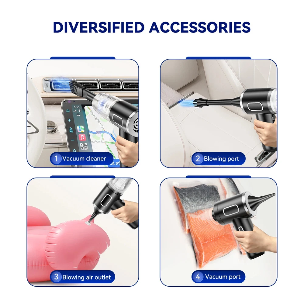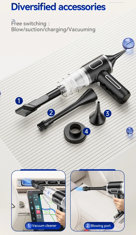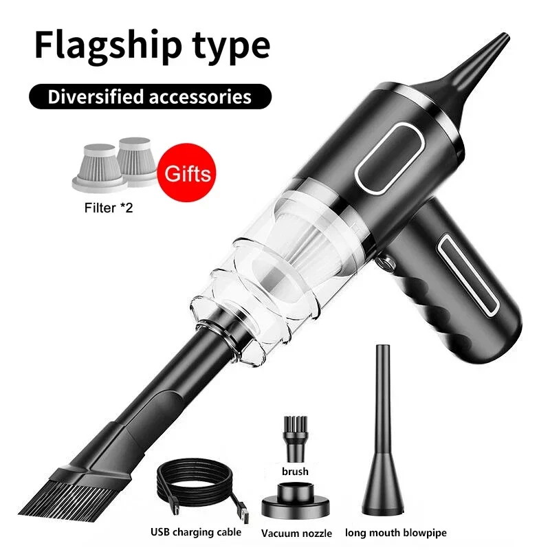 9600000Pa Wireless Vacuum Cleaner 5 in1 Strong clean Automobile Portable Vacuum Clean Handheld For Car Home Office Specification: Rated speed: 45000(r/min) Rated input power: 120 (W) Rated voltage: ≤24V (V) Vacuum suction: 9600000Pa (PA) Battery capacity: 2000mah Noise ratio: ≤70dB Charging time: 3-4hours About this product: 1.【Rechargeable Battery & Fast Charging】This electric vacuum cleaner has a built-in 2000mAh battery with a fast charging port. It can be easily charged using car chargers, power banks, laptop rechargeable batteries and other charging methods. Charging takes only 3 hours. This reusable vacuum cleaner is the perfect replacement for a compressed air tank, environmentally friendly and energy-saving. It also saves money and time. 2.【Powerful Air Duster and Vacuum Cleaner 5-in-1】Our vacuum cleaner has two functions: it can suck, pump, blow and charge. Easily blow away particles such as dirt, crumbs, and dust from surfaces, as well as remove small, stubborn dirt hidden in keyboards, nooks and crannies. 3.【Easy Maintenance】With just one click of removal, you can easily dump the garbage and clean the vacuum cleaner. Hepa filters can be washed and reused, ensuring efficient suction while keeping dust and dirt out and preventing clogging. 4.【Wide range of uses】The cordless vacuum cleaner comes with many different detachable brush head nozzle accessories for cleaning various scenarios. For example, it can thoroughly clean computer keyboards, cameras, air conditioners, sofas, windows, pets, plants, etc. Packing List: 【Double-use for blowing and sucking】: Standard: Vacuum cleaner *1+USB charging cable *1+ brush *1+ long-nosed straw *1+Vacuum nozzle*1+filter element *1 Upgraded: Vacuum cleaner *1+USB charging cable *1+ brush *1+ long-nosed straw *1+Vacuum nozzle*1+filter element *2