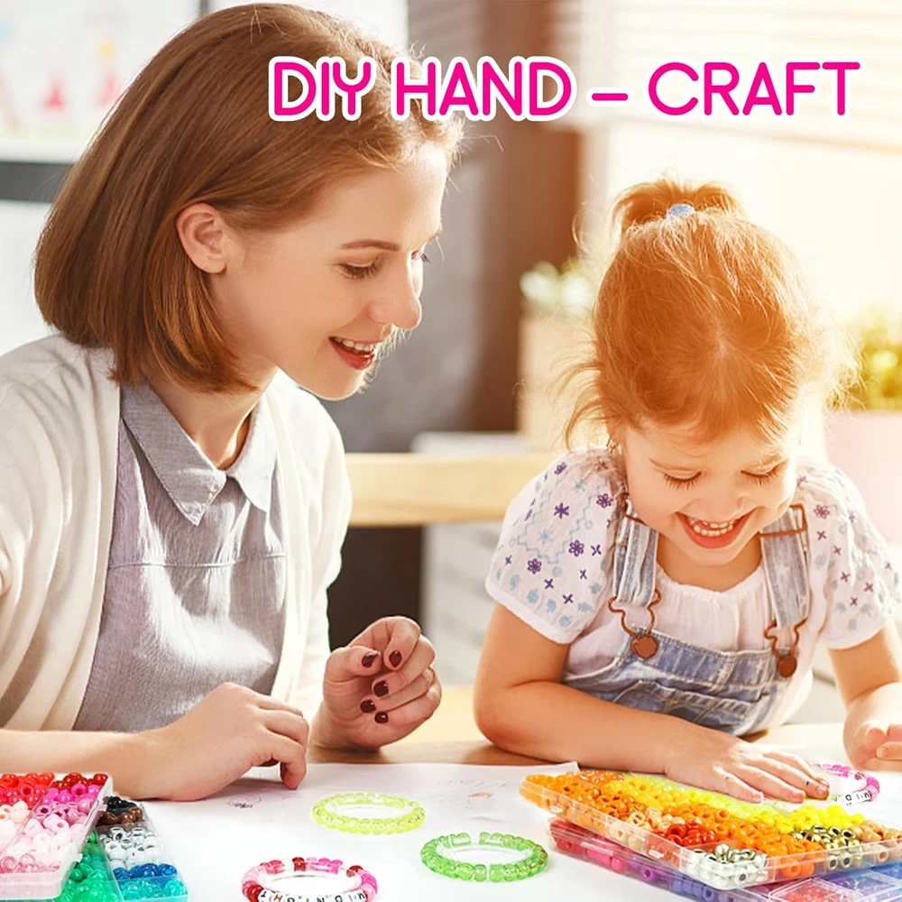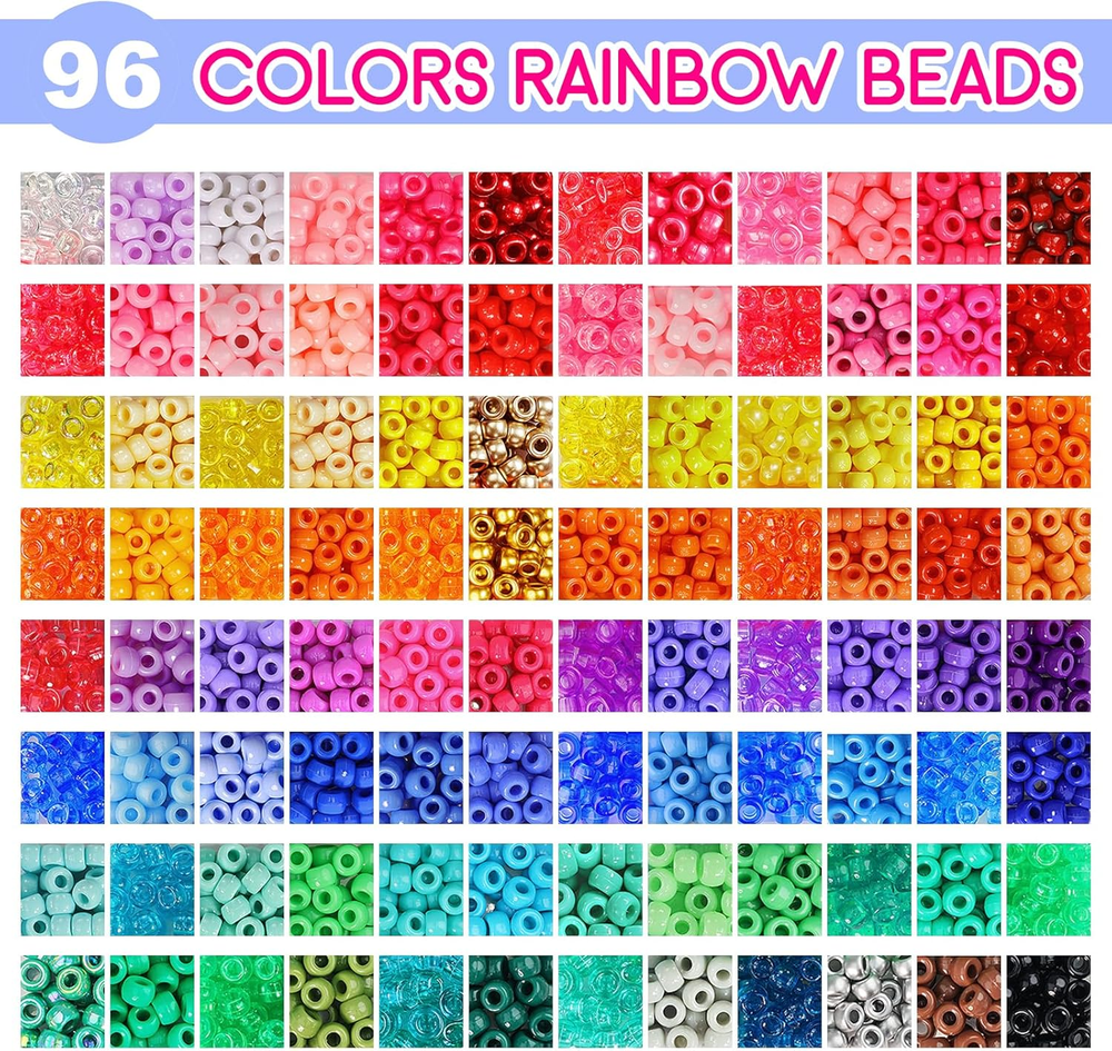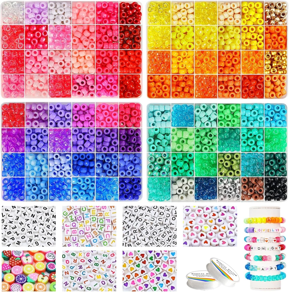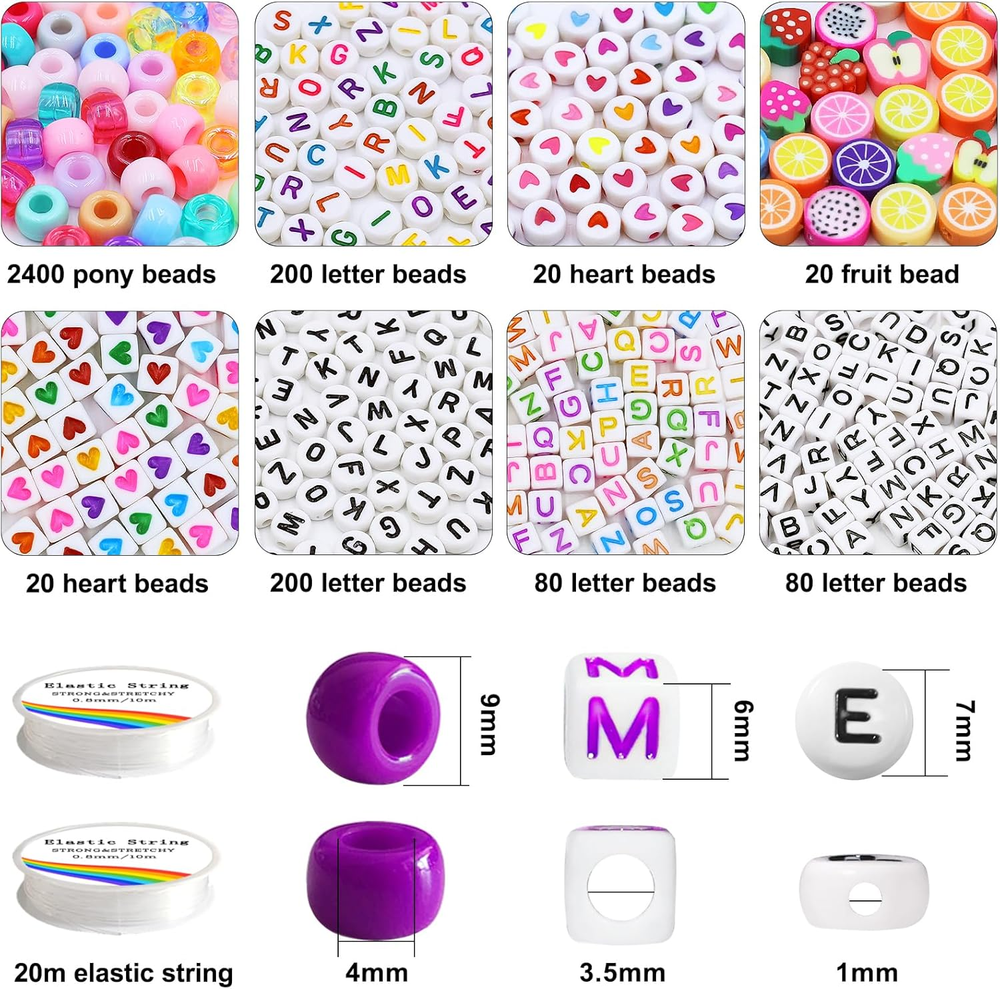 PROPER QUANTITY - 2016pcs Rainbow Pony Beads and 560pcs Letter Beads, about 21 Pony Beads per color, Alphabet Beads contain 4 of the most popular styles, perfect for making all kinds of jewelry SPECIAL COLORS - 96 different colors, including 5 styles: solid color, transparent, pearlescent, glitter, AB color, each color is completely different, these pony beads with special shiny colors can meet your diverse DIY needs SIZE - The size of rainbow beads is 6*9mm, and the hole diameter is 4mm; the size of flat letter beads is 4*7mm, and the hole diameter is 1mm; the size of square letter beads is 6*6mm, and the hole diameter is 3.5mm. All beads are made of healthy plastic, with a smooth surface, sturdy and waterproof, so you can wear them safely while bathing or swimming CONVENIENT STORAGE - You will receive 4 separate plastic boxes, beads of different colors and different kinds are placed separately, which is very convenient for you to store and carry. The box itself is also sturdy and closes tightly. You can buy with confidence MULTIPLE APPLICATIONS - The rainbow beads set can be used not only to make beautiful necklaces, bracelets, pendants, etc., but also to make cute cartoon or animal patterns. You can use your infinite imagination to combine these rainbow beads with letter beads to make your own keepsakes Product Description Package includes WE PREPARE ALL YOU NEED! 2700 pcs pony beads (96 different colors). 560 pcs letter beads. 60 pcs heart beads and fruit beads. 2 rolls 10 meters stretchy strings. BEST TEEN GIRL GIFTS! Imagine Her Reaction as she opens her pretty pony bead box to see a beautiful pony beads kit for the first time. It’s a Precious Moment that you’ll want to capture. ALUABLE COLLECTION AND GIFTS! How exciting to image your kids getting different charms and beads every day from different creative advent, and when festival arrives, she makes her unique bracelet and bead pets!