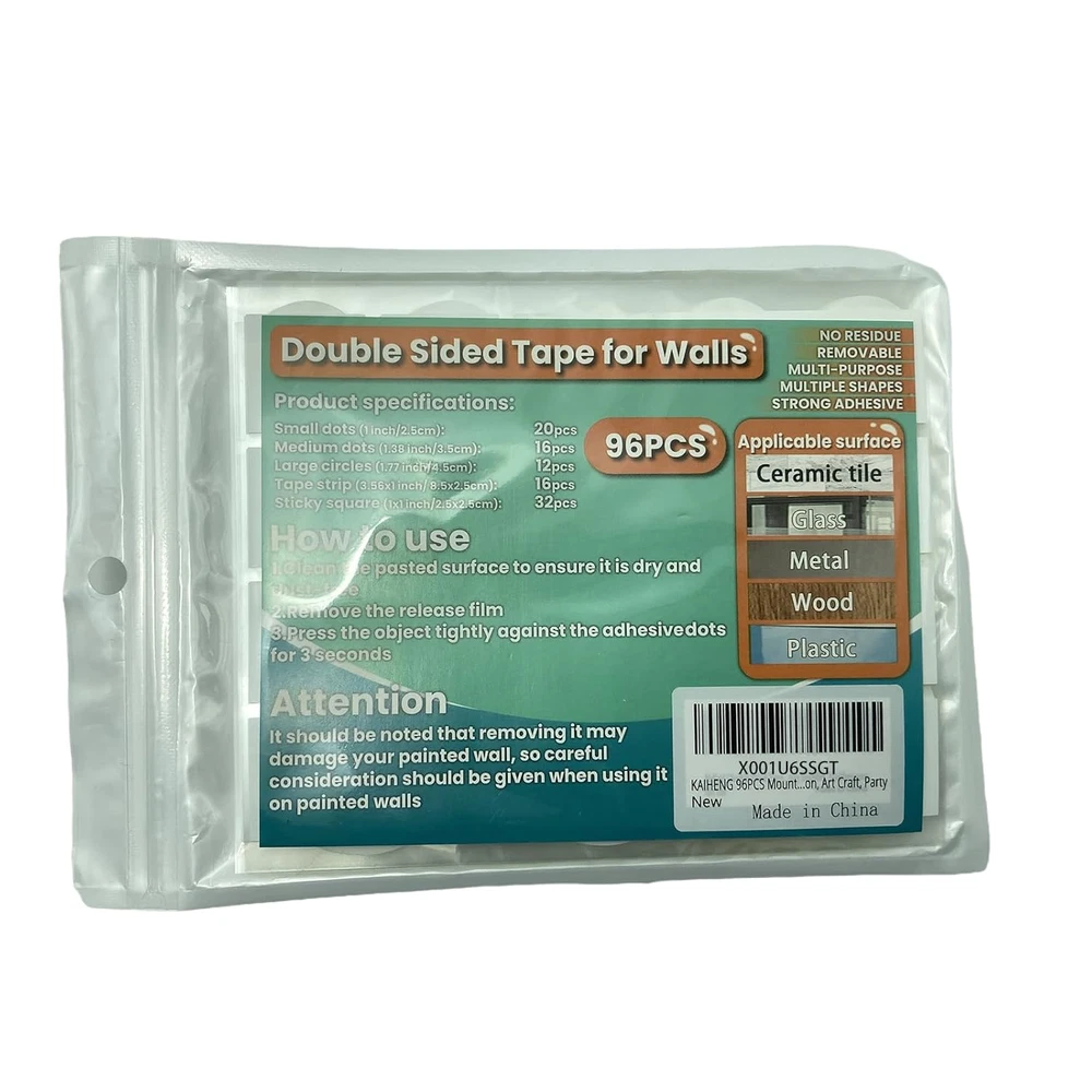 Store New Arrivals Add to Favorite View Feedback Contact 96PCS Double Sided Tape for Walls, Mounting Tape, Picture Hanging Strips Description Item model number KH-AZJL Number of Items 96 Color White Product Dimensions 7.72 x 5.28 x 0.51 inches; 4.23 ounces Material Adhesive Recommended Uses For Product Arts And Craft, Indoor Brand KAIHENG Manufacturer kaiheng 【Strong Adhesive Double Sided Tape】Mounting poster tapes are made of good adhesive material that is elastic, durable, transparent and unobtrusive. Due to its strong adhesion, it is very suitable for hanging and pasting small and medium-sized objects. At the same time, clear tapes contain various double-sided, sticky, dots, rectangles and squares shapes, which can be used in combination, so that the paste is more firm and lasting in the using process. 【No Residue】This kind of adhesive mounting dots squares are suitable for plastic, glass, metal, fabric, wood, ceramic tile and other smooth and flat surface. Note that it can't be used for wet, rough, inferior, painting walls. Removing it may damage your painted wall, therefore, careful consideration should be given when using it on painted walls as it is very sticky. 【Washable and Reusable】This transparent pre-cut wall hanging strips can be reused. You just need to rinse it with water and wait for it to dry to regain its stickiness, which is more convenient to use. 【Meet Different Demands】One package comes with 48 circles, 16 strips, 32 squares, a total of 96 PCS, which provides a strong and versatile bond for your hanging and taping needs. More importantly, different shapes, sizes and multiple quantities are available to meet different needs. 【Wide Range of Applications】These adhesive strips can be used to hang pictures, lightweight picture frames, posters, balloons, room decoration small items, carpets, can also stick art crafts, envelopes. It is essential for home, office, school, party, wedding, decoration. Product Description Double Sided Tape Multipurpose Mounting Squares Transparent It is multi-purpose, trace-free, heavy-duty removable double-sided adhesive, which is indispensable in our daily life. Leave no traces and high elasticity This adhesive mounting square is highly elastic and relatively sticky, suitable for smooth and flat surfaces, such as plastic, glass, metal, fabric, wood, tile. High elasticity and relatively strong adhesion. Strong and long-lasting adhesion This thin (0.8 mm) adhesive dot is very suitable for hanging and pasting small and medium-sized items due to its super strong adhesive force, which will not easy move after pasting and has high fixity. 1.Clean the pasted surface to ensure it is dry and dust-free 2.Press the object tightly against the adhesive strips for 3 seconds 3.Remove the release film 4.Press the object tightly against the adhesive strips for 3 seconds Removable Double Sided Tape for Walls Mounting Squares Dots This clear mounting ddhesive strips mainly use to stick balloons, hang pictures, posters, banners and some light items for party and room. It can also be used to fix mouse pads, tablecloths, and table small decorations. In addition to that, it's also great for crafts, sticking cards, making envelopes, and more! 1. Question: will these work for sticking objects to the wall? Answer: These double sided tape very useful to sticking objects to the wall, simply follow the instructions - no painted walls and no surfaces that are rough, wet inferior, or damaged. In the same way, objects that stick to surfaces should be flat, smooth, and clean. It has been lasted one month without problem. To be more effective, items that are slightly larger and heavier, it is suggest that to sticky more tapes. 2. Question: Is it still sticky when rinse these off with water and can it still be used? Answer: You could rinse these off with the water, and in a few minutes it can still sticky again. It works well. Have to say you need to wait for these mounting tapes to dry when using, as they are not sticky while wet. By the way, they regain 75% of its original stickiness even though repeated rinsing. 𝟑. Question: Are these work better than foam style mounting tapes ? Answer: Thinks this style works better than foam style ones. As these sticky tape are precut and comes in many sizes(circles, stripes and squares), which can choose the right one based on the objects and where it is stick. In addition to this, since this adhesive tape is not too thick, it can make the items more flush against the wall, which is more practical. 𝟒. Question: It is suitable for decorating party and doing crafts ? Answer: Hanging strips perfect for these. can use them for sticking balloons, photos, and also for making adhesive flowers and cookies, and they stick firmly. All my decorations are easy to remove without damage the walls which think is so great. Note:Needless to say, it is not suitable for sticking too heavy objects, and valuable objects. Items with a little weight need to be attached with multiple stickers or mounting dots for better fixation. ABOUT US We offer the best prices around on high quality products. Our E-store includes media such as books, movies, music and games while offering electronics, toys, sporting apparel, clothing, tools, general home, garden items and more. SHIPPING We are always working hard to ensure your package arrives as soon as possible. Please understand that some factors like weather, high postal traffic, and the performance of shipping companies are outside of our control. We offer free shipping to the lower 48 states and ship within 2 business days of payment, usually sooner. We do not accept P.O. Boxes. Please provide a physical address. RETURNS We offer a 30-Day Return Policy on items which you are not completely satisfied with. You have the option for a full-refund or an exchange of the item. No returns are available on items shipped outside of the USA. PAYMENT We accept PayPal. CONTACT US This page content is yet 