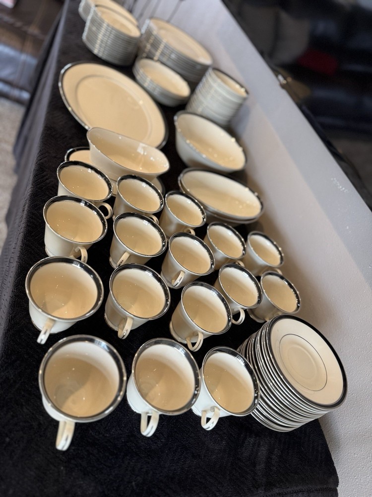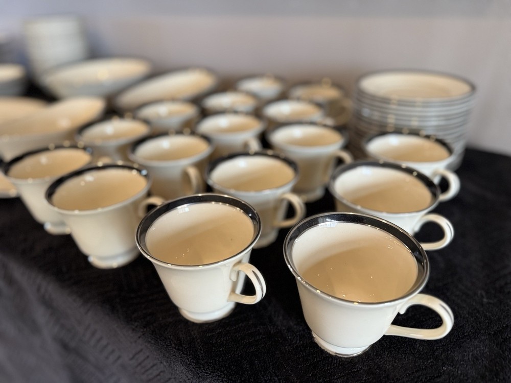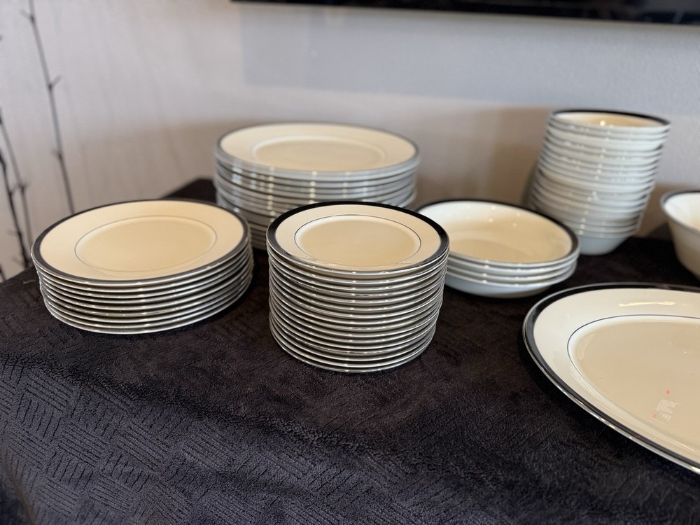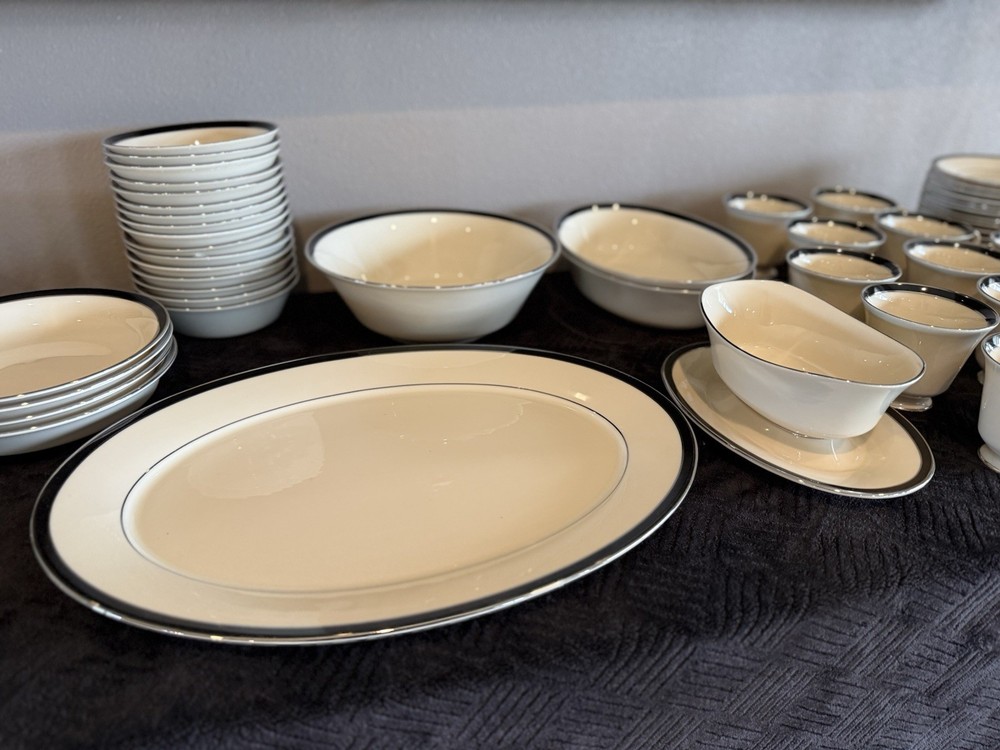 This 97 piece Black Royal Lenox Fine China Dinnerware Set is a luxurious addition to any dining table. Made in the USA with bone china material, this round set includes dinner plates and features a glossy black finish. With a printed backstamp and art pottery production style, this set is perfect for all occasions and adds a touch of elegance to your table setting. In like new condition, includes zippered containers for storage.