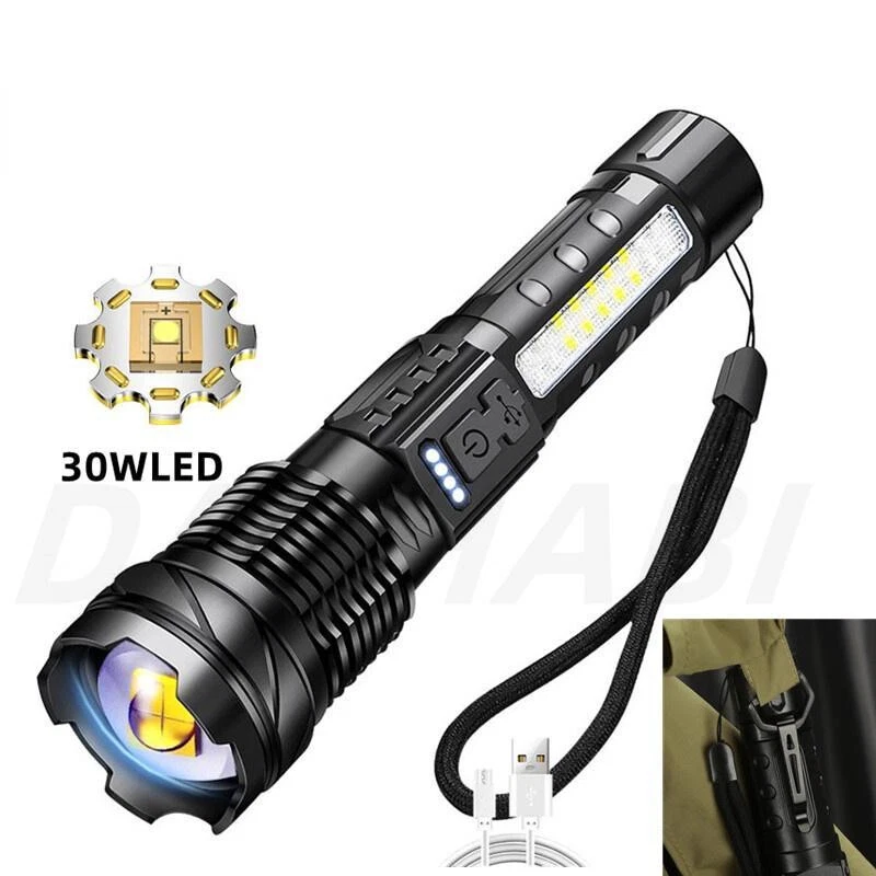 Product Description Bead Type: 30W LED+18LED (10*LED white+4*LED red+4*LED blue) Product Size: 16.5*4.1*2.8CM Net weight: 132G Product Material: Aluminum alloy + ABS Switch Type: Push switch Battery Capacity: Built-in 2600 mAh 18650 battery Charging mode: Type-C USB charging, using rechargeable batteries, can be charged through the USB cable (included), low-light mode can be used for 6 hours Switch gears: Main light 3 gears: strong light - low light - flash Long press to switch to the side light 10 * LED strong light Side light 5 speeds: 10 * LED strong light - 10 * LED low light - 4 * LED red light - 4 * LED red light + 4 * LED blue light alternately flash There are various working modes for you to switch freely to meet your different requirements for lighting. Zoom mode: Telescopic zoom Waterproof Rating: IPX4 life waterproof, the flashlight body is made of high quality splash-proof aluminum alloy to ensure that it can be used even in rainy days, suitable for outdoor use. Product Lumens: About 800 lumens Product range: about 1000-1500 meters Product Features: Strong light far shooting with side lights Electricity display with a tail rope with a pen clip easy to carry Three kinds of light sources to meet a variety of scenarios Charging instructions: four blue LED power indicator Charging time: about 2 hours Discharge time: about 5-6 hours Package Includes: Flashlight + tail rope + USB charging cable