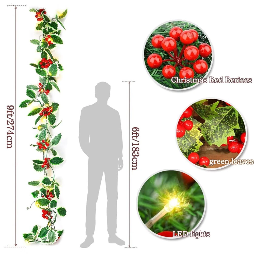 2024 Lighted Christmas Garland,Christmas Decorations,holiday and New Year decor.Christmas porch decor,Fireplace christmas decorations 9FT Lighted Christmas Garland: The Christmas mantle garland measures 9ft long, with individually crafted branch tips, decorated with warm white LED lights, red berries and green holly leaves, create a lively feel to your holiday and New Year decor. Light Up Your Christmas: This cute Christmas garland lighted with LED warm white lights among the leaves create a glowing nighttime display. Illuminate your home for enjoy all shine to create a festive and enjoyable Christmas atmosphere. Battery Powered : Operated by 3 AA batteries (not included) to give a long-lasting brightness. No trouble with mess extra wires and worry about there is no plug nearby. The battery case is not waterproof, please keep away from water. Widely Christmas Decorations: For indoor and covered outdoor use. These beautiful natural-looking garland decorations add elegance to any party, home, classroom, or office. Perfect for Christmas party, wedding, bedroom, garden, balcony, swing stand, shopping malls, mantels, doors, table centerpiece and covered front porch staircase and many other decorations Easy to Use: The lighted garland comes pre-assembled to save you time and effort. The lightweight construction of the garland also makes it easy to handle and hang. You can easily place it on your front door, mantelpiece or anywhere else you like. The flexible garland allow you to adjust the shape and arrangement to suit your taste.