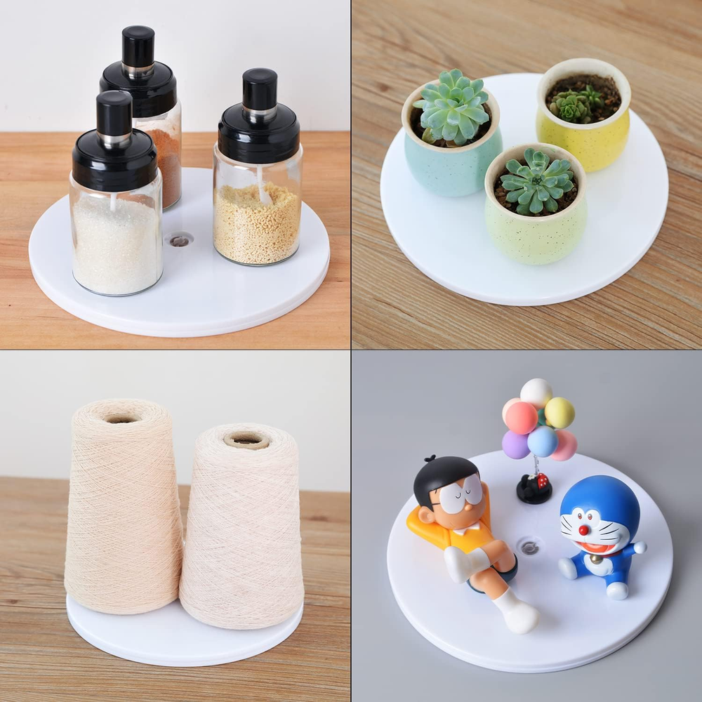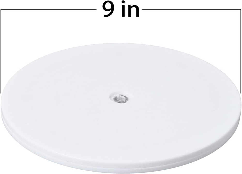 【Package Includes】: 1pcs Lazy Susan Turntable (9 Inch), Swivels 360°, Color: White. 【Lazy Susan Turntable Easy to use】: Ball bearing raceway for smooth rotation, Take these lazy susan organizers for a spin. Eight steel ball bearings provide the round lazy susan turntables with smooth 360-degree rotation in both directions. 【Acrylic Lazy Susan Turntable】: Lazy Susan Turntable Supports up to 50-lb, Steel ball bearing for rotation long lasting. 【Premium Quality Material】: Made of durable acrylic. Non-skid surface on turntables is molded into the platforms for durability and easy to clean. 【Lazy Susan Turntable Multifunctional】: Multifunctional Could be used as lazy Susan, turntable, spice organizer, TV stand, cake decorating, displays, bathrooms, heavy plants etc, Organization has never been easier. Lazy Susan Turntable Specification: Size: 9 Inch color: White Material: Acrylic Number of Items:1 Multiple Uses: Made of Acrylic, durable and sturdy, super ideal forstand small parts, Ceramics, Figurines, Jewellery Stands, TV stand, cakedecorating, displays, bathrooms, heavy plants, Electrical Items, etc. Load Capacity: 9 inch lazy susan with strong load-bearing can supportup to 50-lb. Rotates 360 degrees for easy access. 360 Degree Display: Use this heavy duty rotation base to display yourproducts in shop windows, super stores, exhibitions. Smooth Top and Bottom: The smooth top and bottom surfaces with no lip makethese turntables ideal for larger items that may hang off the edge slightly. Clean Look - No Mounting Holes: With no mounting holes, these turntables provide a niceclean look. The one center hole is for rotation only and not designed for usewith screws. Easy-glide: Platform rotates/swivels for convenient use and betterlongevity, easily rotate the house plants for even sunlight.