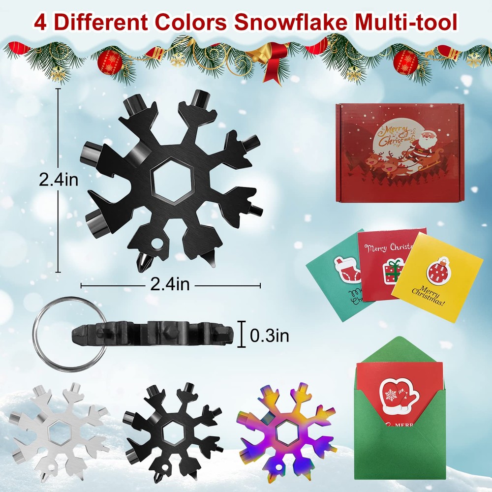 18 in 1 JOLLY SNOW SNOWFLAKE MULTITOOL:Each snowflake tool has more than 18 uses,such as hexagon screwdrivers,wrenches,slotted screwdrivers ,phillips screwdrivers of different sizes.It can be also used ,Bottle Opener, Box Cutter,Rope Cutter,Gift Hanging Drop,etc. SMALL SIZE& KEYRING DESIGN: Our snowflake multi tool is Pocket Size.It just over 2.5" in diameter.It is so easy to be taken along.Because snowflake tool comes with a key ring that can be hung on a key or backpack.Key ring is designed to avoid the possibility of loss. MULTIPLE USES: One snowflake tool to unlock for multiple purposes.One snowflake multitool can be used to open the beer bottle,turn the screw,fix snowboarding,bicycle,Toys and more.It can be also used to open the carton, hung on the key or backpack. Hang on the Christmas tree for decoration or as a gift.When camping,rescue,boarding also be used. BEST CHRISTMAS GIFT: You will get 9 x multi-tool,9 x key rings,1 x Merry Christmas gift card,1 x gift box.It is an excellent gift for Christmas gifts.It's a good choice whether it's for Christmas decorations or as gifts. STURDY&DURABLE:Snowflake tools 18-in-1 multi-tool is made of high quality stainless steel,exquisite workmanship.It is so sturdy and durable.Unique snowflake shaped design.Combine function and design in our compact multi-tool. Practical and beautiful.
