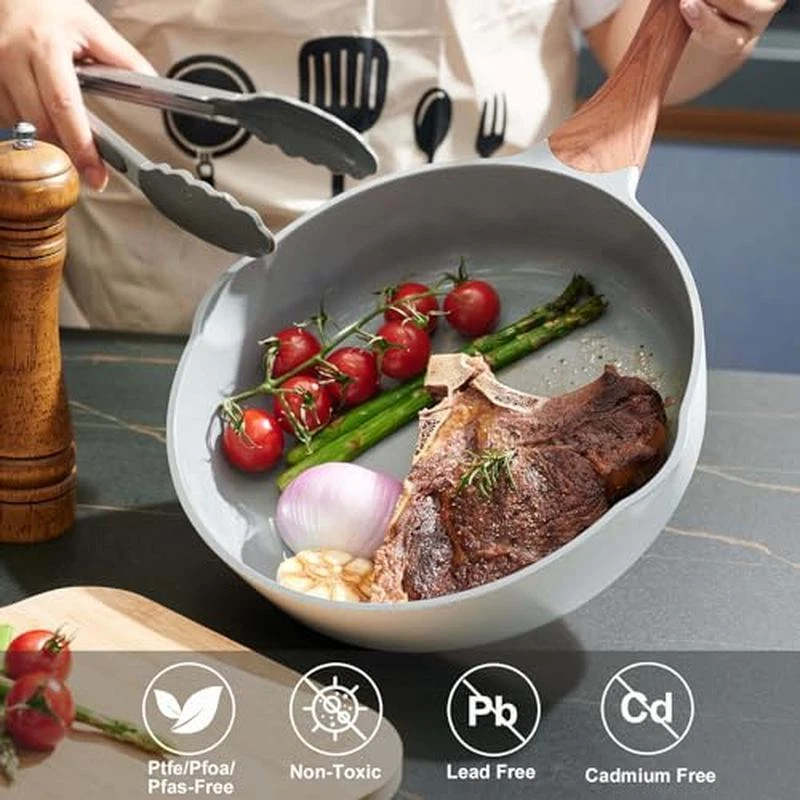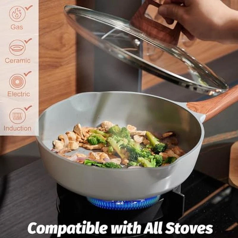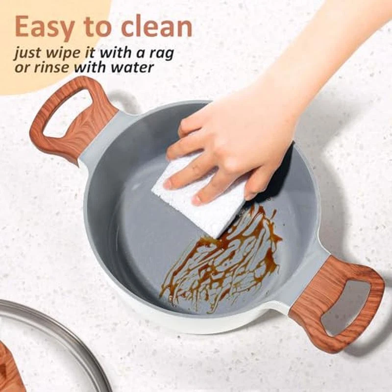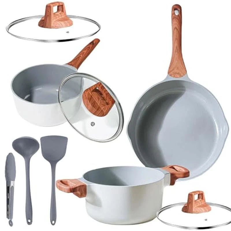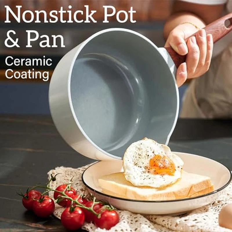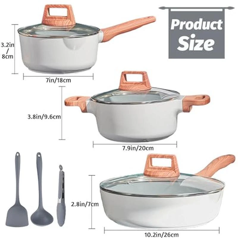 About this item 【Toxin-free non-stick cookware】- SC Cooker cookware is approved by SGS . When you buying our product , Please make sure that it clearly indicates that it is lead,cadmium PFOA-free. You don‘t want to have in your cookware because of their potential health dangers. Fortunately, you can get SC Cooker cookware that is free of these harmful chemicals. 【SC Cooker 9-Piece Cookware Set】- Includes 10 inch Frying Pan with Lid, 2 QT Saucepan with Lid, 2. 7QT Stock Pot with Lid, spoon, spatula and ladle. Our favourite non-stick pots and pans set meets all your needs for everyday cooking. 【Nonstick Cookware Pot】- When buying SC Cooker cookware, The most important things is nonstick capabilities. The ceramic coating do a good job in preventing food from sticking. SC Cooker non-stick cookware has been wear-tested 30,000 times. 【Health & Eco-friendly】Also, you'll be able to cook healthier meals for your family since you won't have to use as much oil. Clean up is a breeze, just wipe it with a rag or rinse with water. Dishwasher safe, hand washing recommended to preserve the nonstick. The nonstick surface makes cooking with little oil for healthy diet, the saucepan can help you solve stick and difficult to clear problem. CO2 emissions can be reduced. This sauce pans for stove top is ECO Friendly. 【Even and Quick Heating】Suitable for Compatible Induction-The base if flat, suitable for all stoves and heats evenly on induction, electric, gas, ceramic and halogen stoves. But Not suitable for Oven. Material:Aluminum Color:White Size:26-18-20cm Handle Material:heat resistant bakelite
