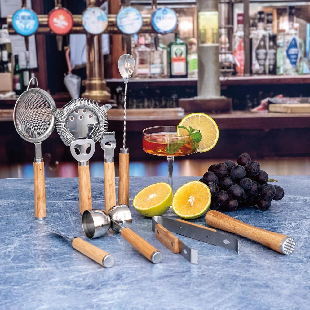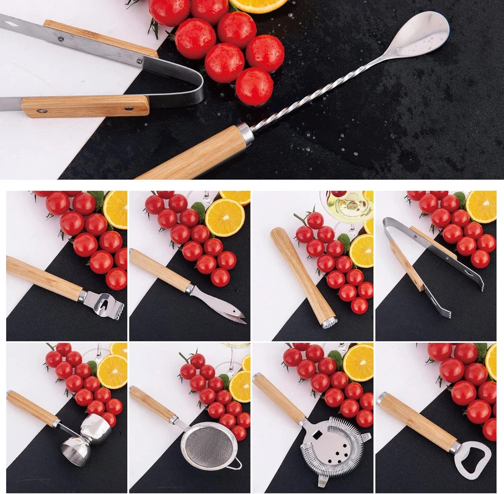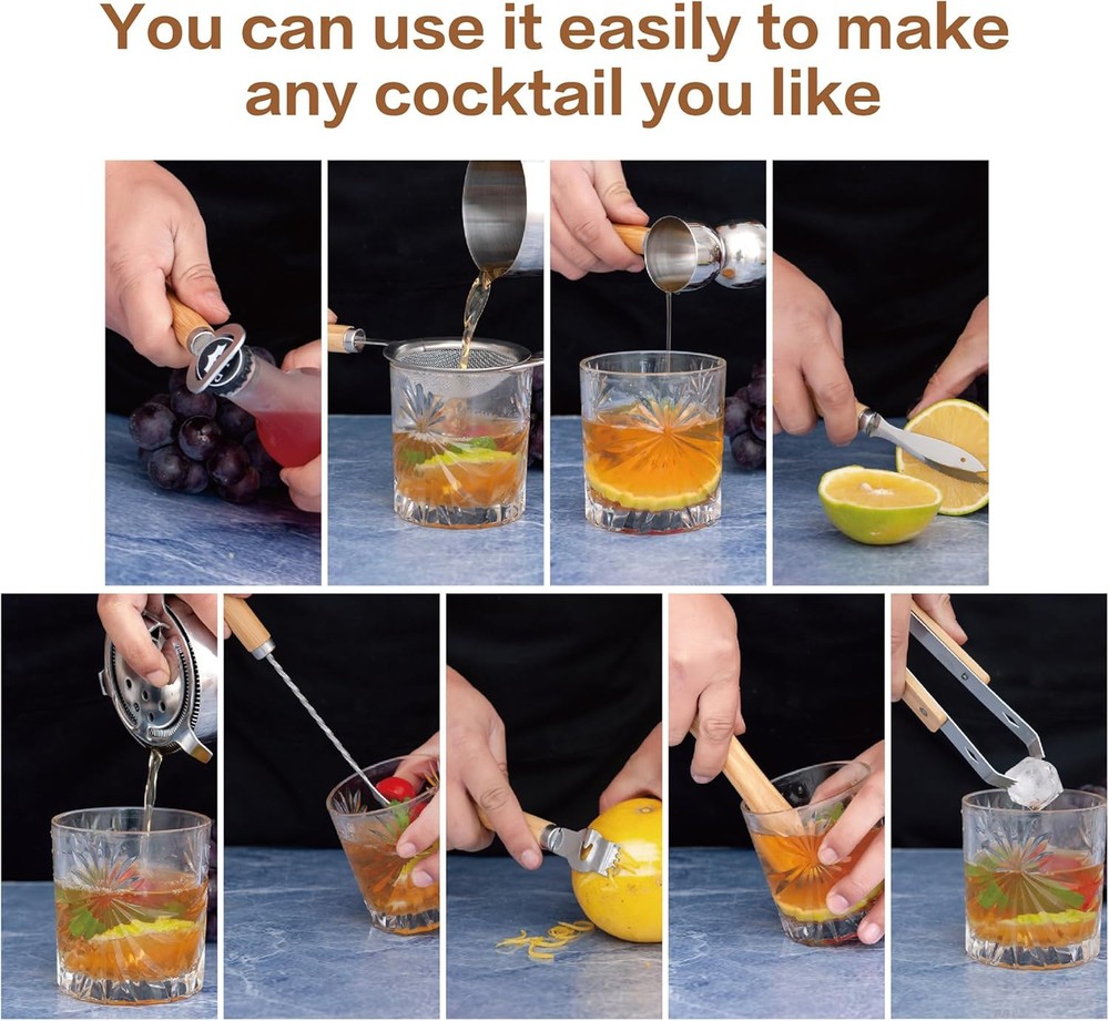 Bartender Kit 9-Piece Bar Tool Set Cocktail Shaker with Wooden Product Details Material: Wood, Stainless Steel Brand: JNWINOG Color: Wooden Included Components: Cocktail Shaker, Jigger, Ice tongs, Muddler, Bar Spoon Number of Pieces: 9 Manufacturer: JNWINOG Package Dimensions: 10.43 x 4.69 x 3.82 inches Item Weight: 1.15 pounds Item model number: Wooden Tools Finish types: Stainless Steel Care instructions: Hand Wash Assembly required: No Batteries required: No 【9-Piece Bar Tools Kit】This bar tool set accessories consists of a 0.68oz & 1.35oz Jigger, a strainer, a bar spoon, a muddler, a ice tongs, a bottle opener,a Cheese Knife, a lemon Peeler, a Fine Mesh Strainer, It has all the bar accessories and is great for making many cocktails, so you can become a professional bartender to lay the foundation. 【Stainless Steel Bar Tool Set】Our bartender kit is made of thickened Durable 304 stainless steel material and wood to protect from rust and leak for a lifetime,easy to use and clean.Bartender Accessories is very easy to clean by hand with warm soapy water and keep their shine with ease, Adding modern art to your home bar. 【UNIQUE WOODEN HANDLE DESIGN】All of our wooden 9 piece bar tool set are designed with brand new wooden handles, which feel better in your hand when you use them, insulate against heat and freezing, make your home bar more beautiful and stylish, addding a modern, sophisticated touch. 【Novel gift ideas】If you have Someone with a passion for bartending around you, then this will be a perfect gift for them! You can use it as an exquisite gift for any occasion such as birthday, Christmas, Valentine's Day, Father's Day, Mother's Day, wedding, anniversary, housewarming! 【Risk-free Purchase】We will provide you with a full range of services and the best support, if you have any questions about our products. Please tell us at the first time, we will help you solve any related problems within 24 hours.