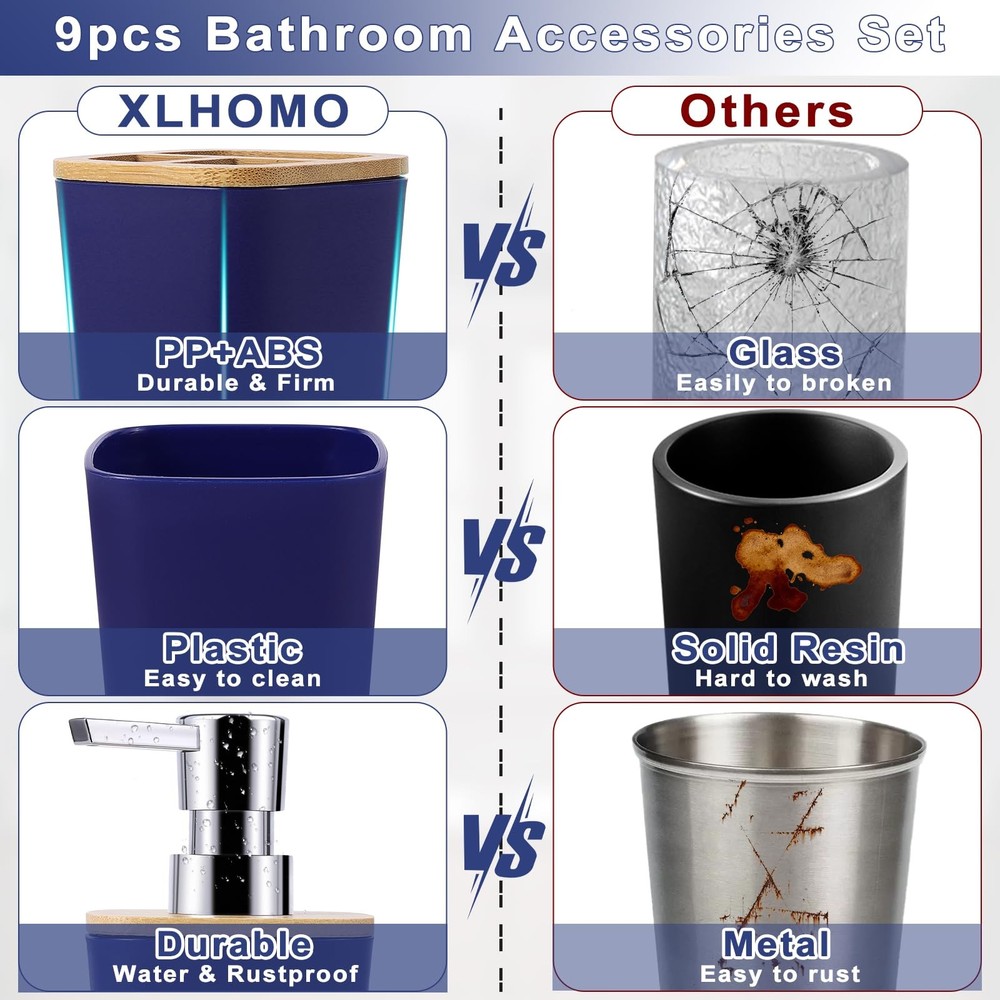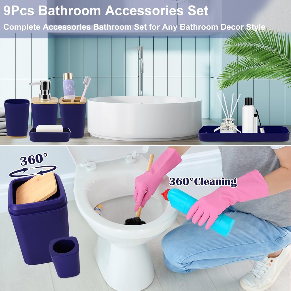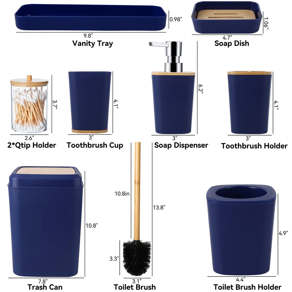 Bathroom Accessories Set, 9 Piece Navy Blue Bathroom Accessory Set with Trash Can,Toothbrush Holder,Toothbrush Cup,Lotion Soap Dispenser,Vanity Tray,Soap Dish,Toilet Brush,Qtip Holder 9 PIECE BATHROOM ACCESSORIES SET: 9 pieces bathroom accessories set complete, including 1*toothbrush holder, 1*toothbrush cup, 1*lotion soap dispenser, 1*soap dish, 1*toilet brush,1*trash can,1*Vanity Tray,2*Qtip.The uniform style makes the bathroom more beautiful, which is the ideal choice for modern home. STURDY MATERIAL: Light perple bathroom accessories set is made of high quality ABS+PP material, durable and not easy to damage. Compared with metal material, plastic material is not easy to rust, easy to clean, our plastic bathroom accessories will resist to constant use, keeping their look just as elegant and new over time. POWERFUL FUNCTION: ①Soap dispenser can be pressed by one finger and rebound automatically. ②Extended handle, toilet brush 360-degree deep cleaning. ③Double-layer drain design soap dish, removable, dry and easy to clean. ④Qtip Holders are perfect organizer for cotton balls, cotton swabs, floss picks. ⑤Trash can,toothbrush cup,toothbrush holder are perfect complement for Bathroom. MULTIFUNCTIONAL VANITY TRAY: Bathroom tray can make your bathroom more tidy and orderly, it can be more convenient to store and organize your various small objects, such as razors, toothbrushes, cosmetics and so on, but also can place candles, flowers and other decorations, so that your bathroom is more tidy and beautiful. MULTIPURPOSE:Bathroom accessories are perfect for weddings,housewarmings, birthdays, and baby shower gifts.Suitable for family, hotel, RV, guesthouse and other different scenes,picture the smile on their face when they receive the gift. If you need any help, please feel free to contact us. Welcome to XLHOMO bathroom world, a perfect space that combines practicality and beauty. We are proud to introduce our Fresh and Elegant bathroom sets to add a touch of elegance and comfort to your bathroom space. XLHOMO Bathroom Accessory Sets is designed to create a comfortable, convenient and clean environment for your bathroom. It not only provides a variety of functional items, but also integrates comfort and beauty into daily life.Choose us to refresh your bathroom for a pleasant everyday experience. Package including: √Trash Can √Toilet Brush & Holder √Soap Dispenser √Tumbler Cup √Toothbrush Holder √Tray √Soap Dish √2PCS Q-tip Holder Note: If you have any questions after receiving the product, you can contact our lovely service team at any time to ensure a worry-free purchase. SHIPPING Domestic Buyers - We have confidence in our products, but if you are not fully satisfied please contact us within 30 days of purchase and you will get full refund. - We ship within 3 business days of payment, usually sooner - We offer FREE shipping on all orders! - We only ship to the lower 48 states, no APO/FPO addresses or PO Boxes allowed International buyers – please note: Import duties, taxes, and charges aren't included in the item price or postage cost. These charges are the buyer's responsibility. - Please check with your country's customs office to determine what these additional costs will be prior to bidding or buying. * Order Cancellation Policy ** You can return a product for up to 30 days from the date you purchased it. 1. The seller reserves the right to cancel the special case only due to eBay cancellation fee. 2. The decision of seller is the final. 3. The seller will respond to the cancellation request within 2 business days. Please wait for the result of cancellation. 4. In case the cancellation is not completed by some reasons, the buyer can follow the options below to get the refund. 4.1 The buyer can reject the item when it arrives. 4.2 The buyer can send the item back to the seller within 30 days If the buyer receives item (USA Shipment ONLY). The seller will provide the FREE return label to the buyer when the buyer opens " Return Item" case on eBay by using the reason as "Change my mind" ONLY. 5. When buyer has placed the order. The order will be processed and completed by automatic warehouse system within 5 minutes. In case that buyer sends the cancellation request after 5 minutes of placing the order, the request will be rejected. **Sending direct message to cancel the order is not allowed for every case.* Return Policy For the return case - If buyer would like to return the items for refund or replacement, please CONTACT SELLER to receive the free return label from seller. The refund or replacement will be processed with the tracking number of return label which is provided by seller only. The other ways of return which are not approved by seller will not be processed for the refund or replacement.